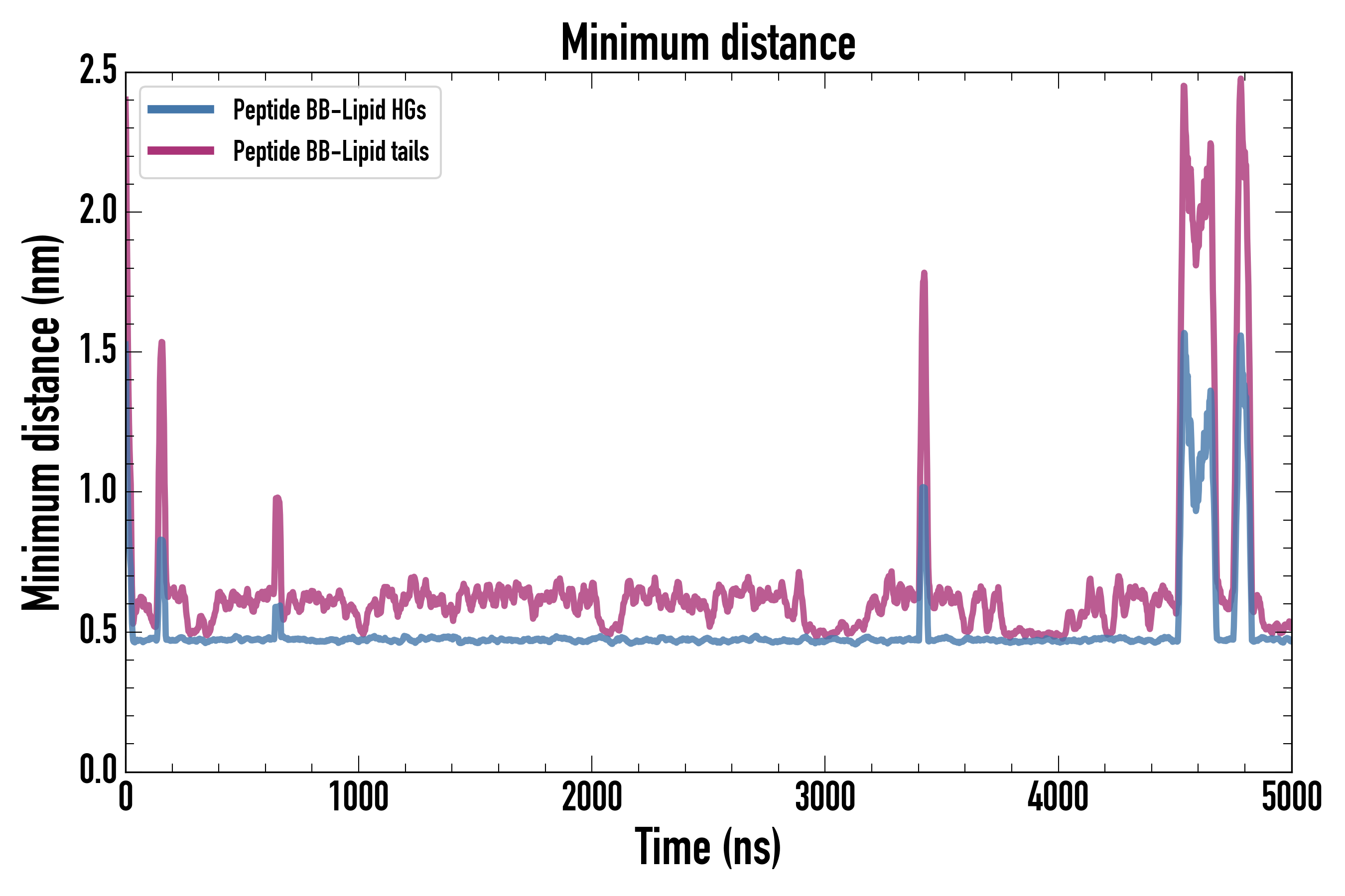 Number of contacts between each residue of the peptide backbone and the different lipid types, averaged over the last microsecond and using a cut-off of 0.6 nm.