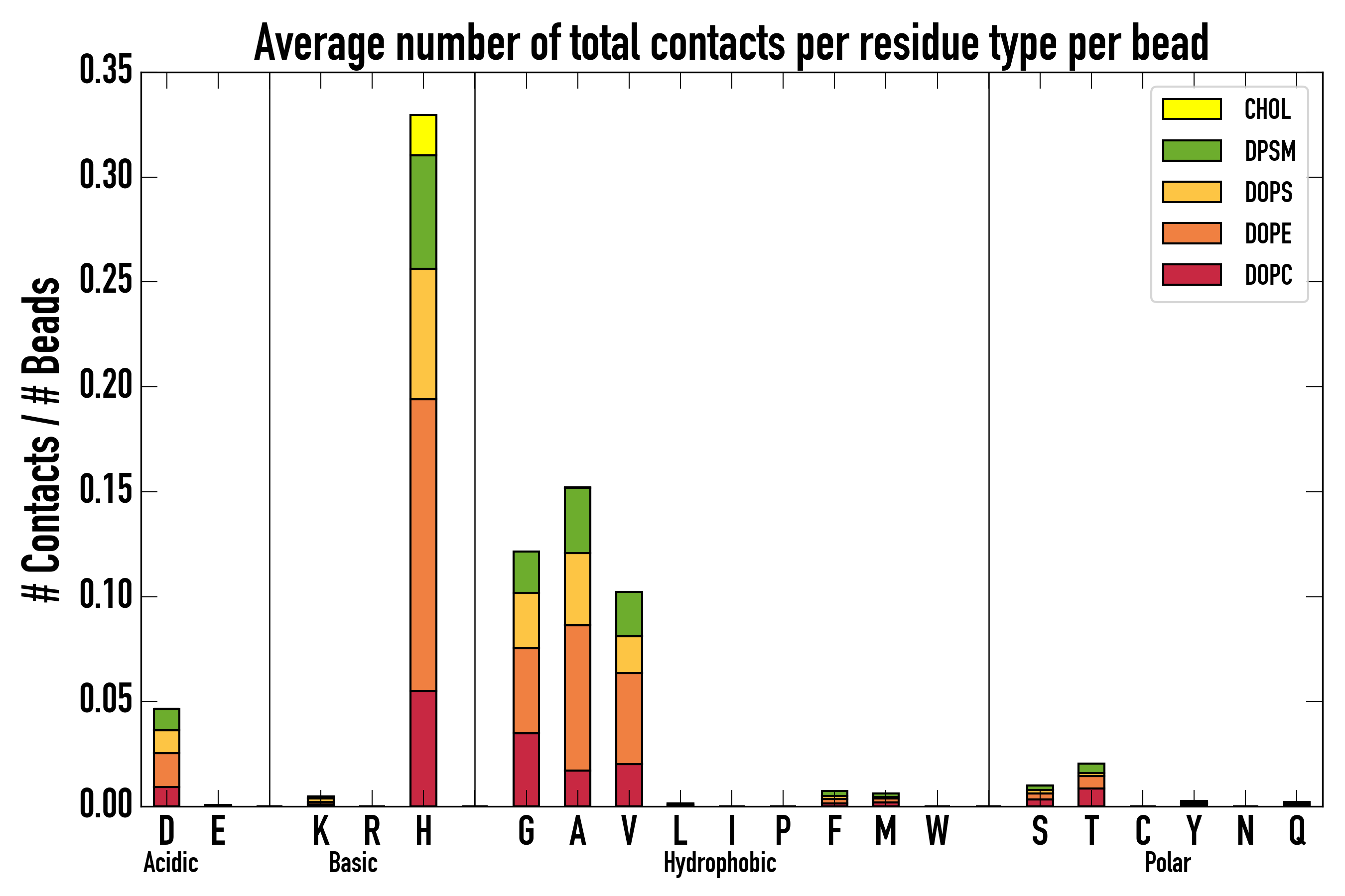 Number of contacts between each residue of the peptide backbone and the different lipid types, averaged over the last microsecond and using a cut-off of 0.6 nm.