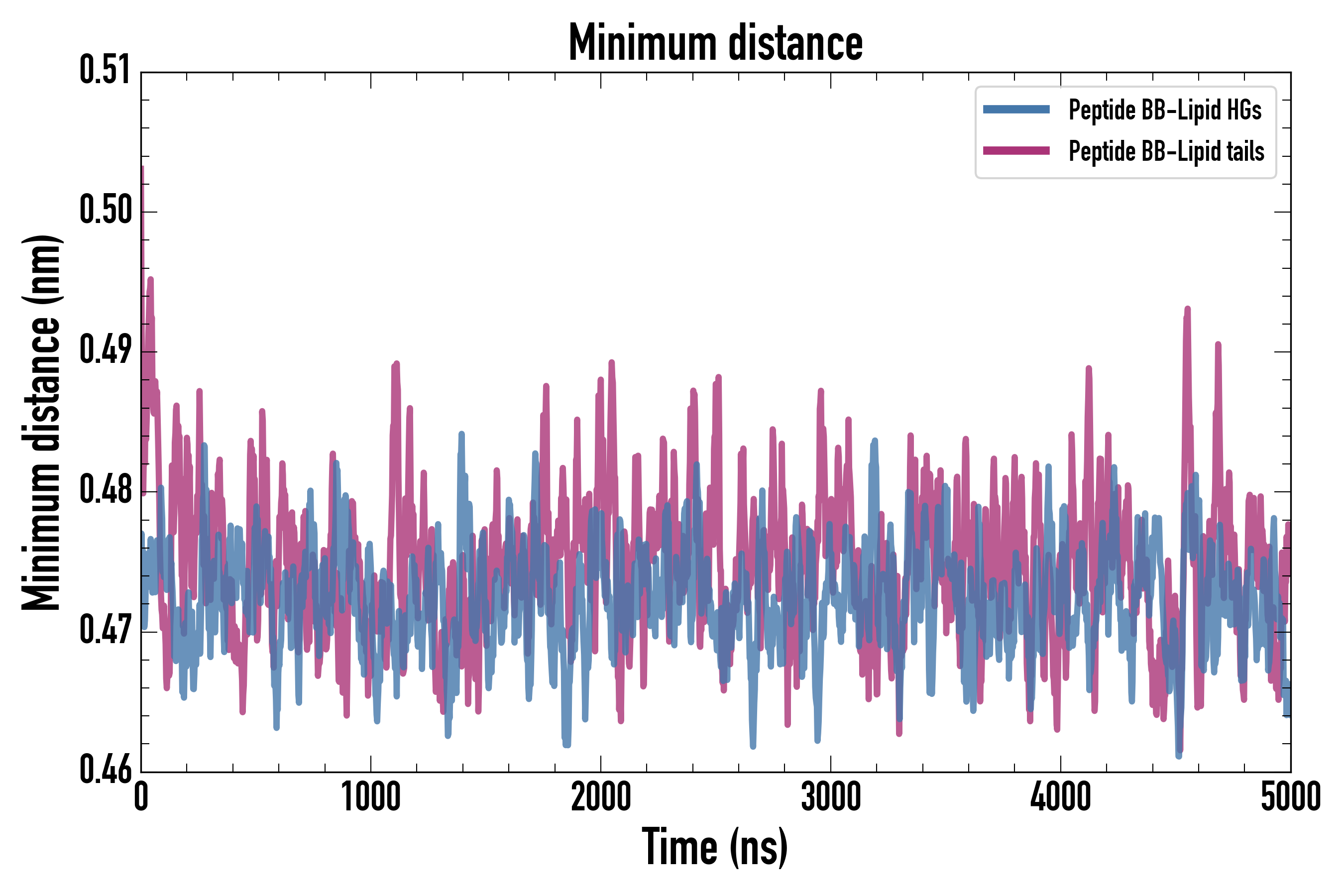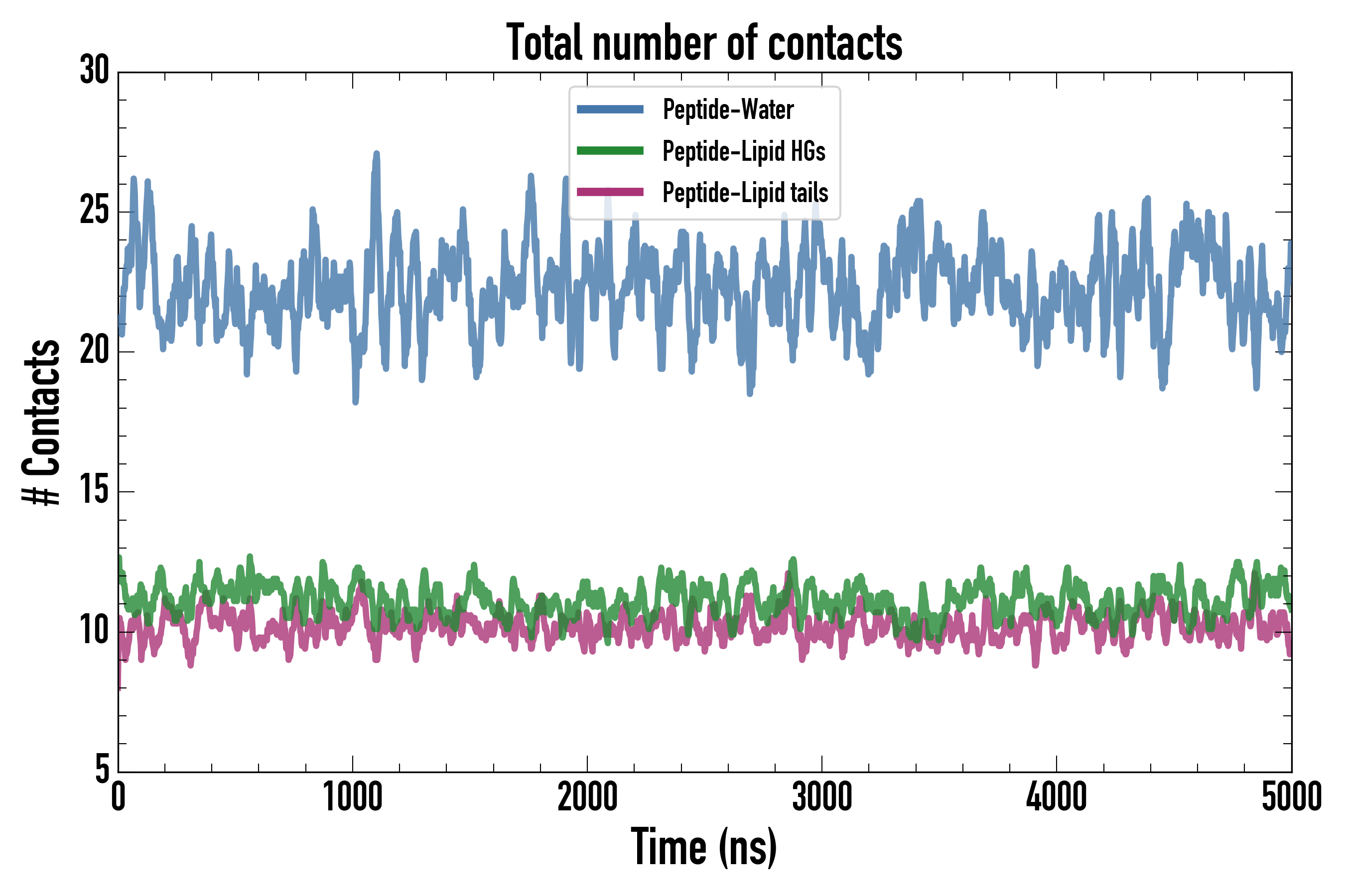 Number of contacts between each residue of the peptide backbone and the different lipid types, averaged over the last microsecond and using a cut-off of 0.6 nm.