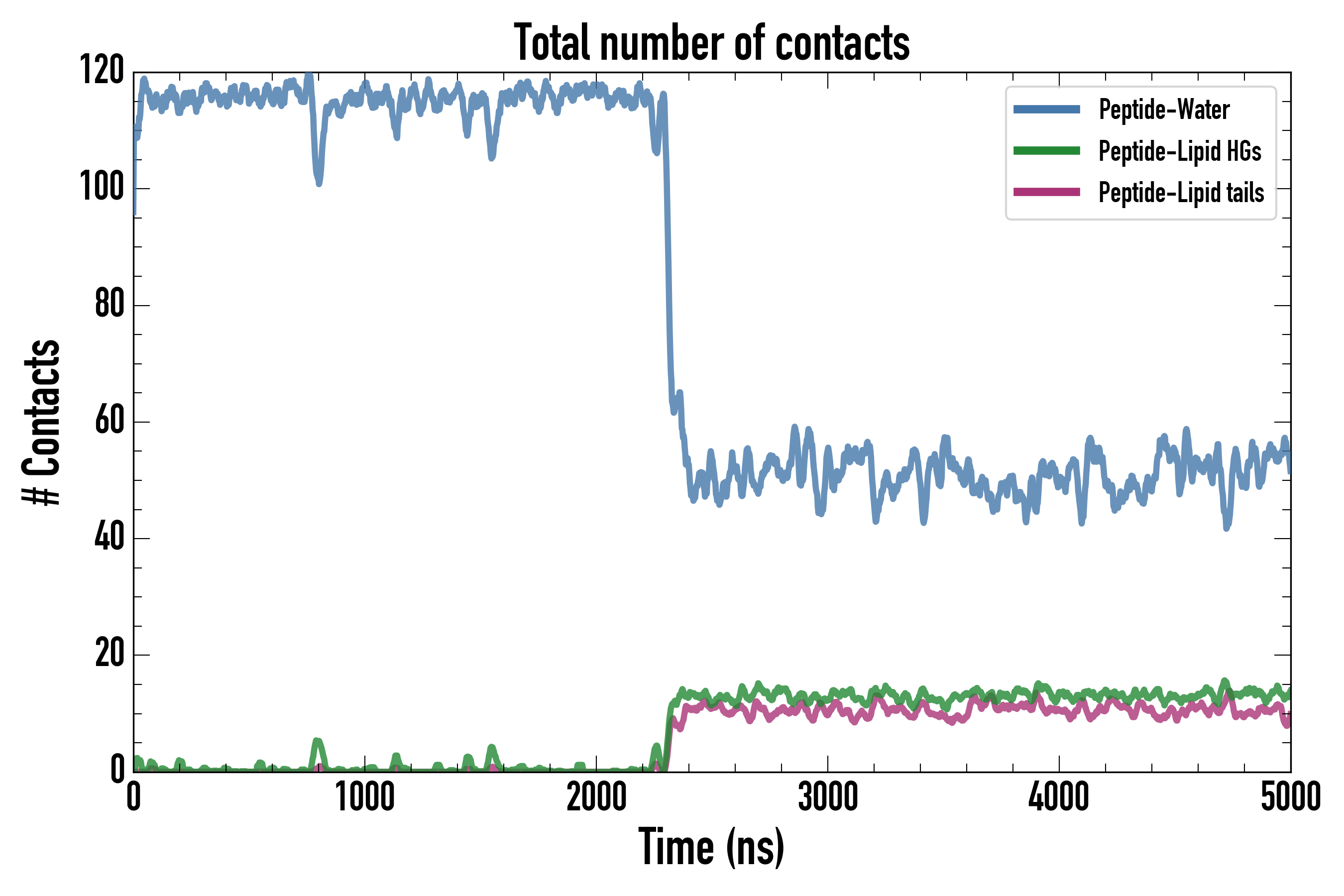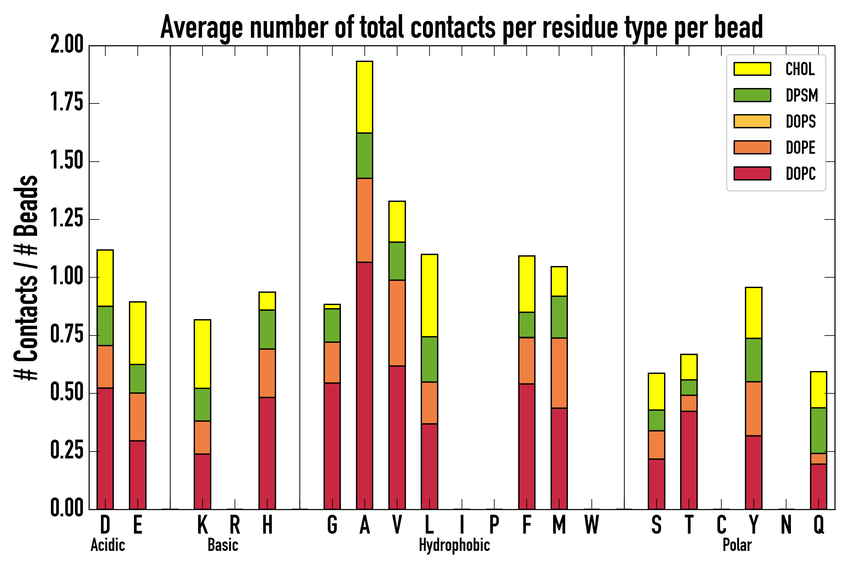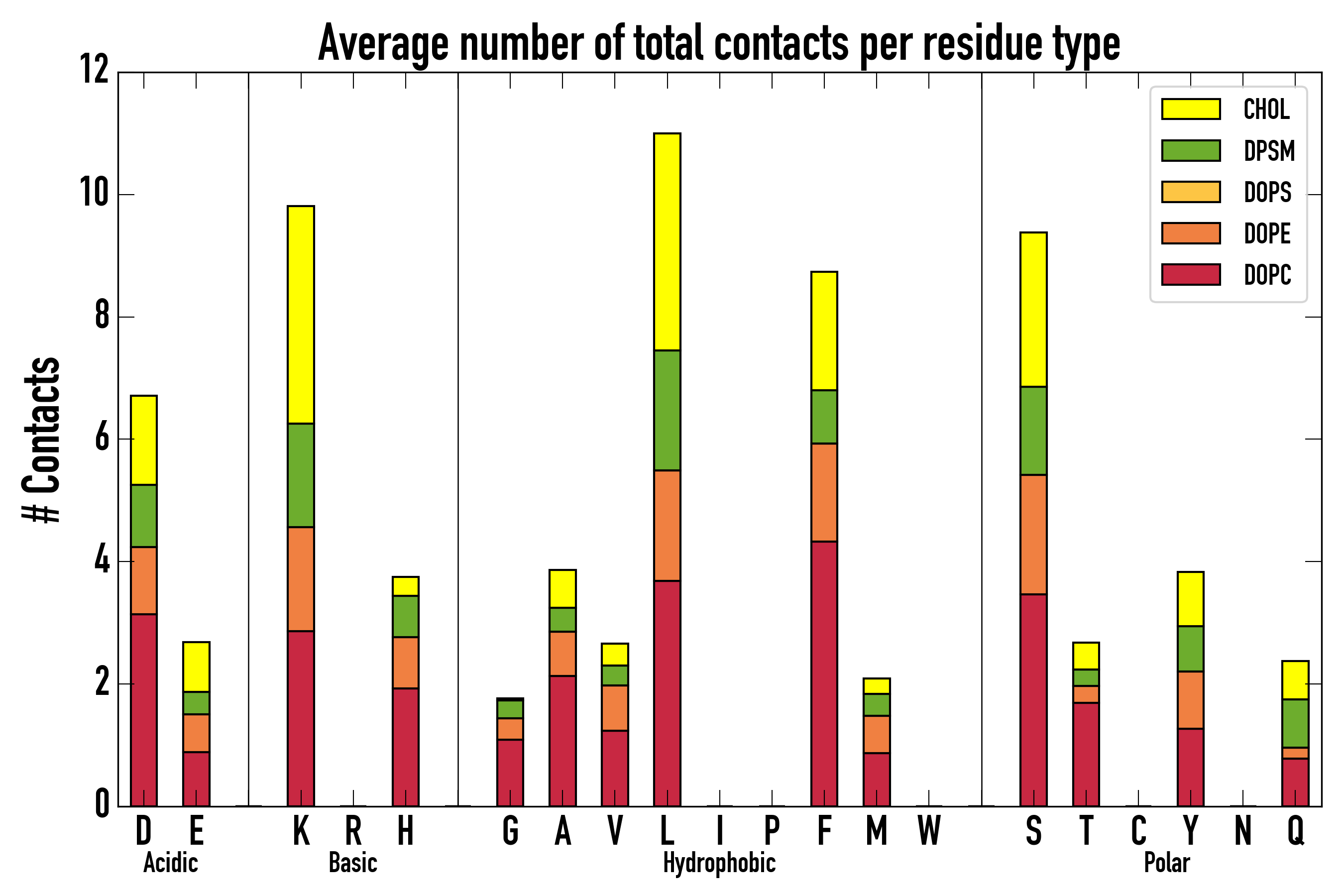 Number of contacts between each residue of the peptide backbone and the different lipid types, averaged over the last microsecond and using a cut-off of 0.6 nm.