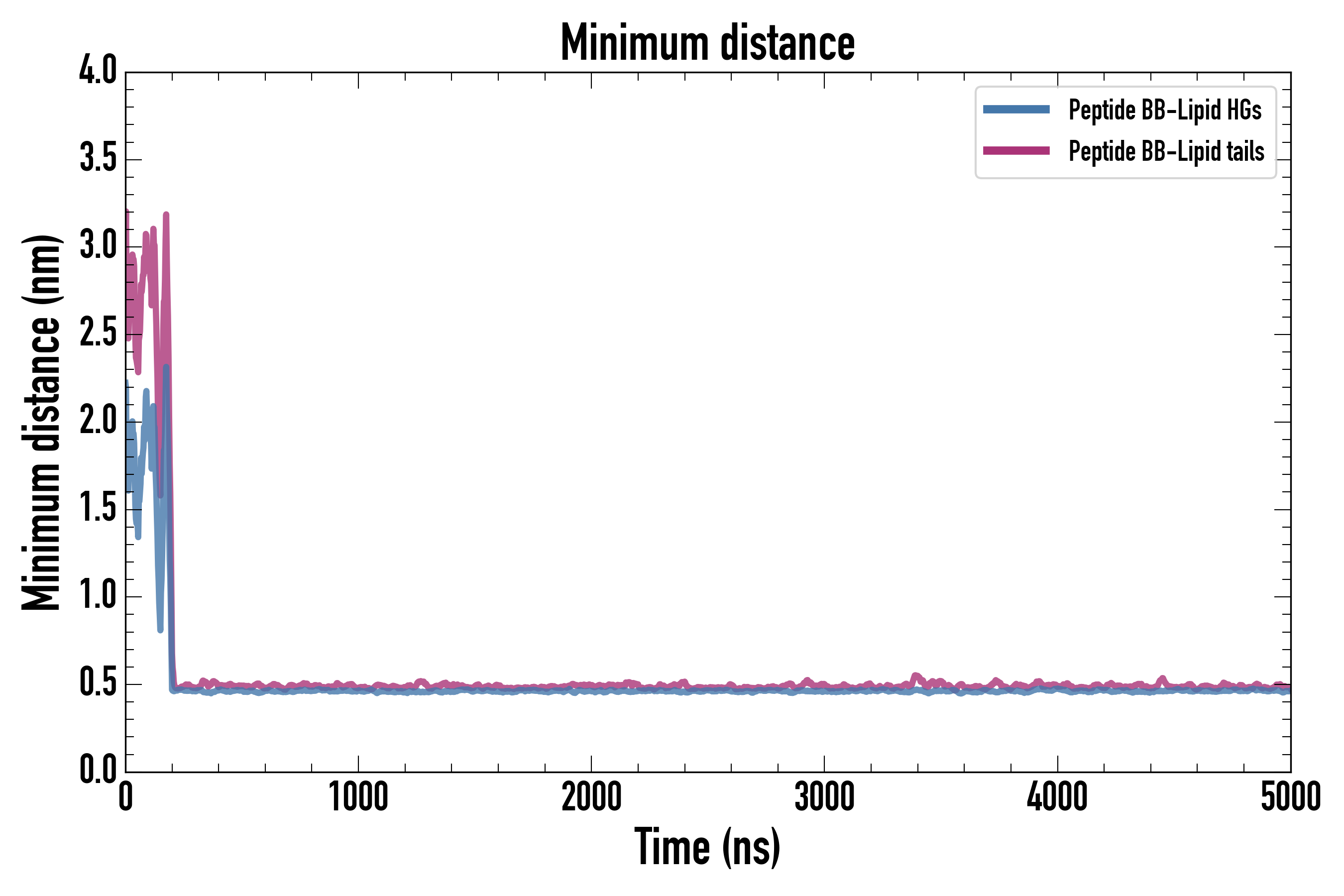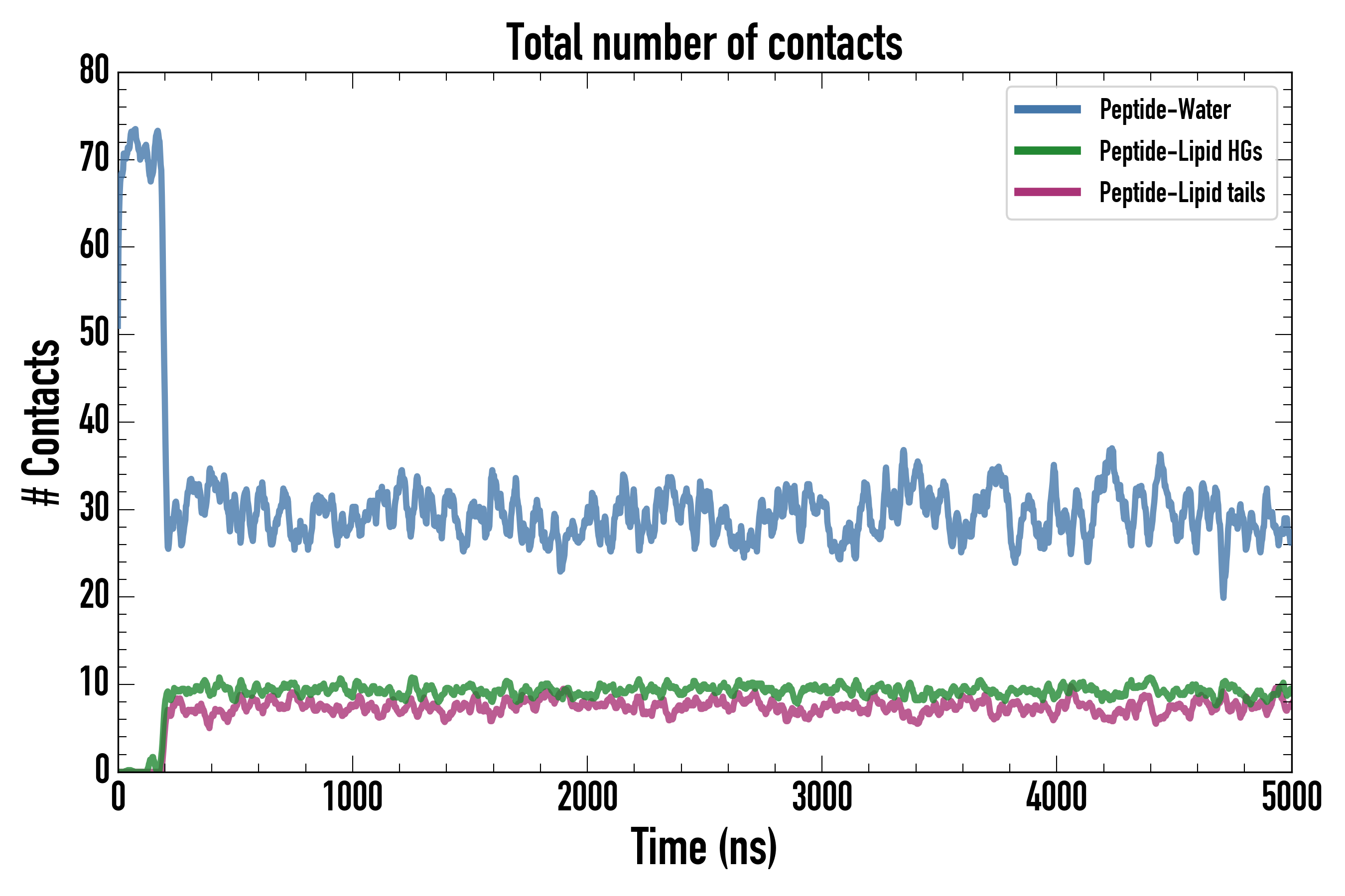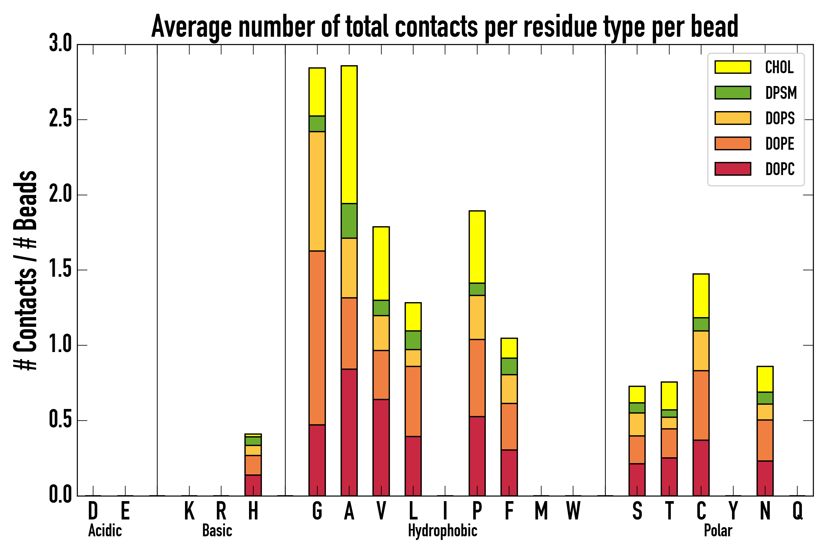 Number of contacts between each residue of the peptide backbone and the different lipid types, averaged over the last microsecond and using a cut-off of 0.6 nm.