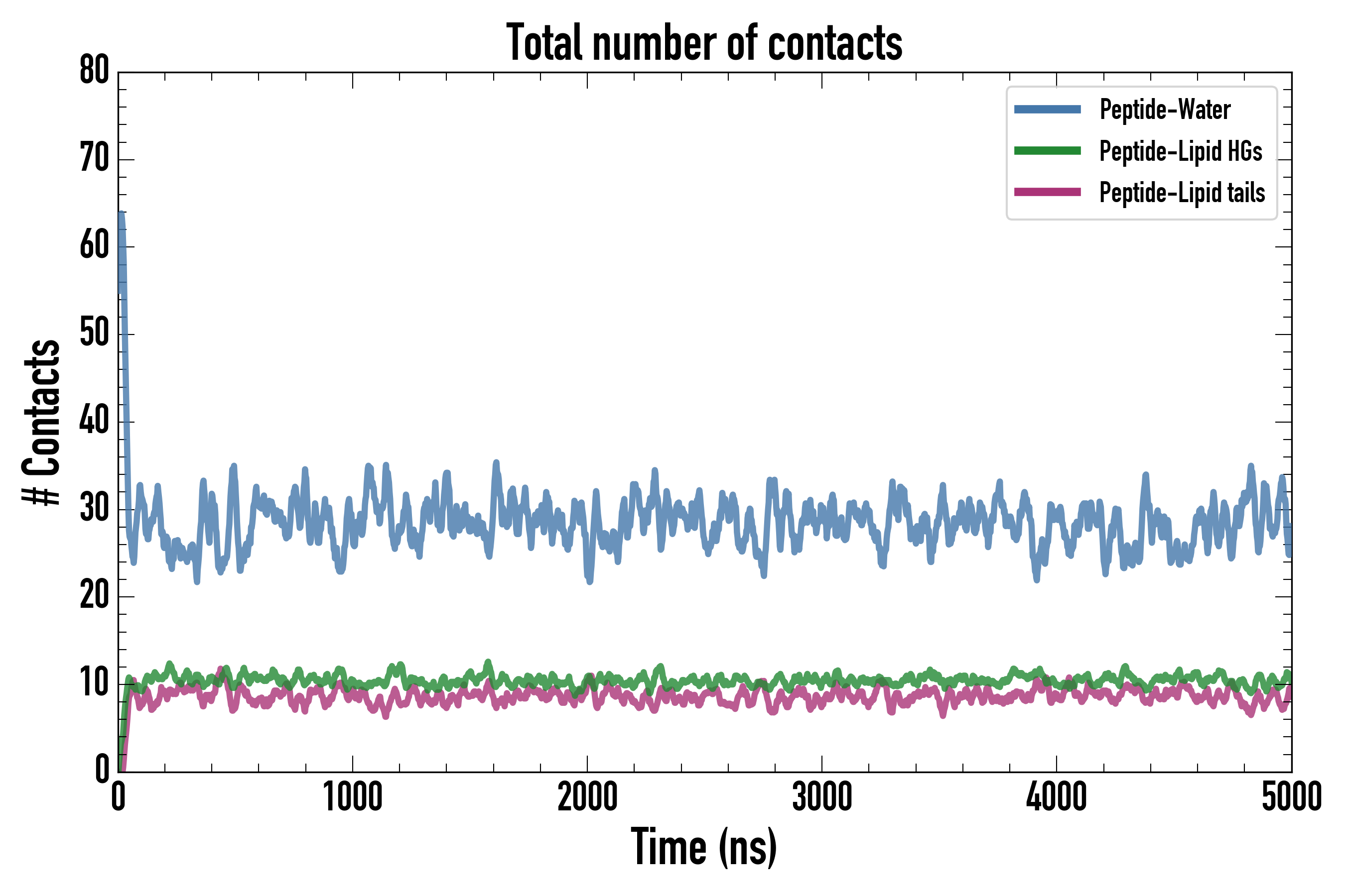 Number of contacts between each residue of the peptide backbone and the different lipid types, averaged over the last microsecond and using a cut-off of 0.6 nm.