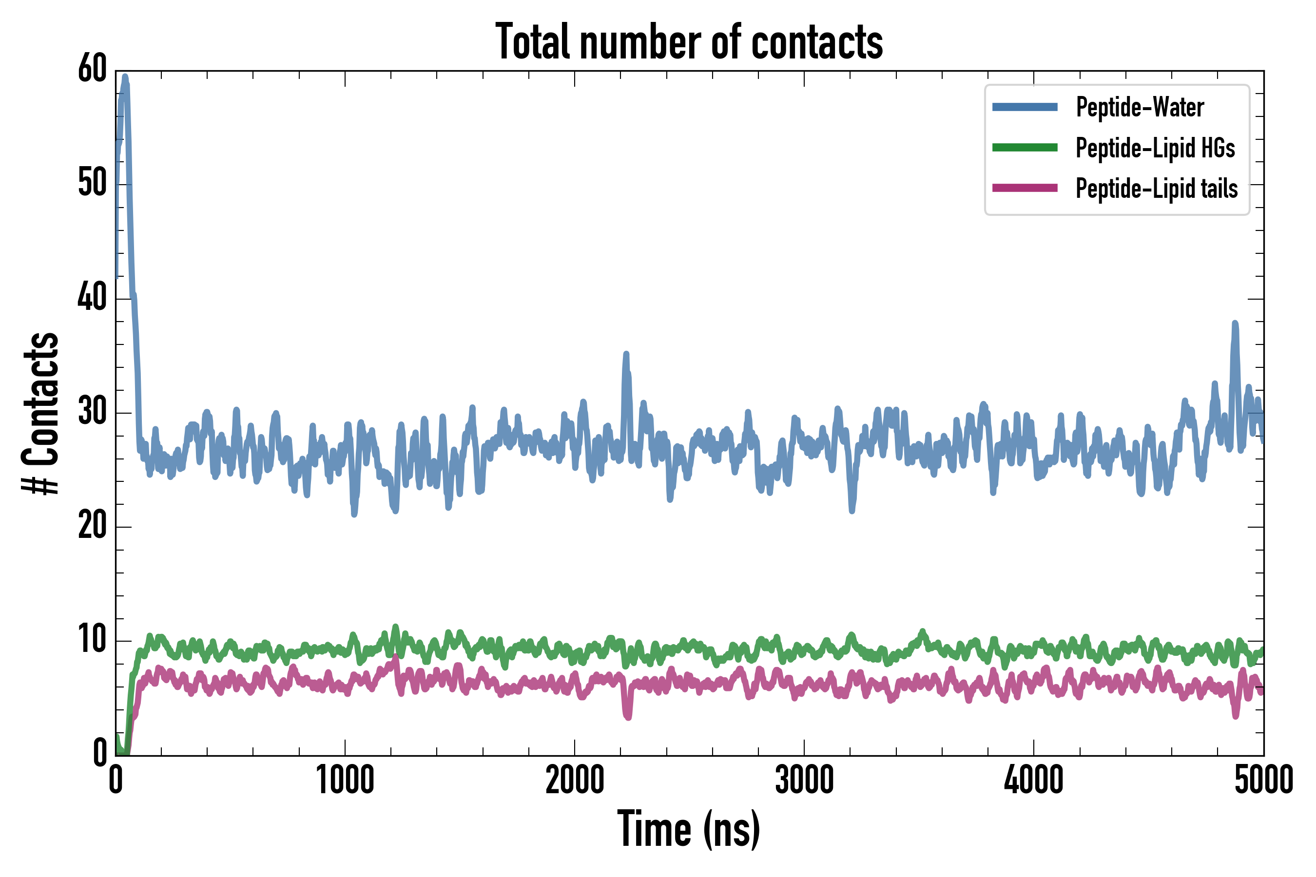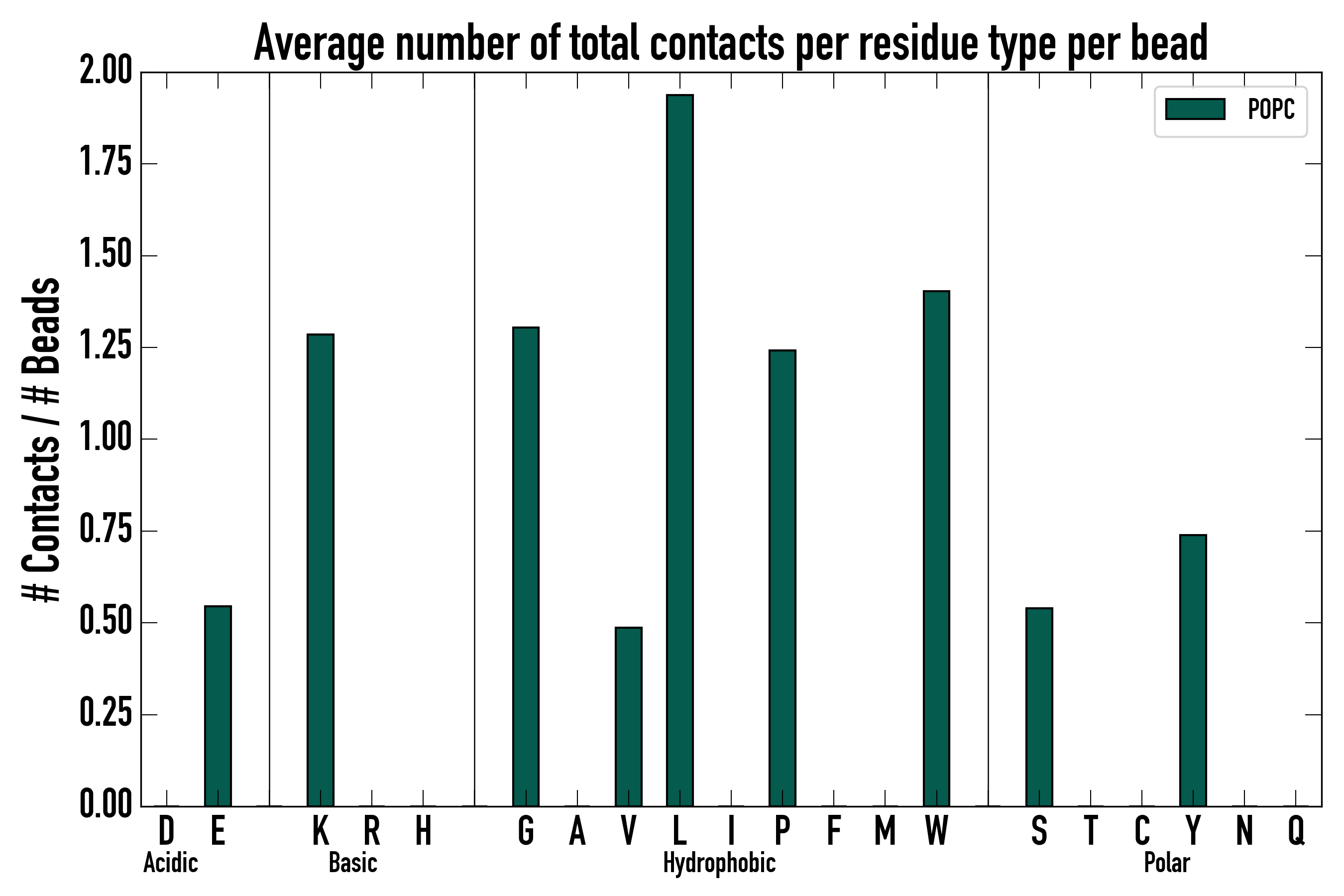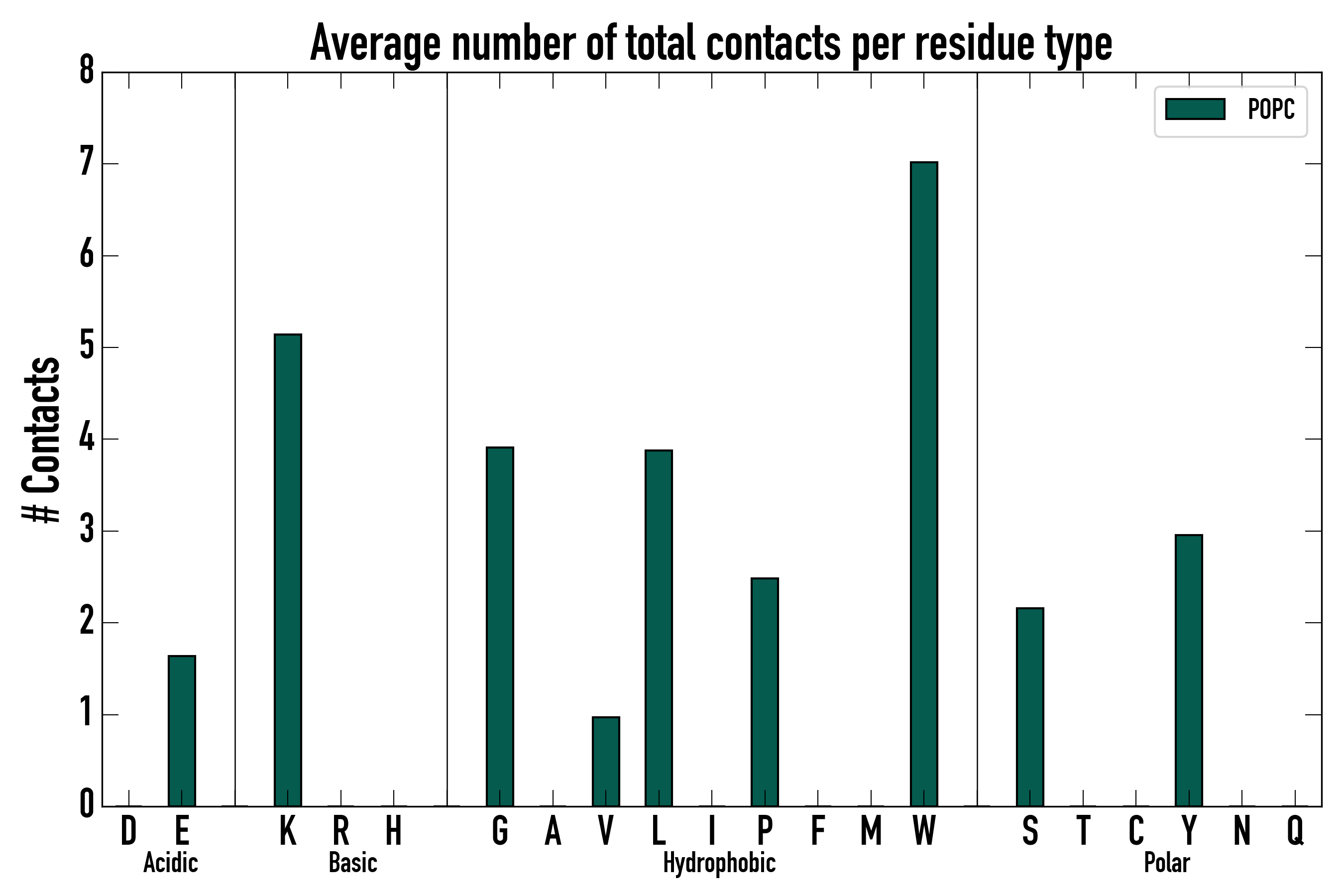 Number of contacts between each residue of the peptide backbone and the different lipid types, averaged over the last microsecond and using a cut-off of 0.6 nm.