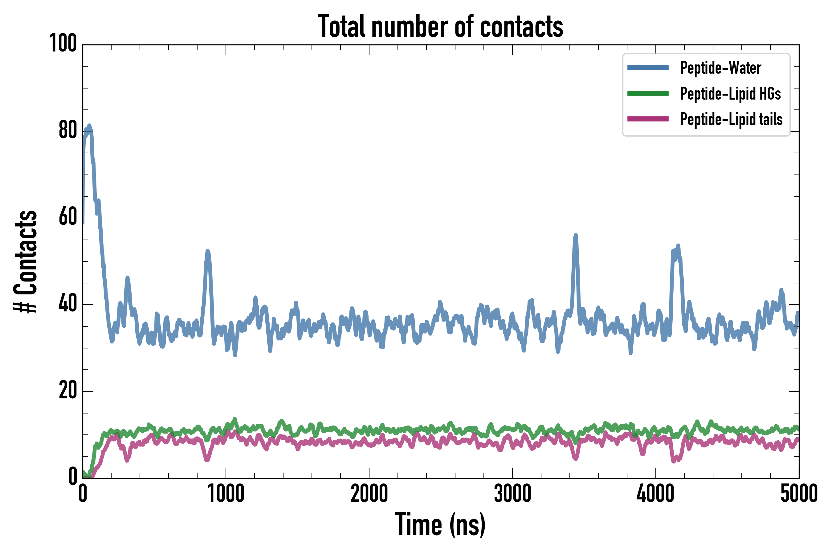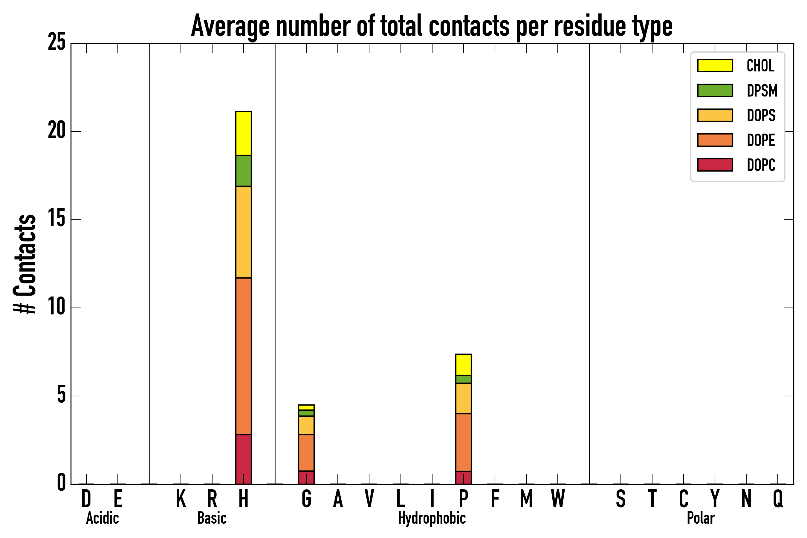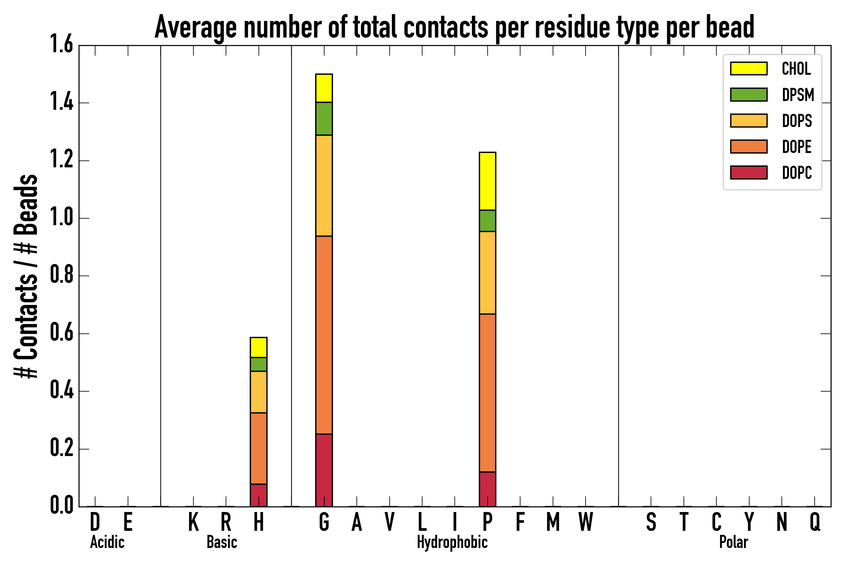 Number of contacts between each residue of the peptide backbone and the different lipid types, averaged over the last microsecond and using a cut-off of 0.6 nm.
