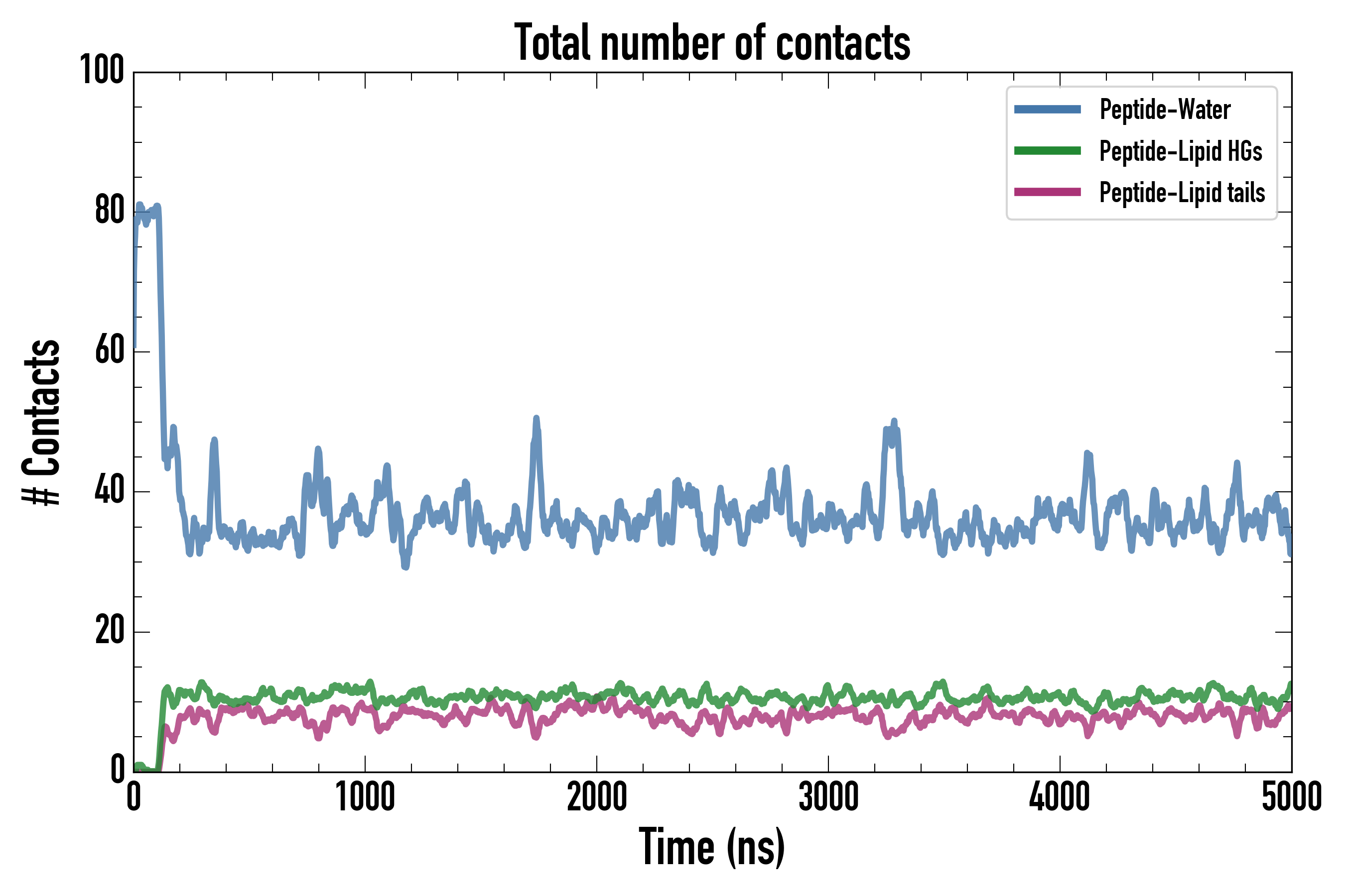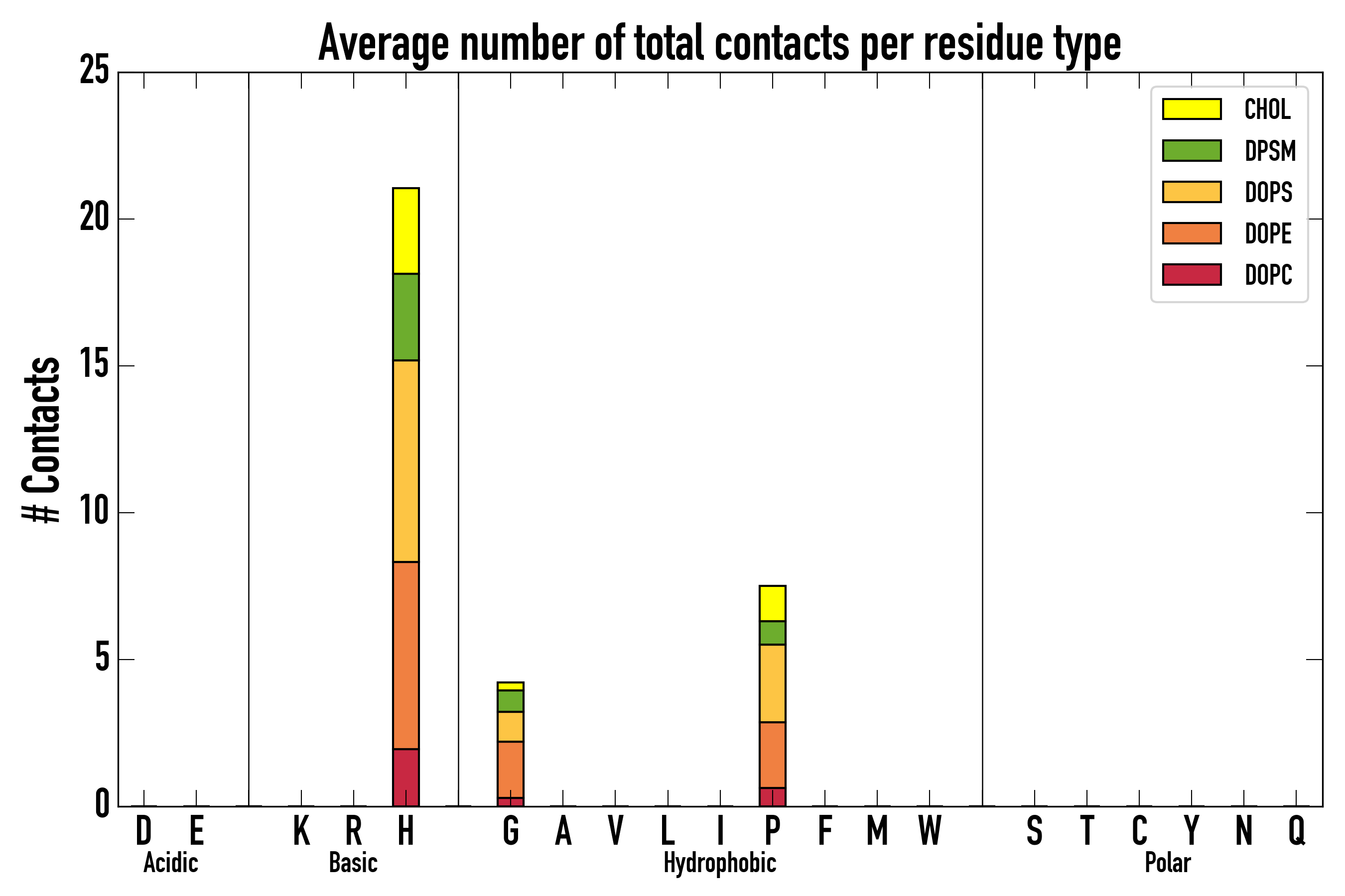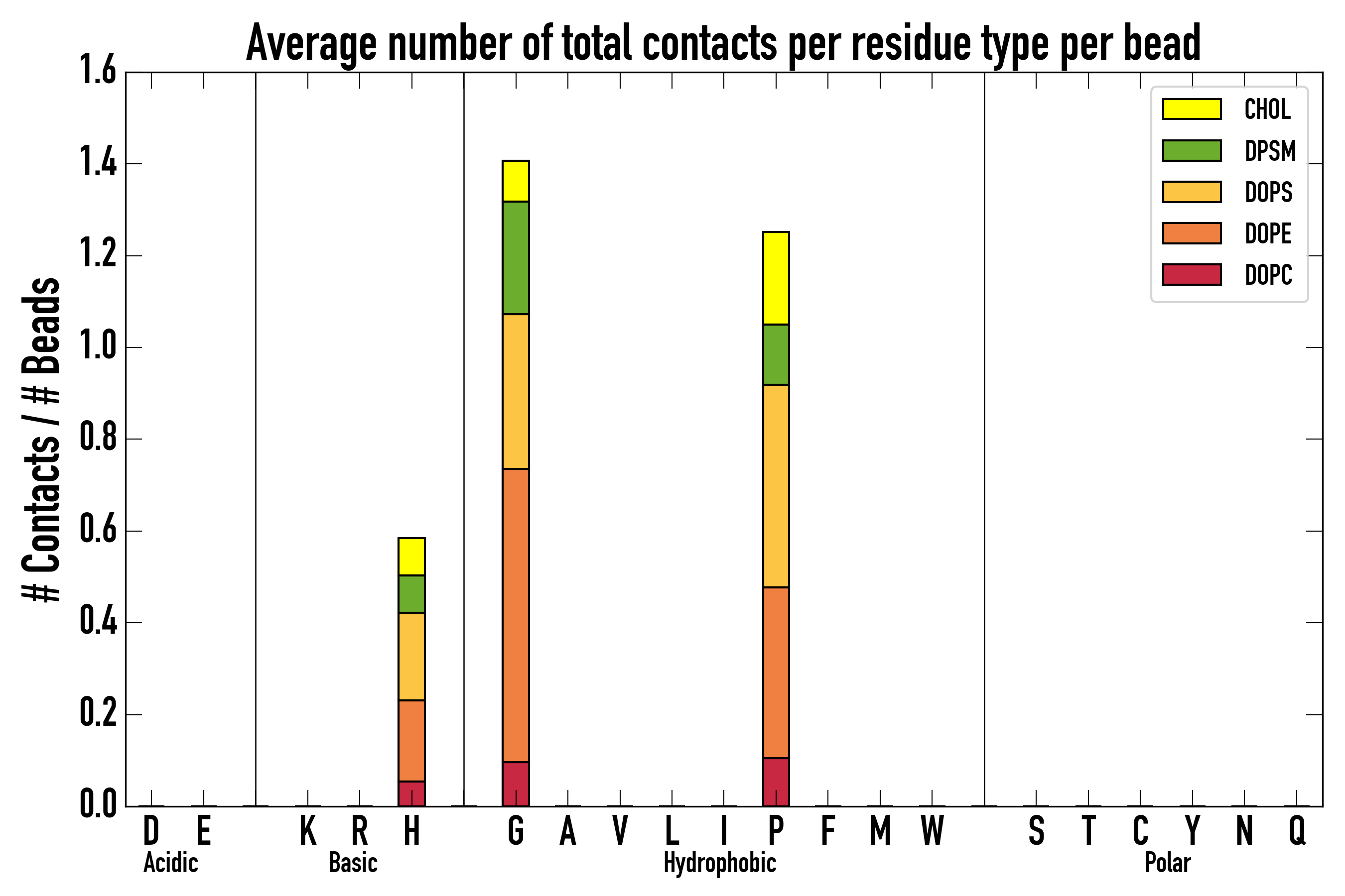 Number of contacts between each residue of the peptide backbone and the different lipid types, averaged over the last microsecond and using a cut-off of 0.6 nm.