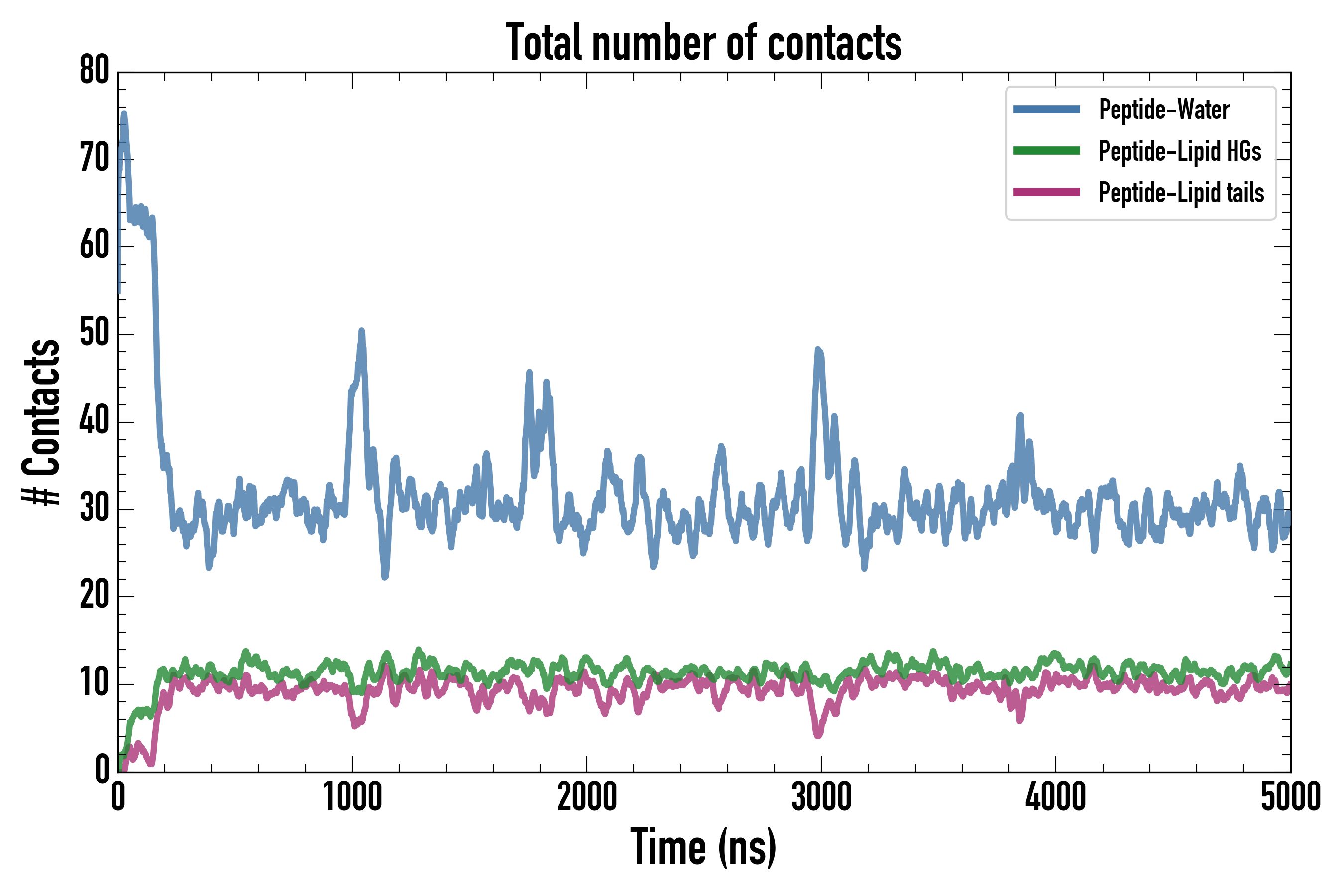 Number of contacts between each residue of the peptide backbone and the different lipid types, averaged over the last microsecond and using a cut-off of 0.6 nm.