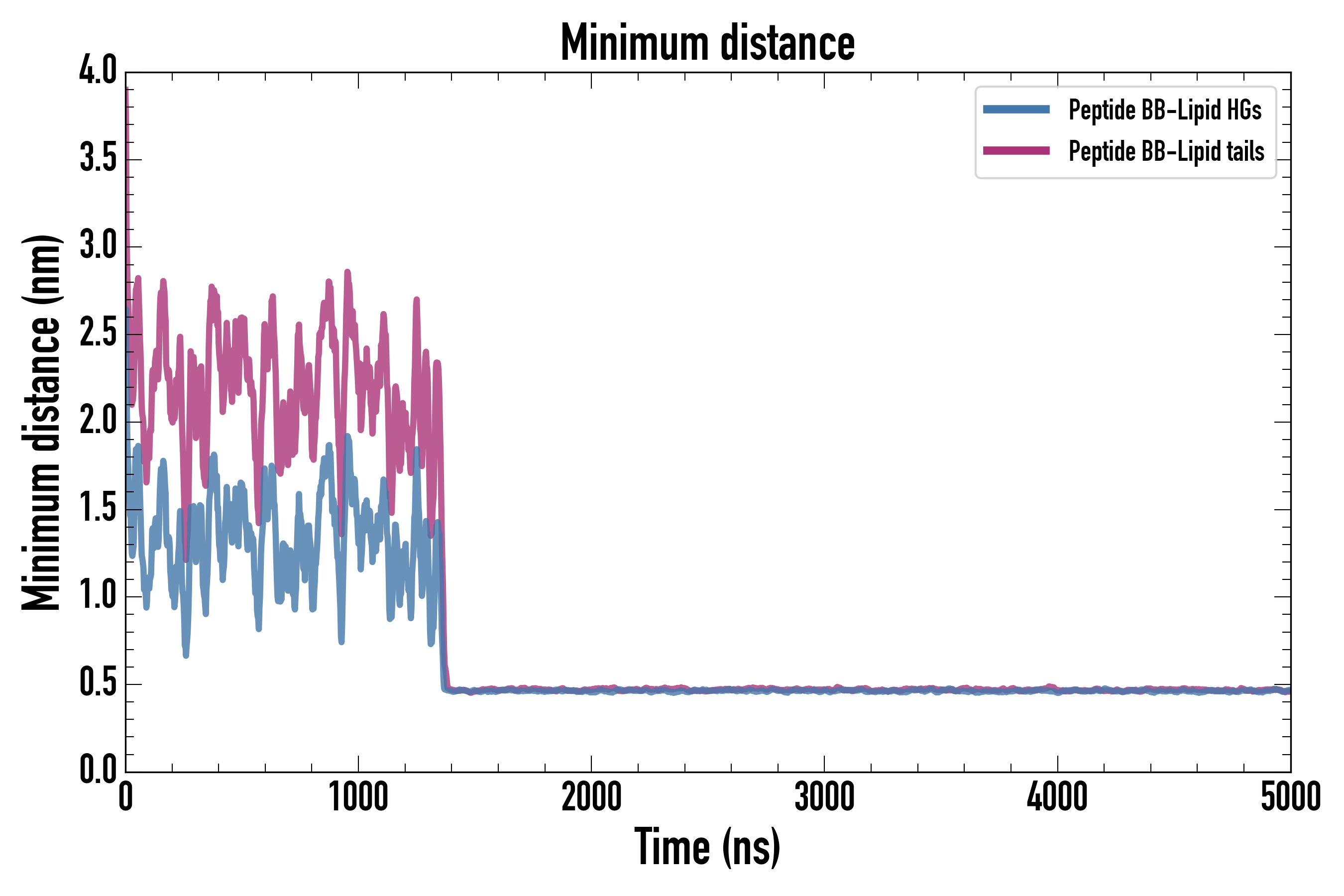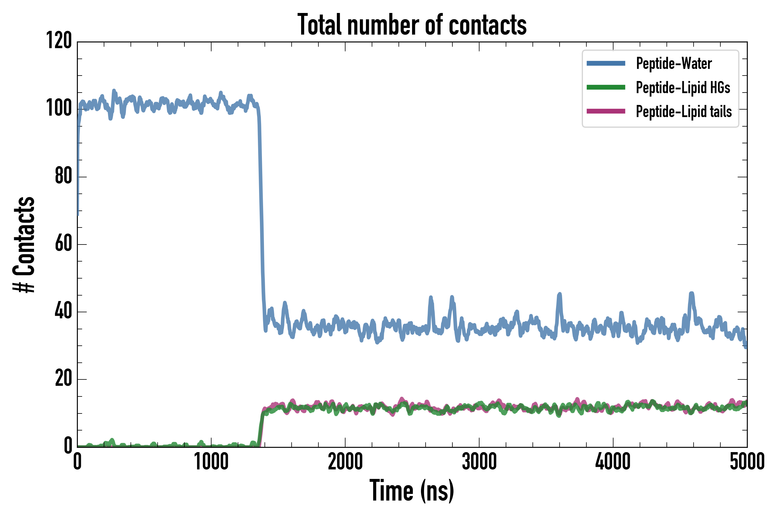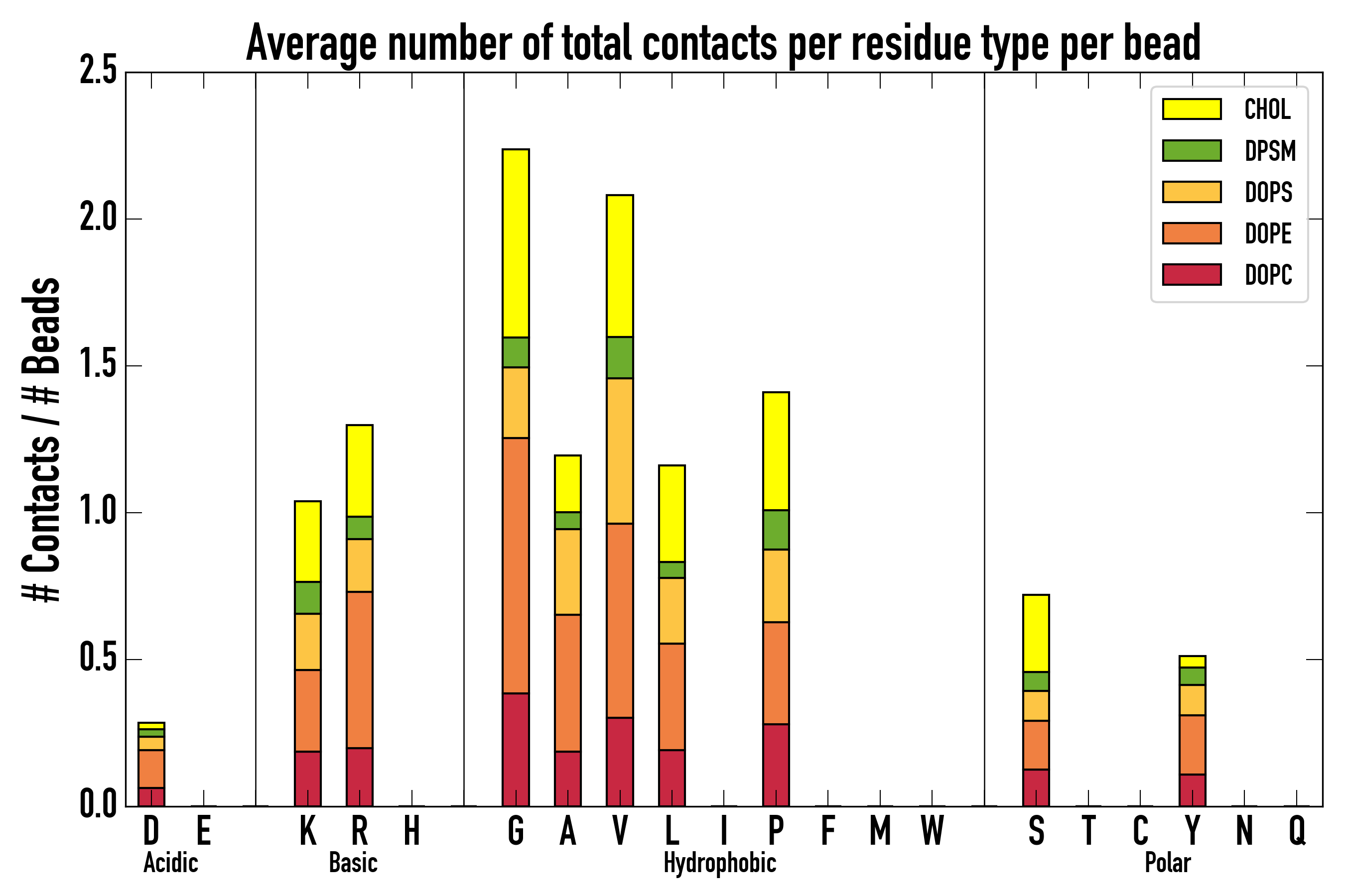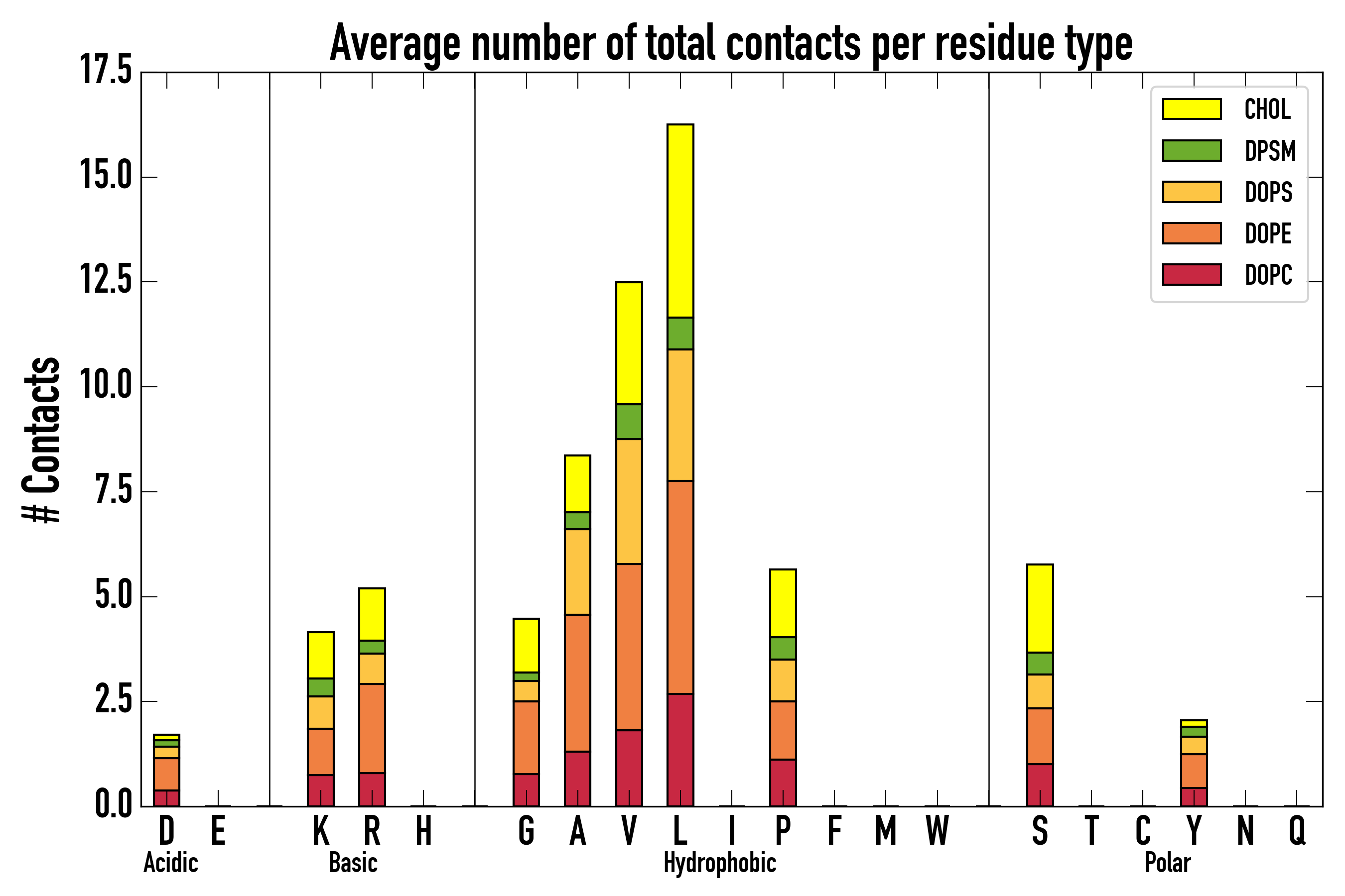 Number of contacts between each residue of the peptide backbone and the different lipid types, averaged over the last microsecond and using a cut-off of 0.6 nm.