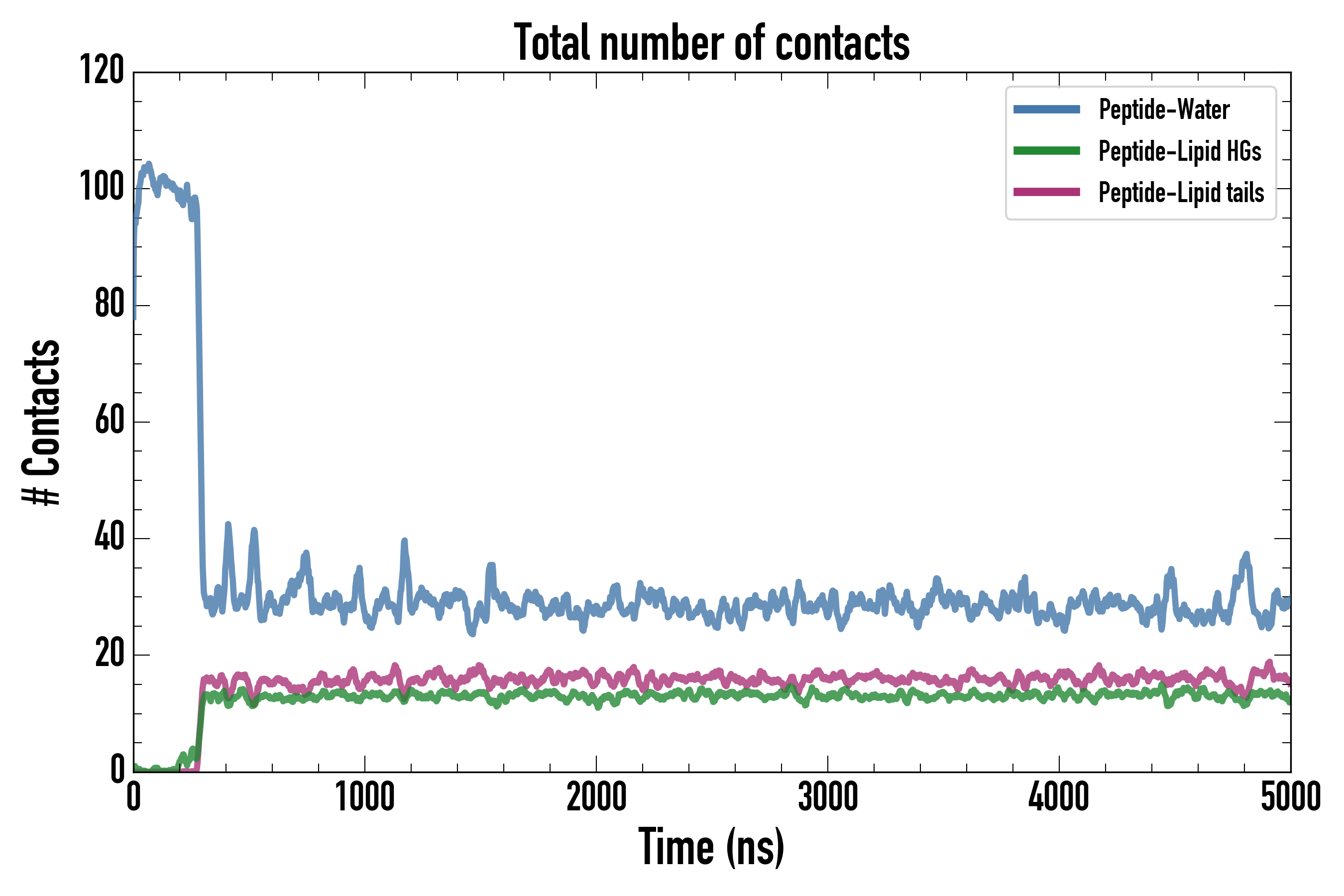 Number of contacts between each residue of the peptide backbone and the different lipid types, averaged over the last microsecond and using a cut-off of 0.6 nm.