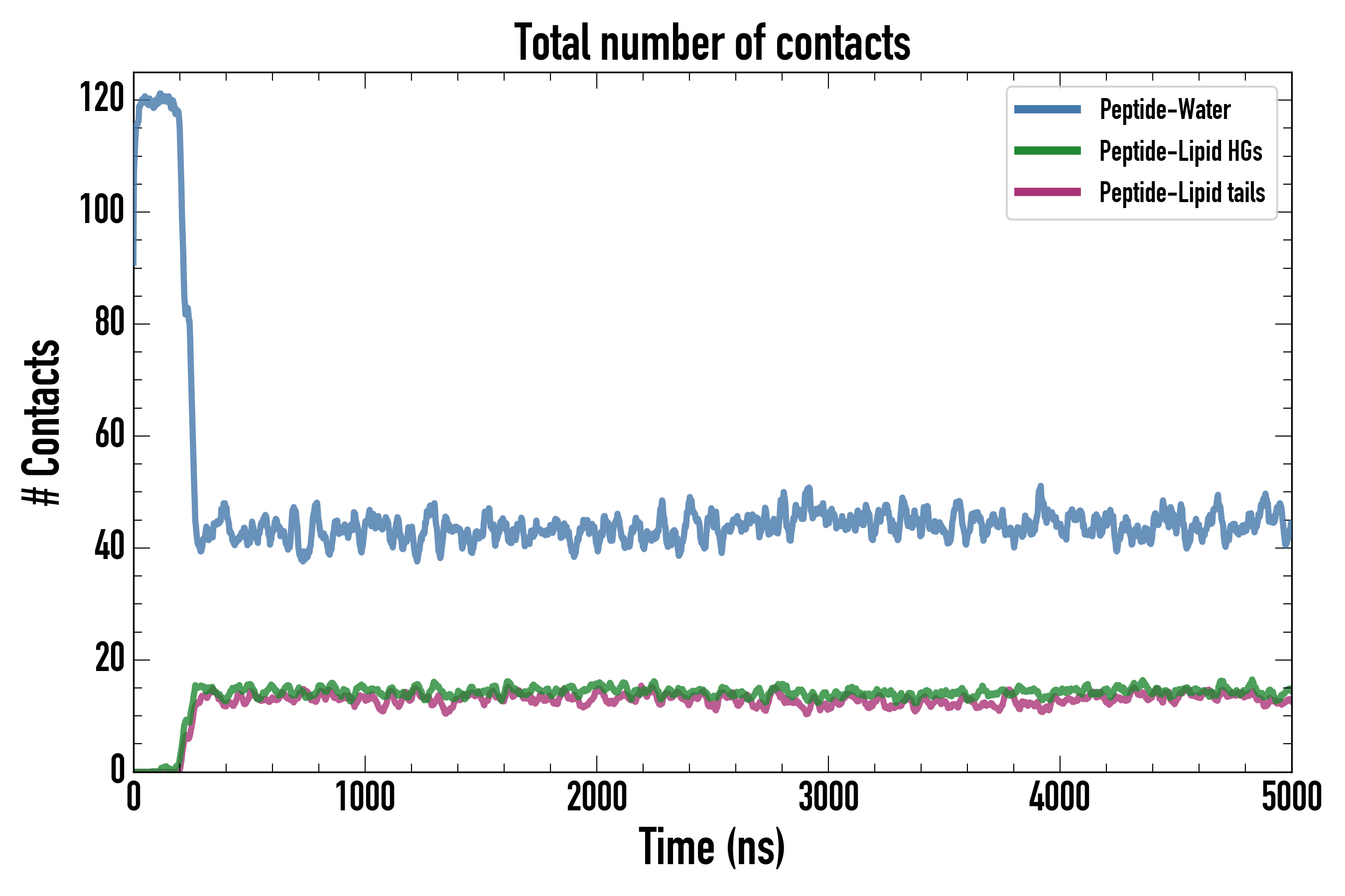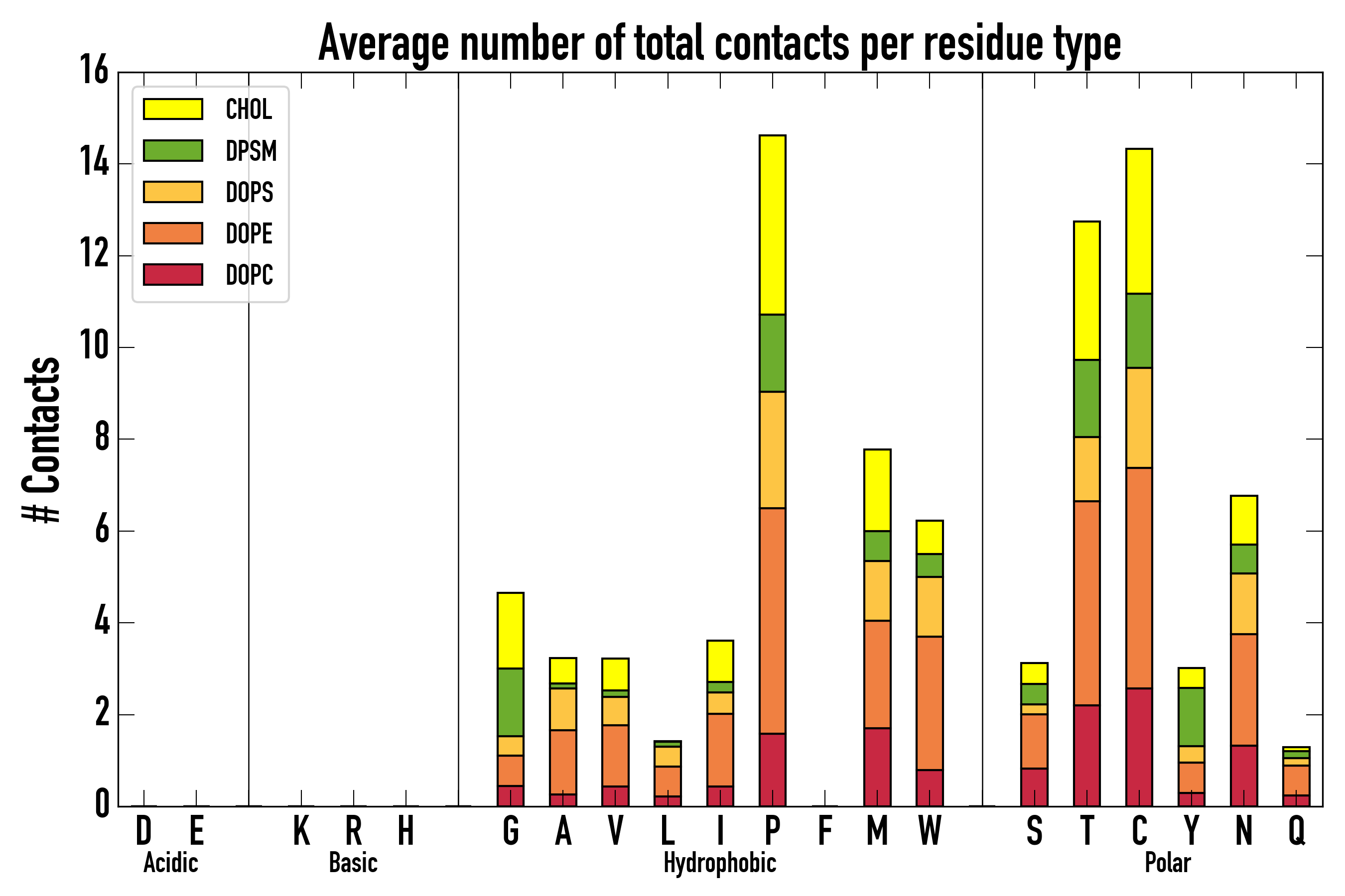 Number of contacts between each residue of the peptide backbone and the different lipid types, averaged over the last microsecond and using a cut-off of 0.6 nm.