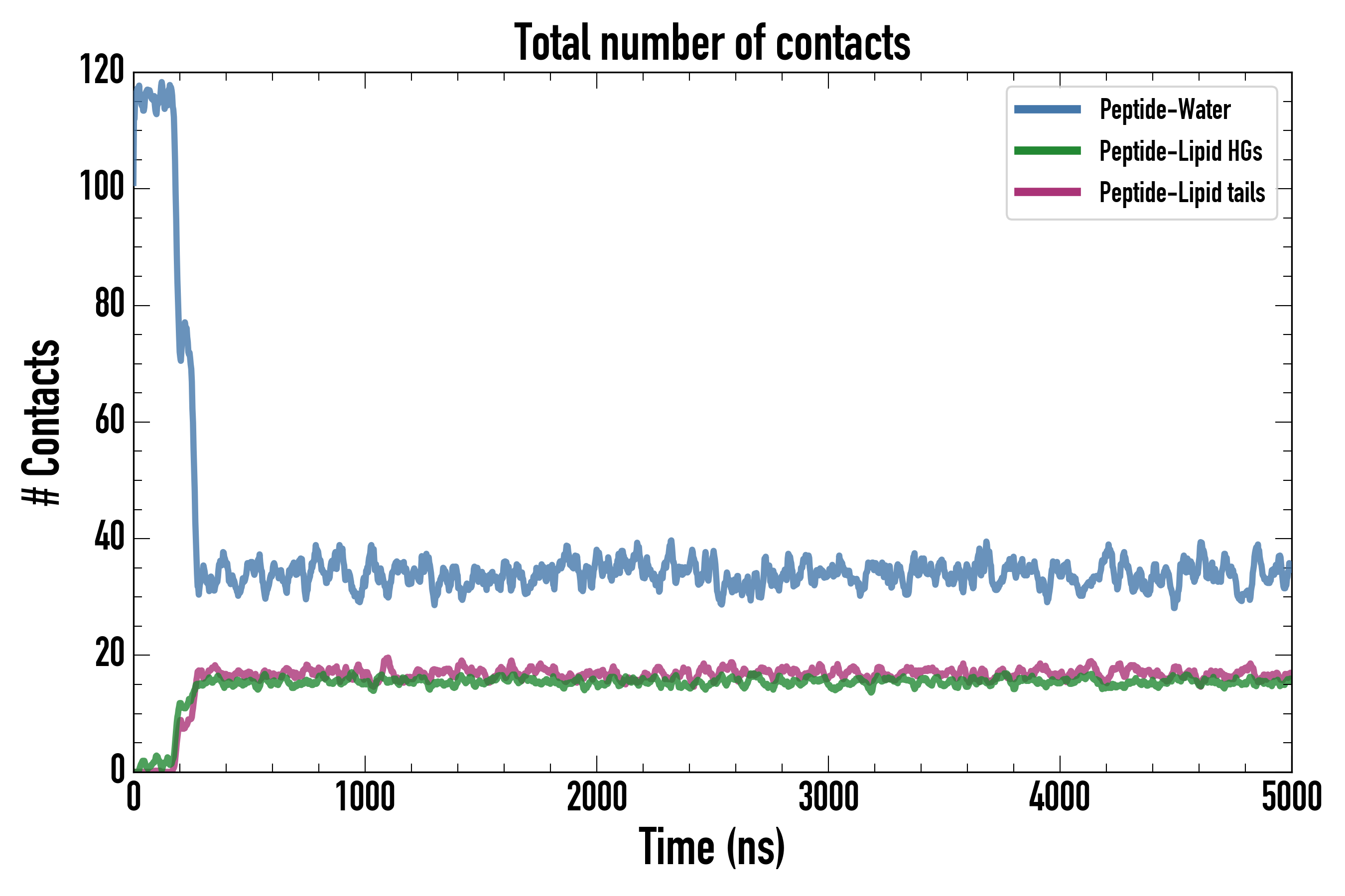Number of contacts between each residue of the peptide backbone and the different lipid types, averaged over the last microsecond and using a cut-off of 0.6 nm.