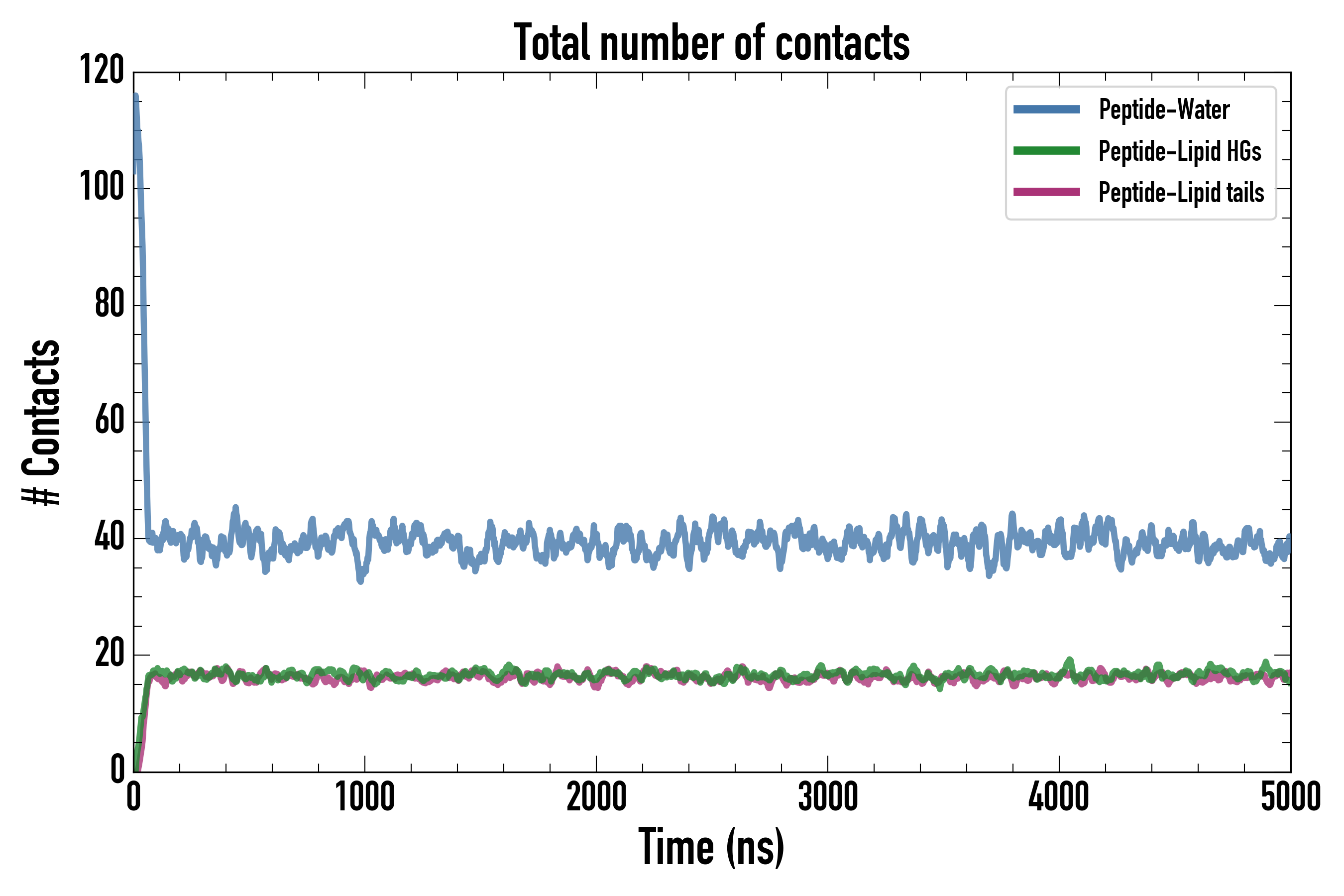 Number of contacts between each residue of the peptide backbone and the different lipid types, averaged over the last microsecond and using a cut-off of 0.6 nm.