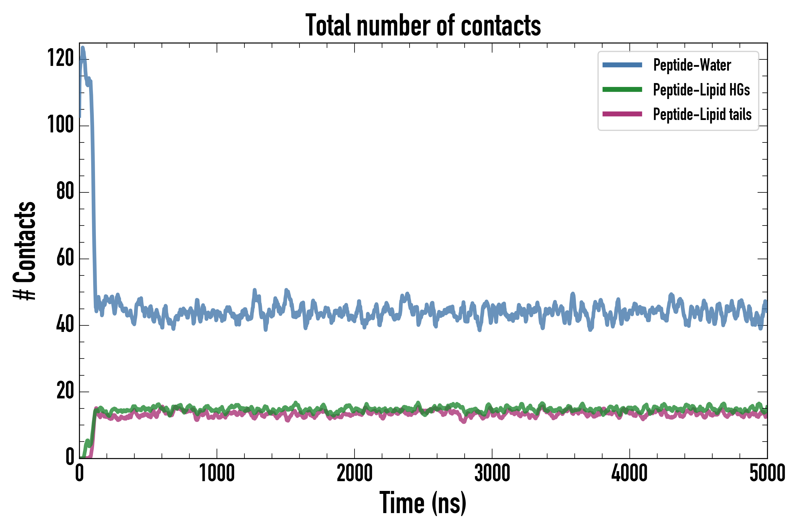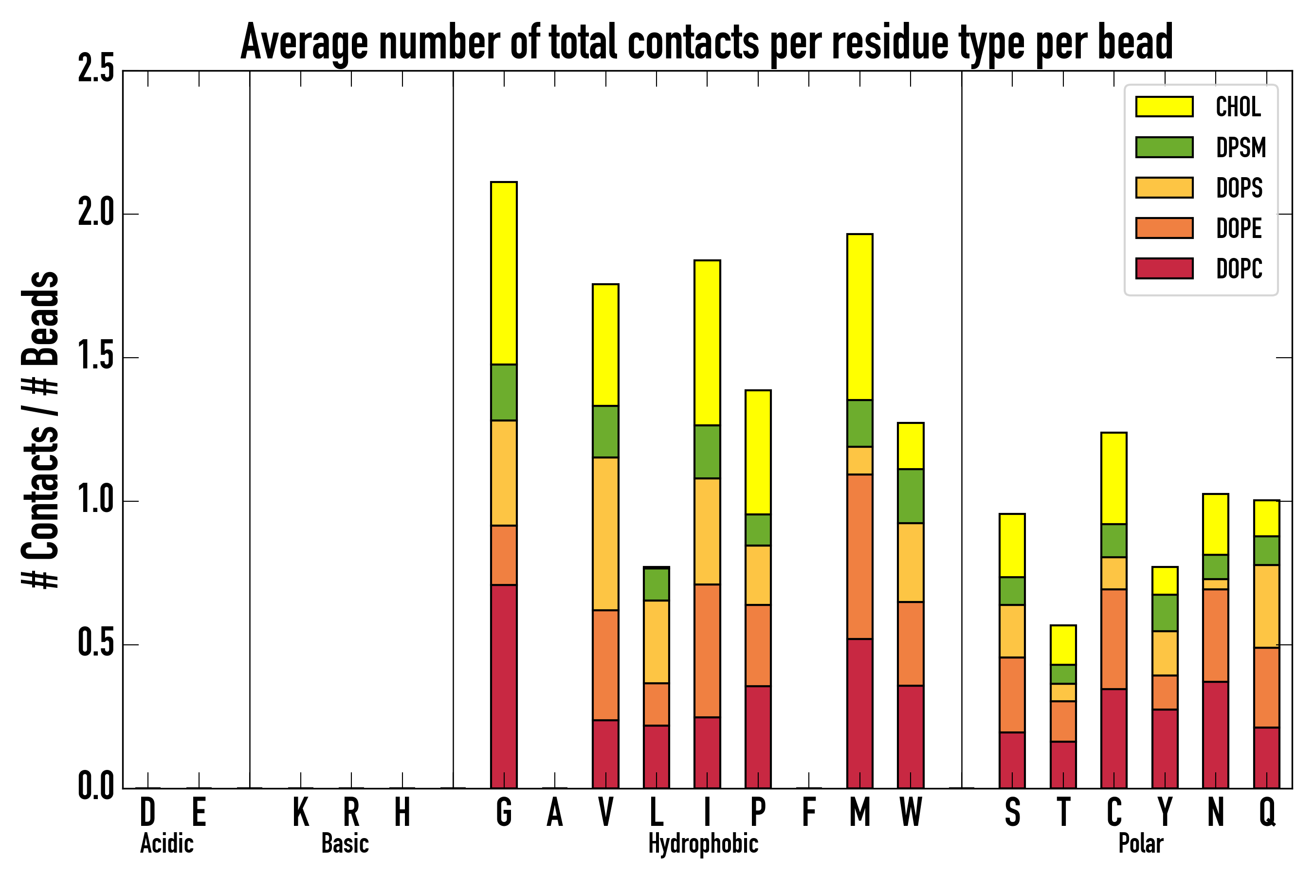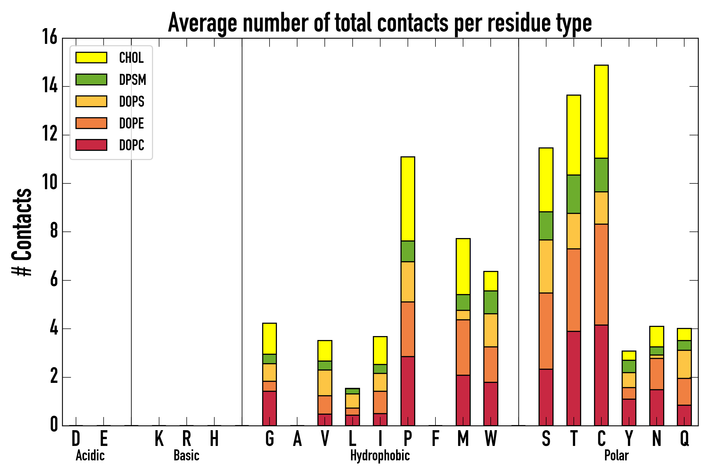 Number of contacts between each residue of the peptide backbone and the different lipid types, averaged over the last microsecond and using a cut-off of 0.6 nm.