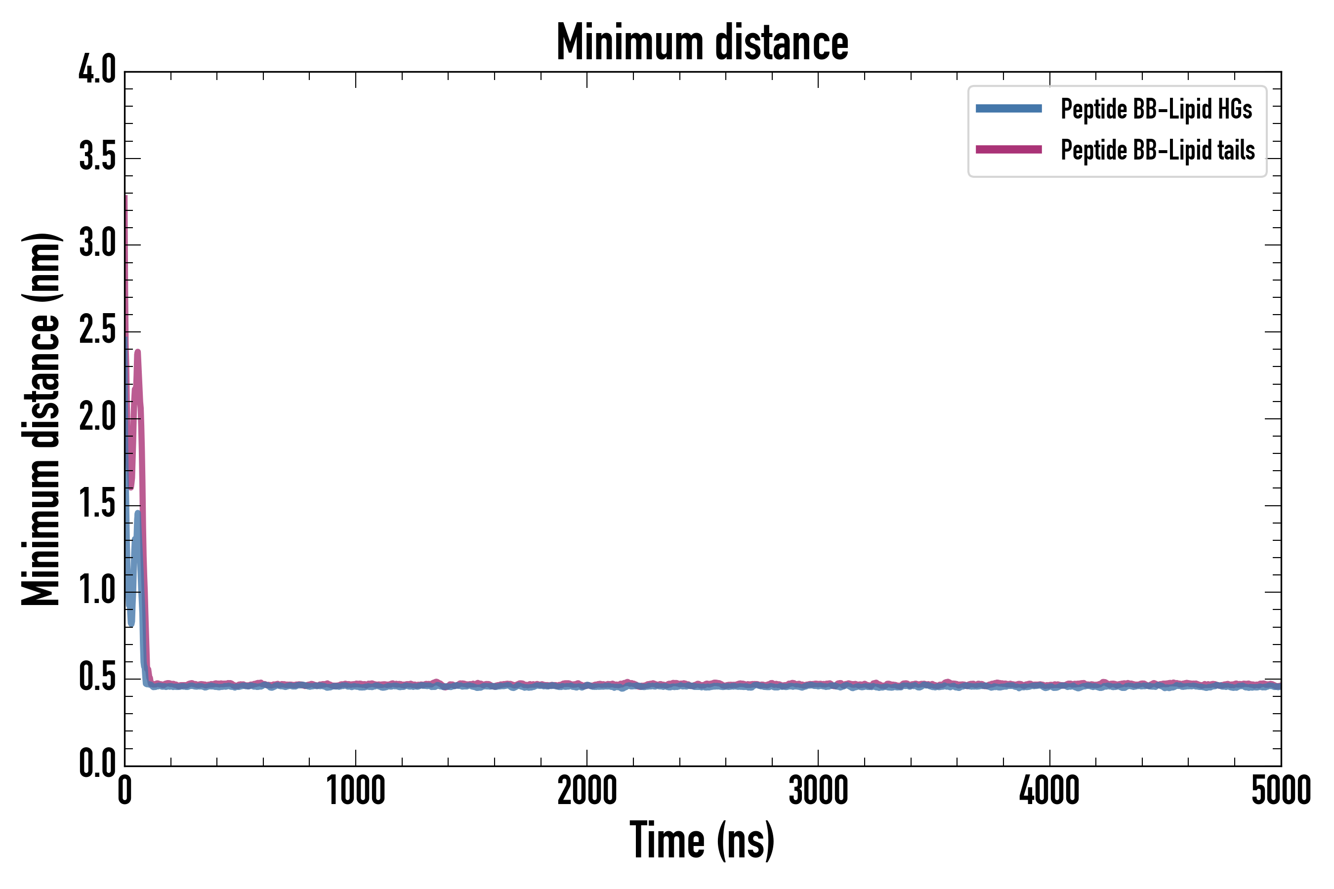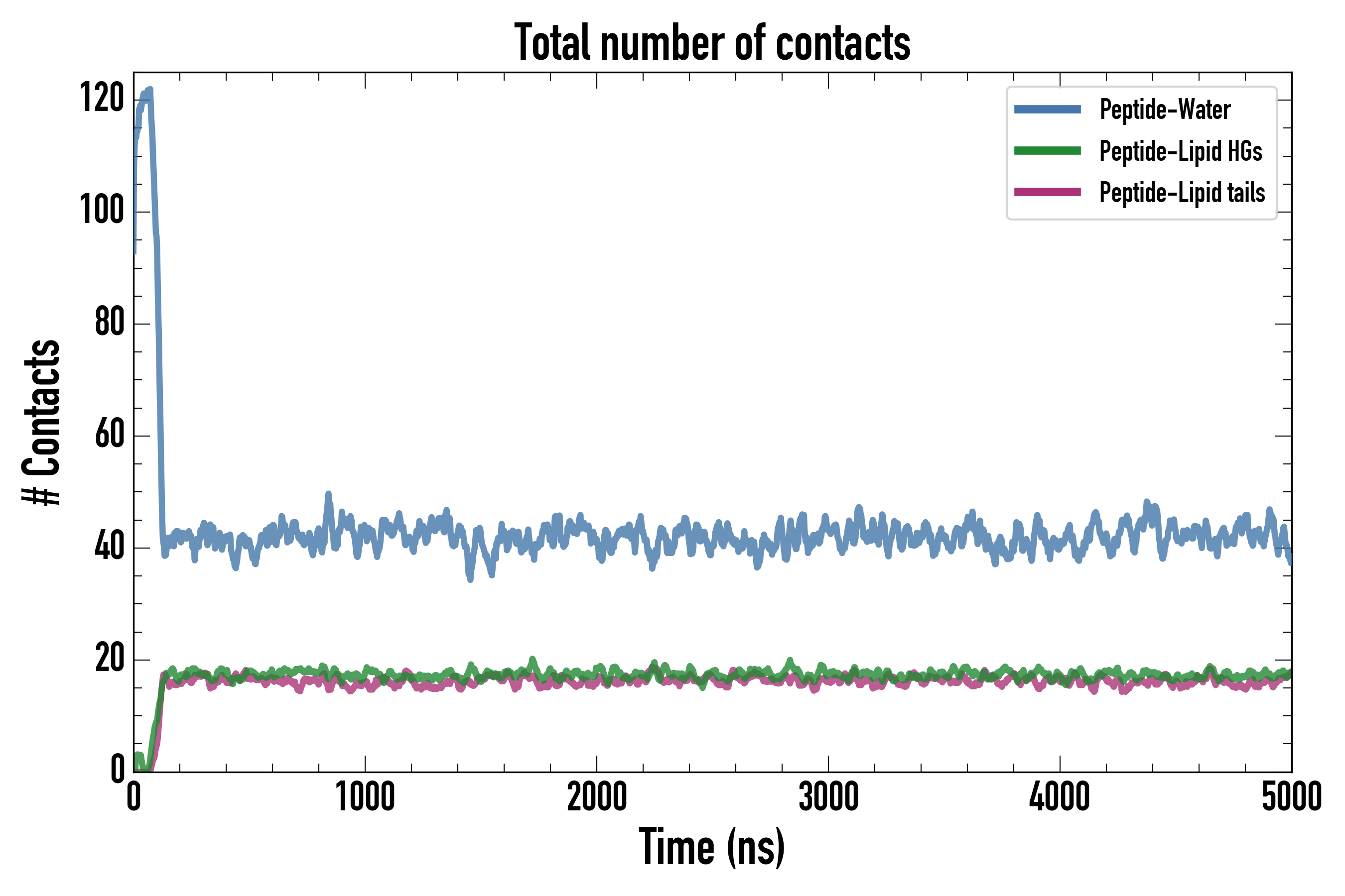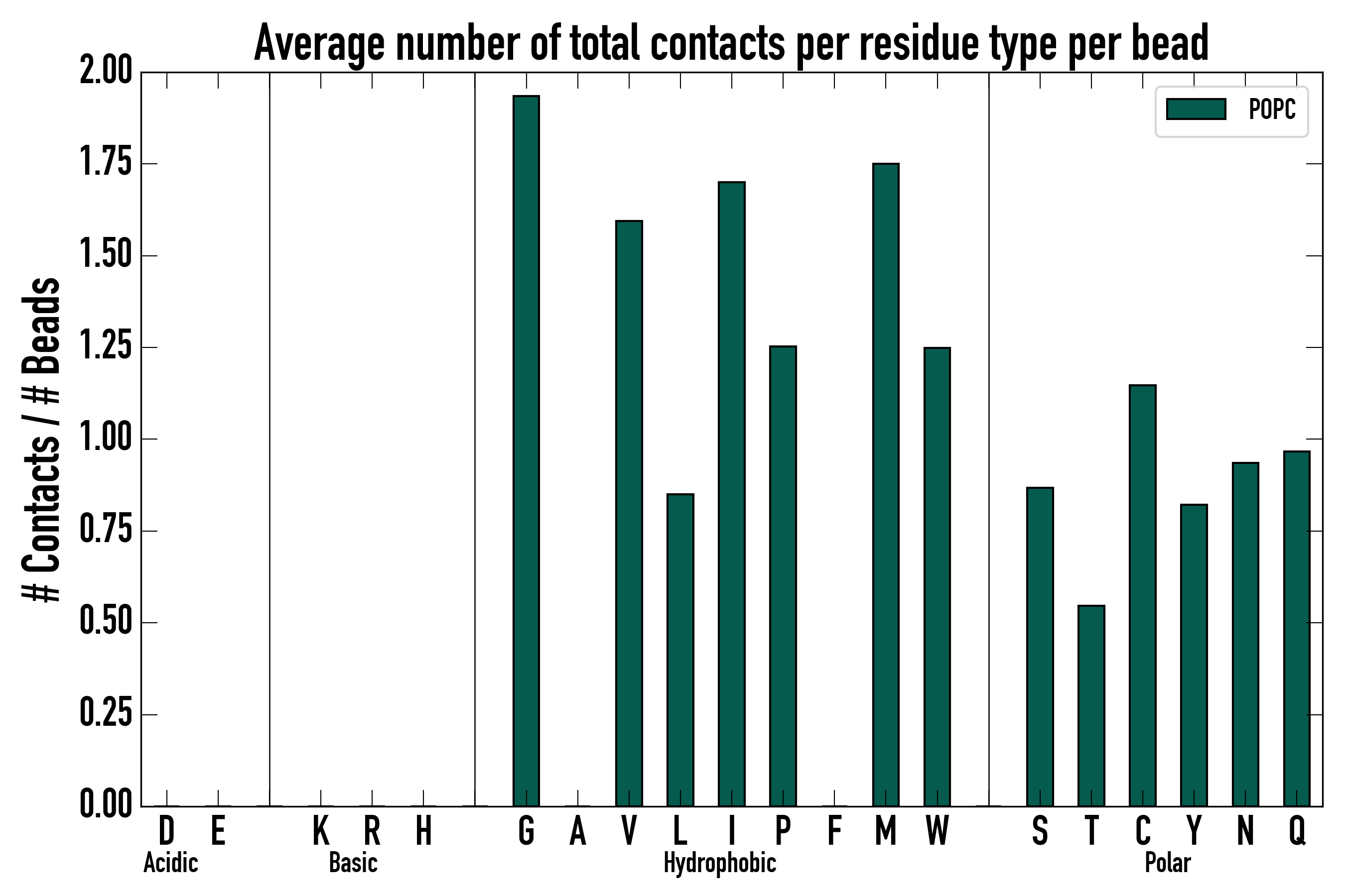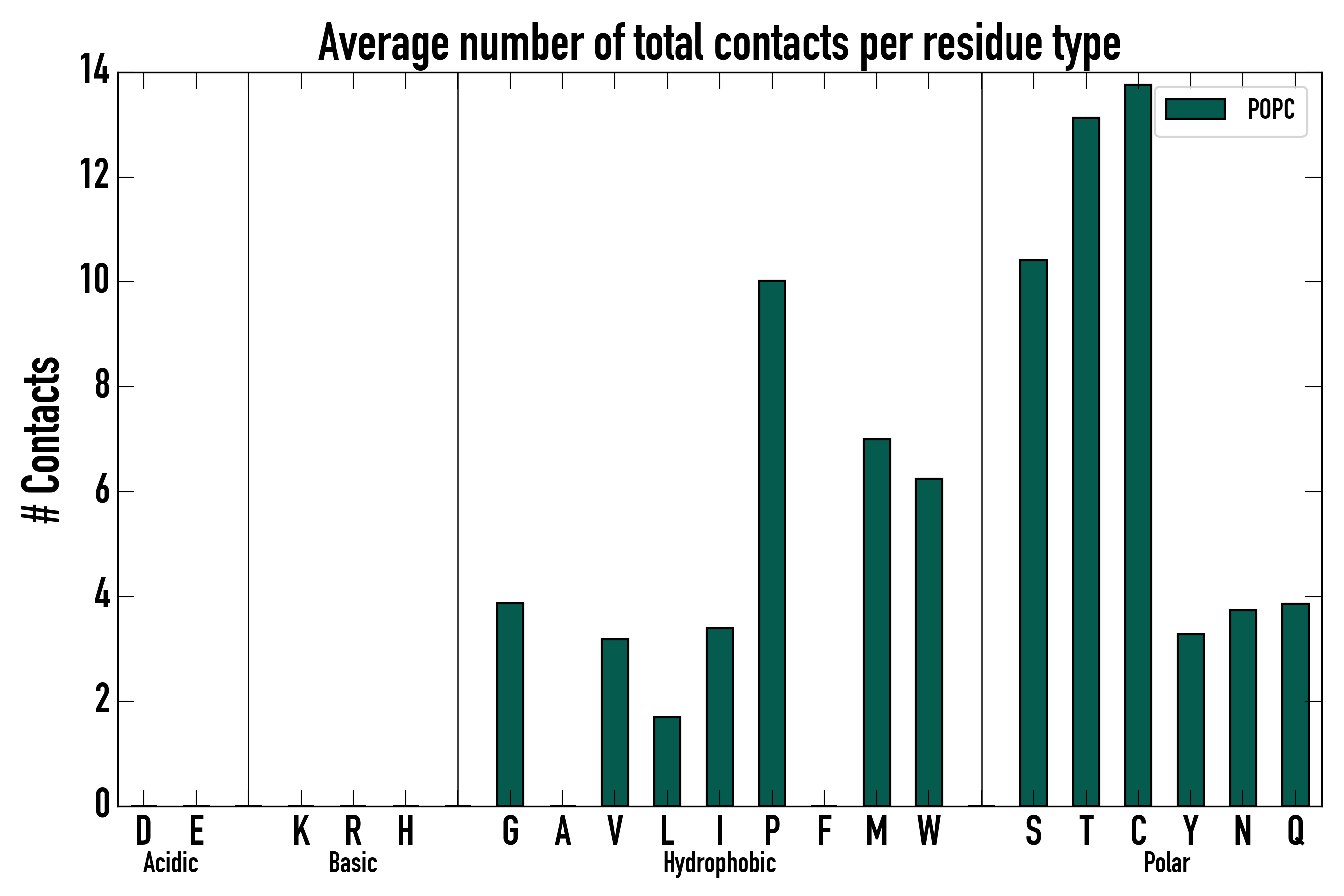 Number of contacts between each residue of the peptide backbone and the different lipid types, averaged over the last microsecond and using a cut-off of 0.6 nm.