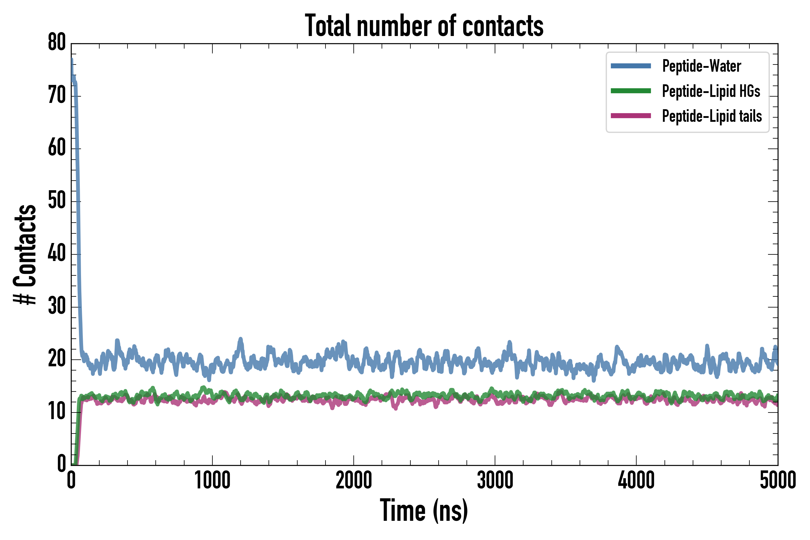 Number of contacts between each residue of the peptide backbone and the different lipid types, averaged over the last microsecond and using a cut-off of 0.6 nm.
