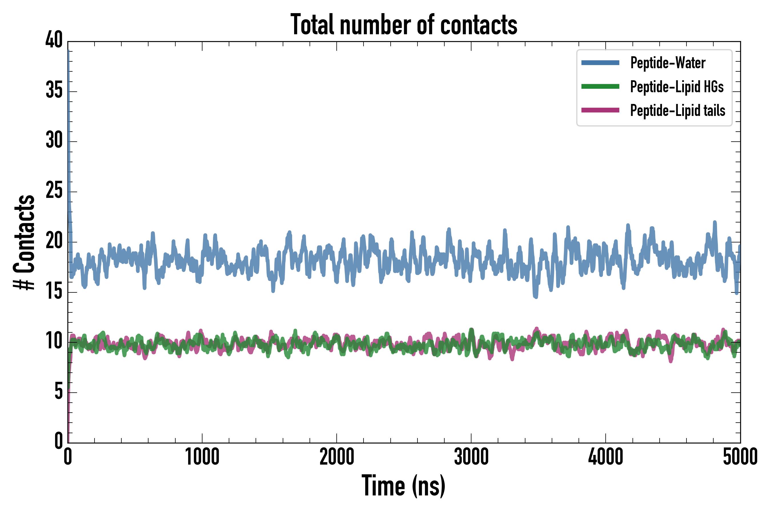 Number of contacts between each residue of the peptide backbone and the different lipid types, averaged over the last microsecond and using a cut-off of 0.6 nm.