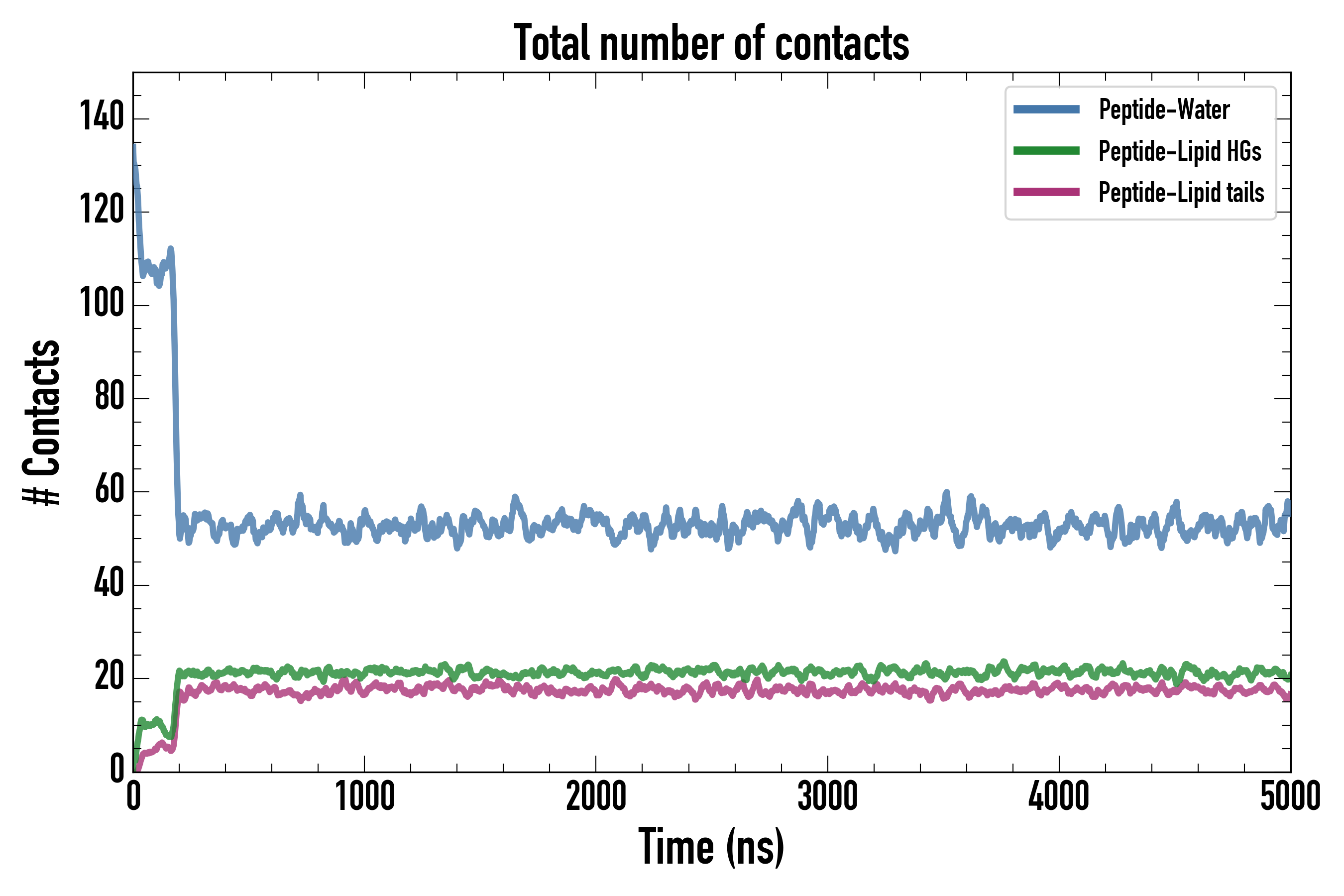 Number of contacts between each residue of the peptide backbone and the different lipid types, averaged over the last microsecond and using a cut-off of 0.6 nm.