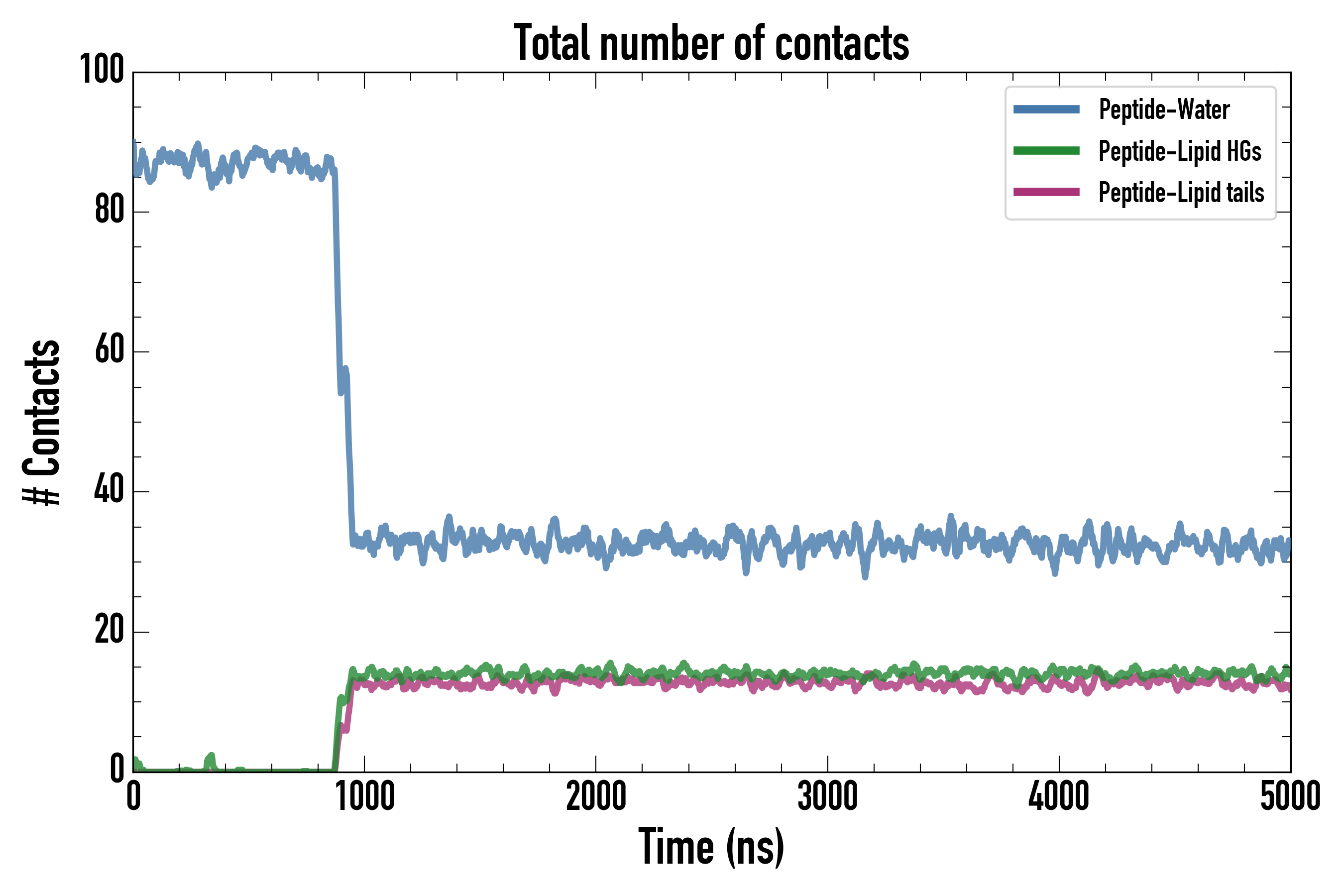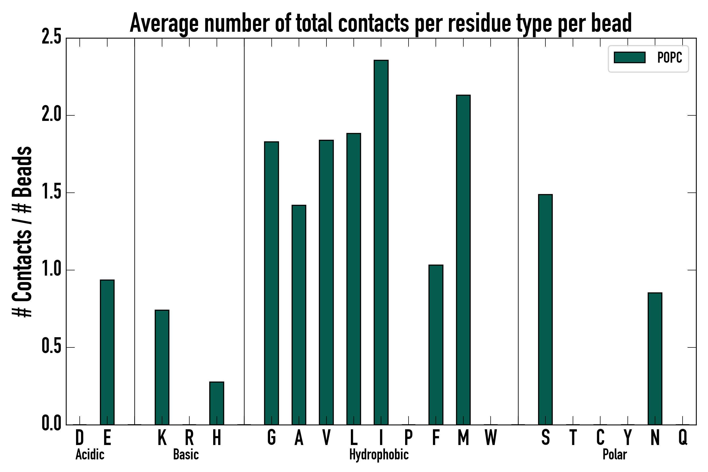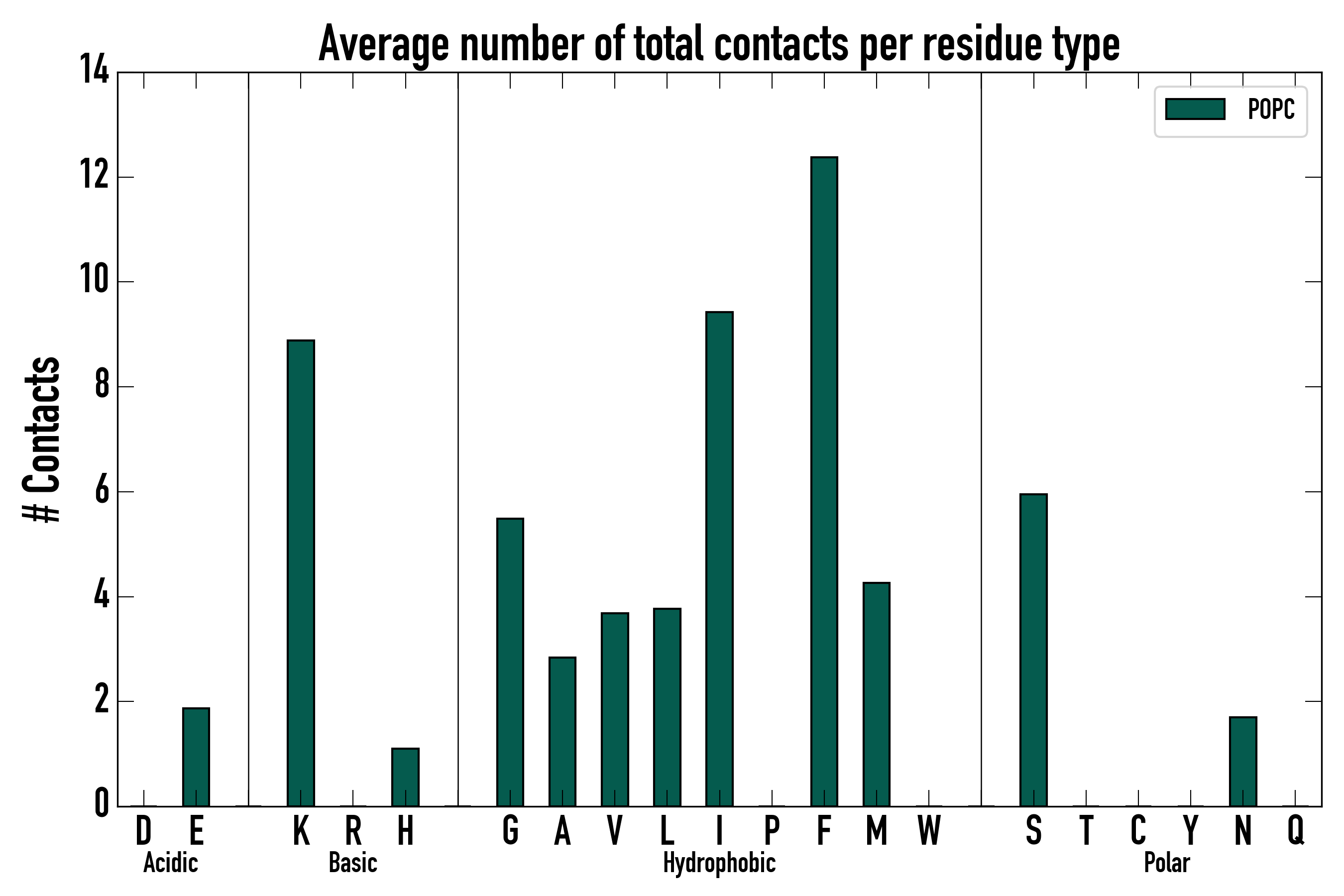 Number of contacts between each residue of the peptide backbone and the different lipid types, averaged over the last microsecond and using a cut-off of 0.6 nm.