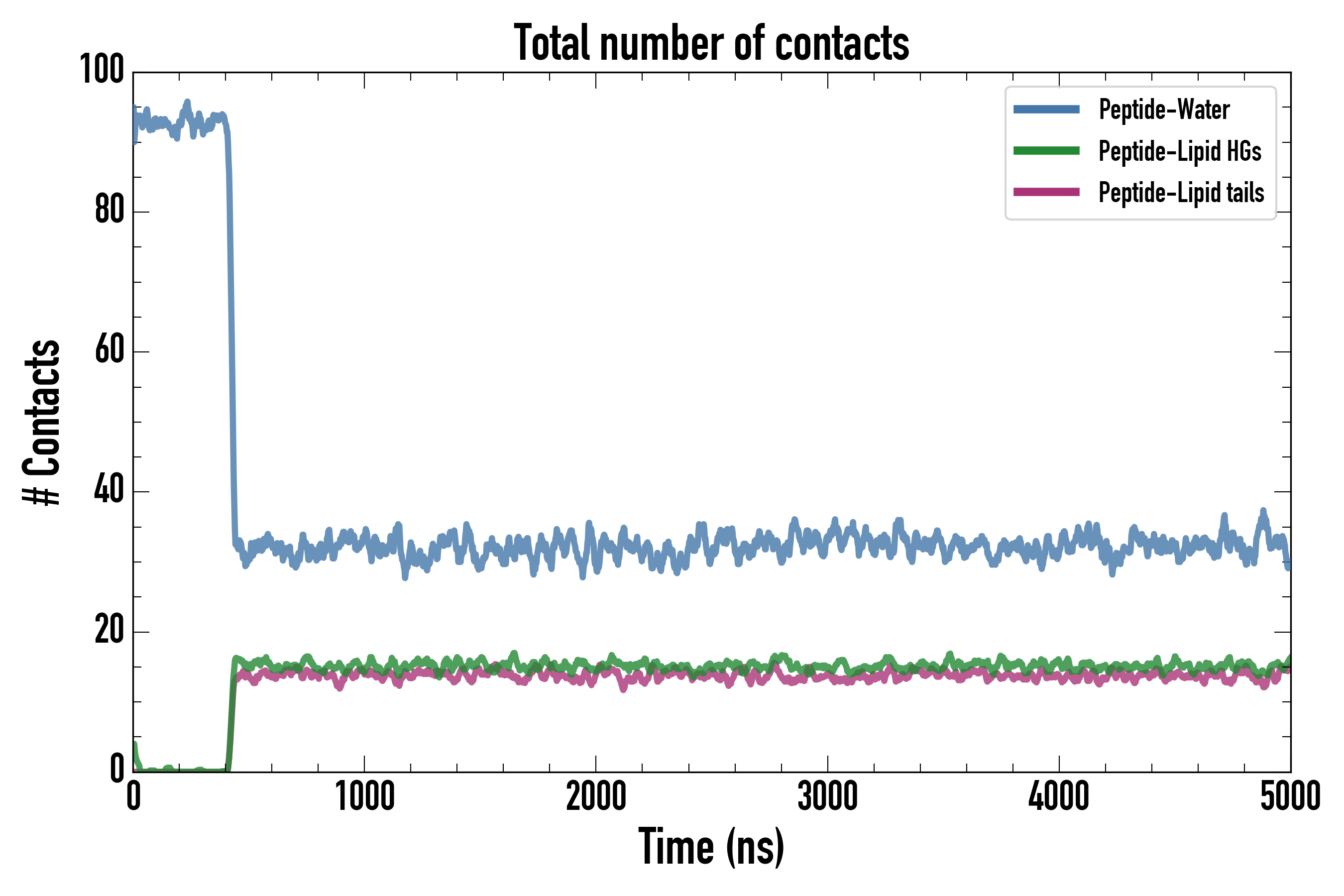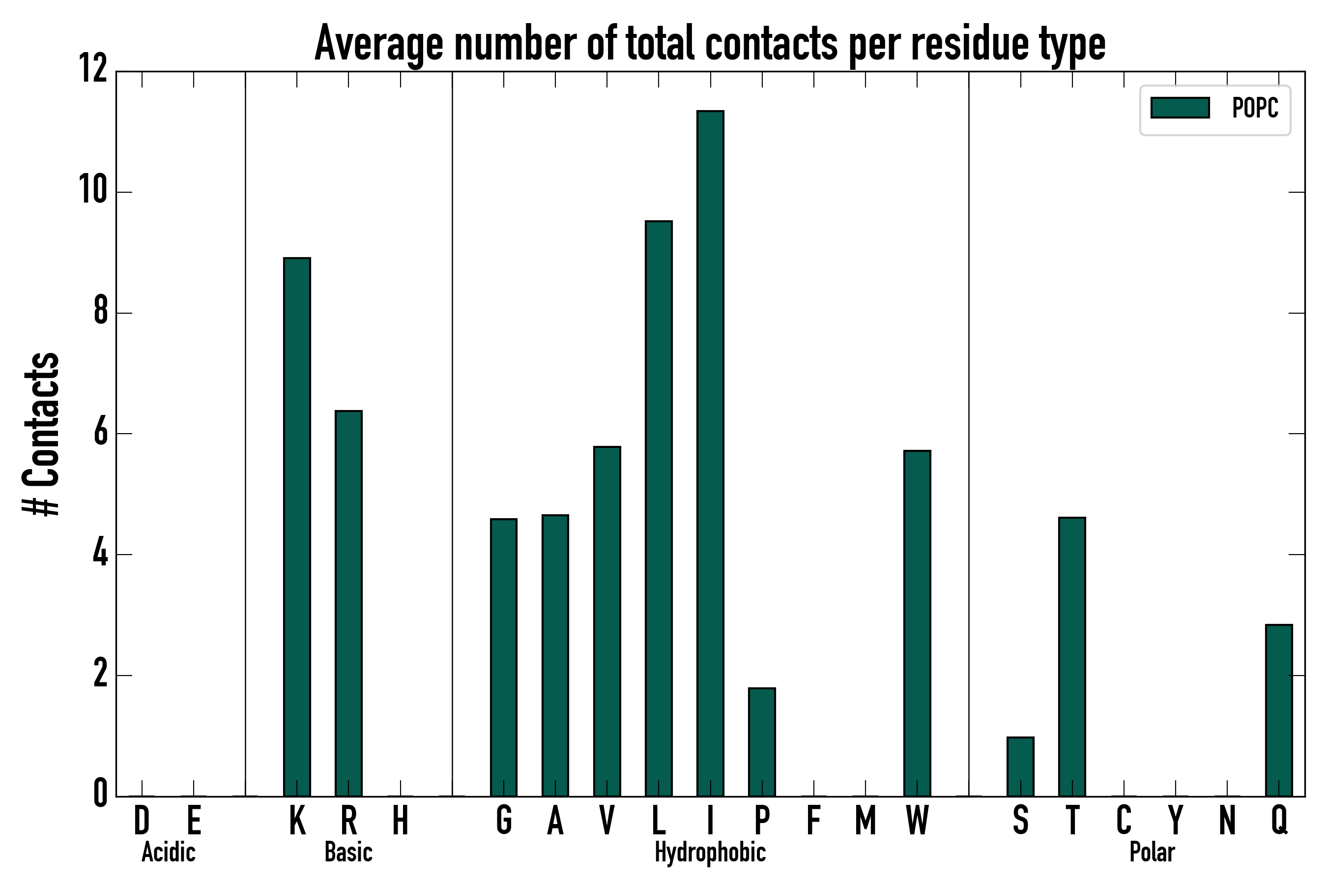 Number of contacts between each residue of the peptide backbone and the different lipid types, averaged over the last microsecond and using a cut-off of 0.6 nm.