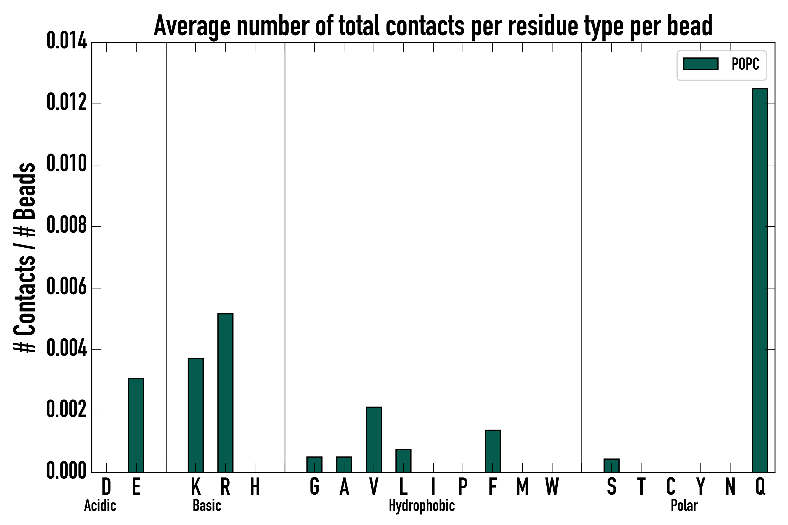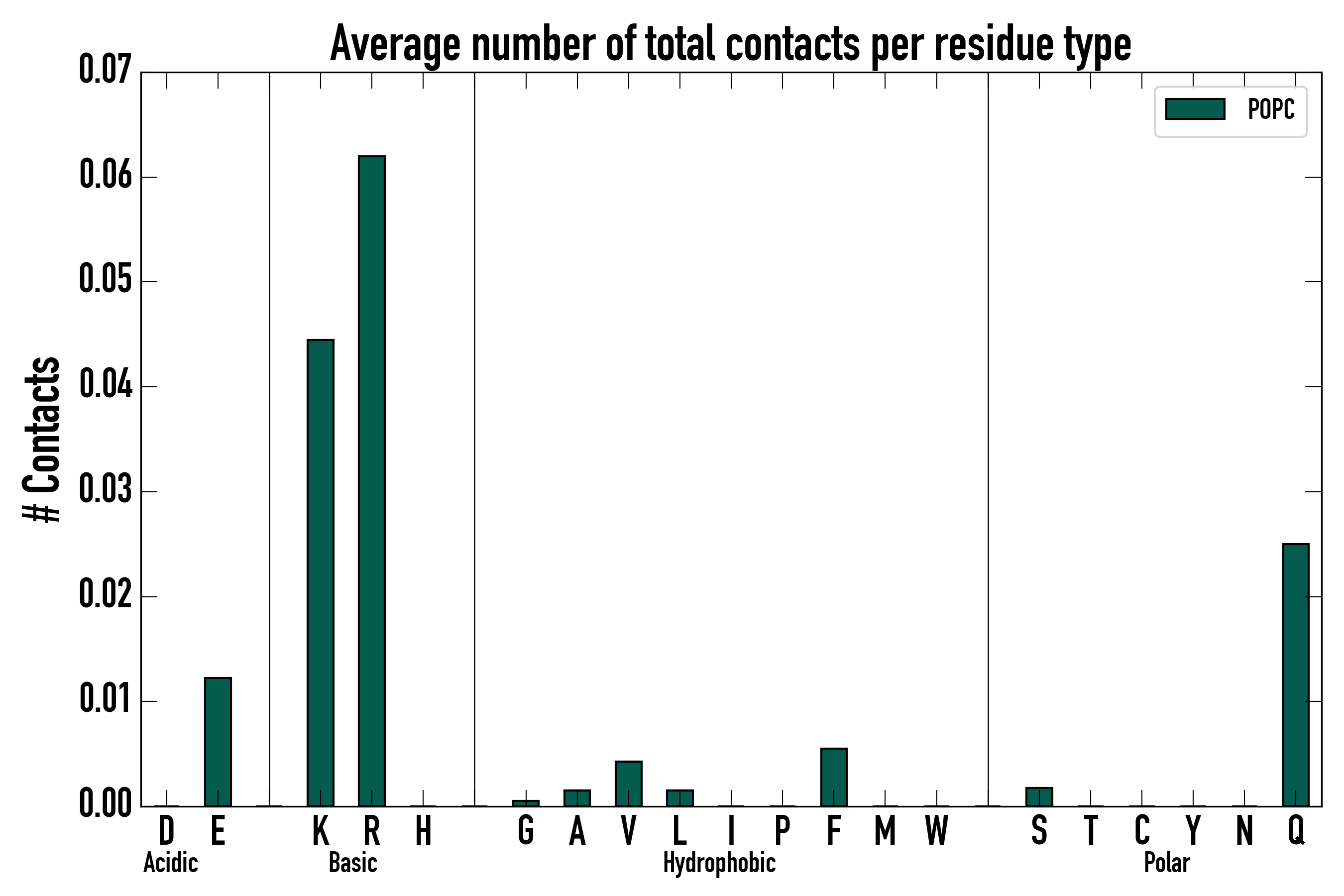 Number of contacts between each residue of the peptide backbone and the different lipid types, averaged over the last microsecond and using a cut-off of 0.6 nm.