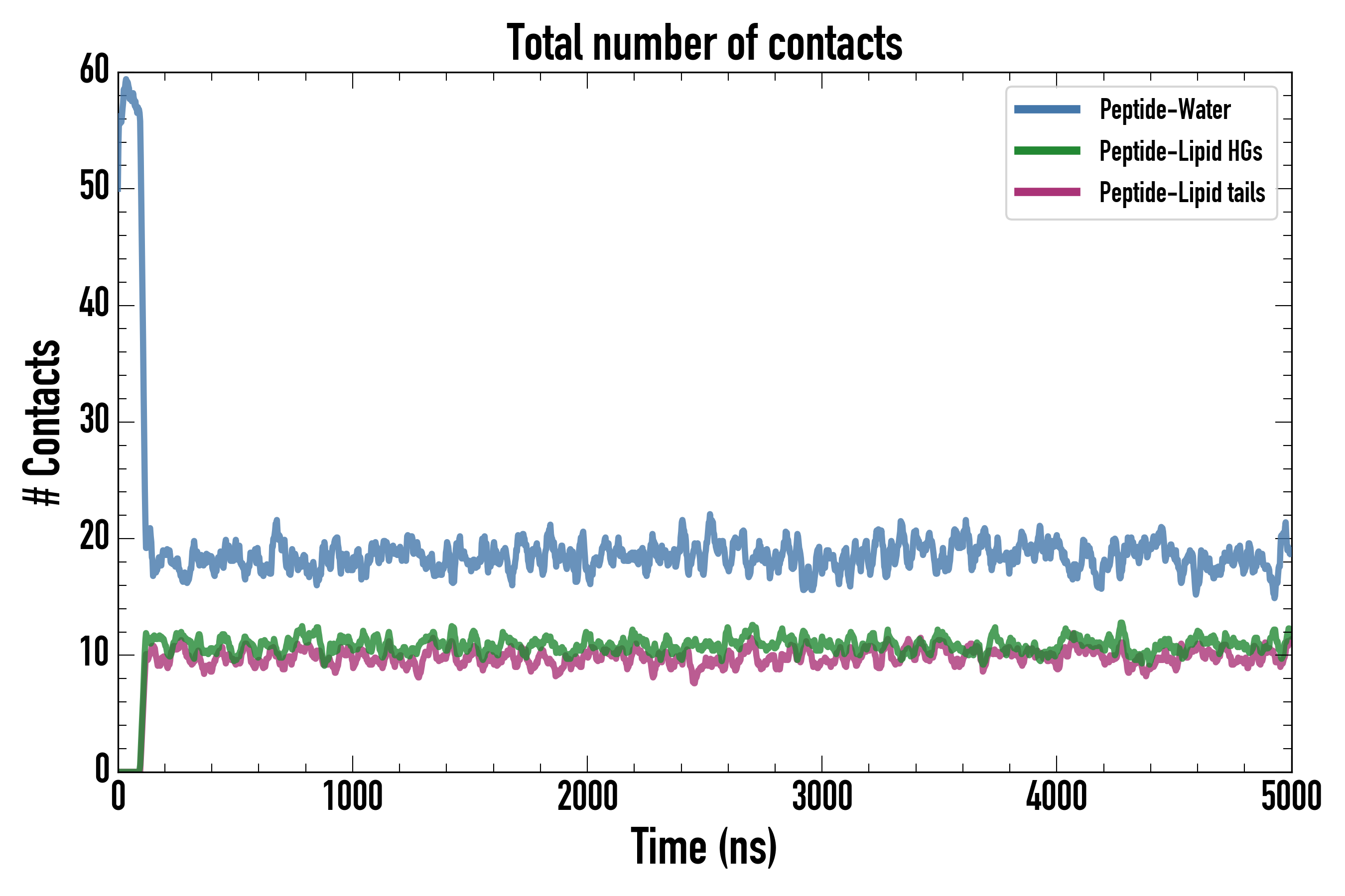 Number of contacts between each residue of the peptide backbone and the different lipid types, averaged over the last microsecond and using a cut-off of 0.6 nm.