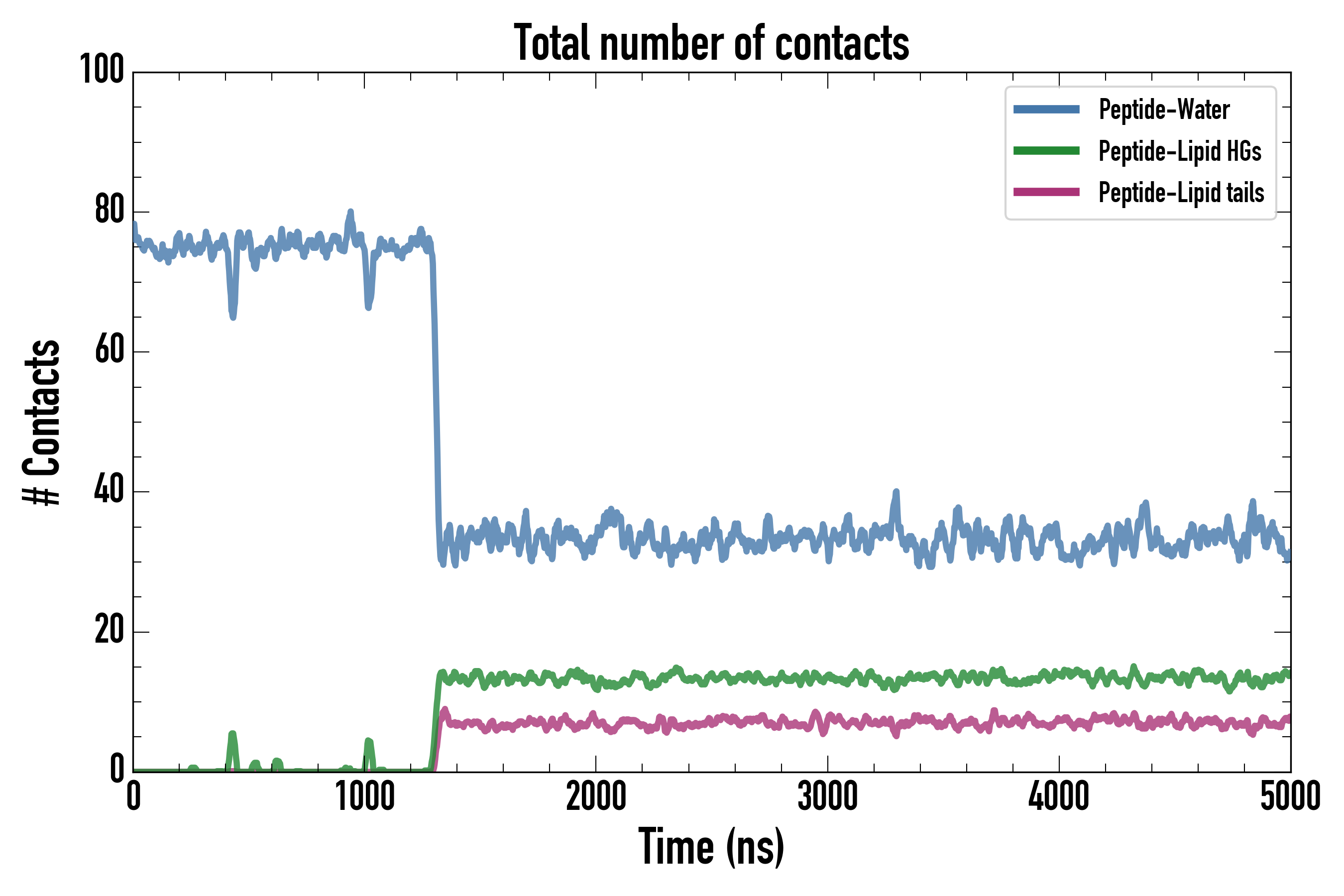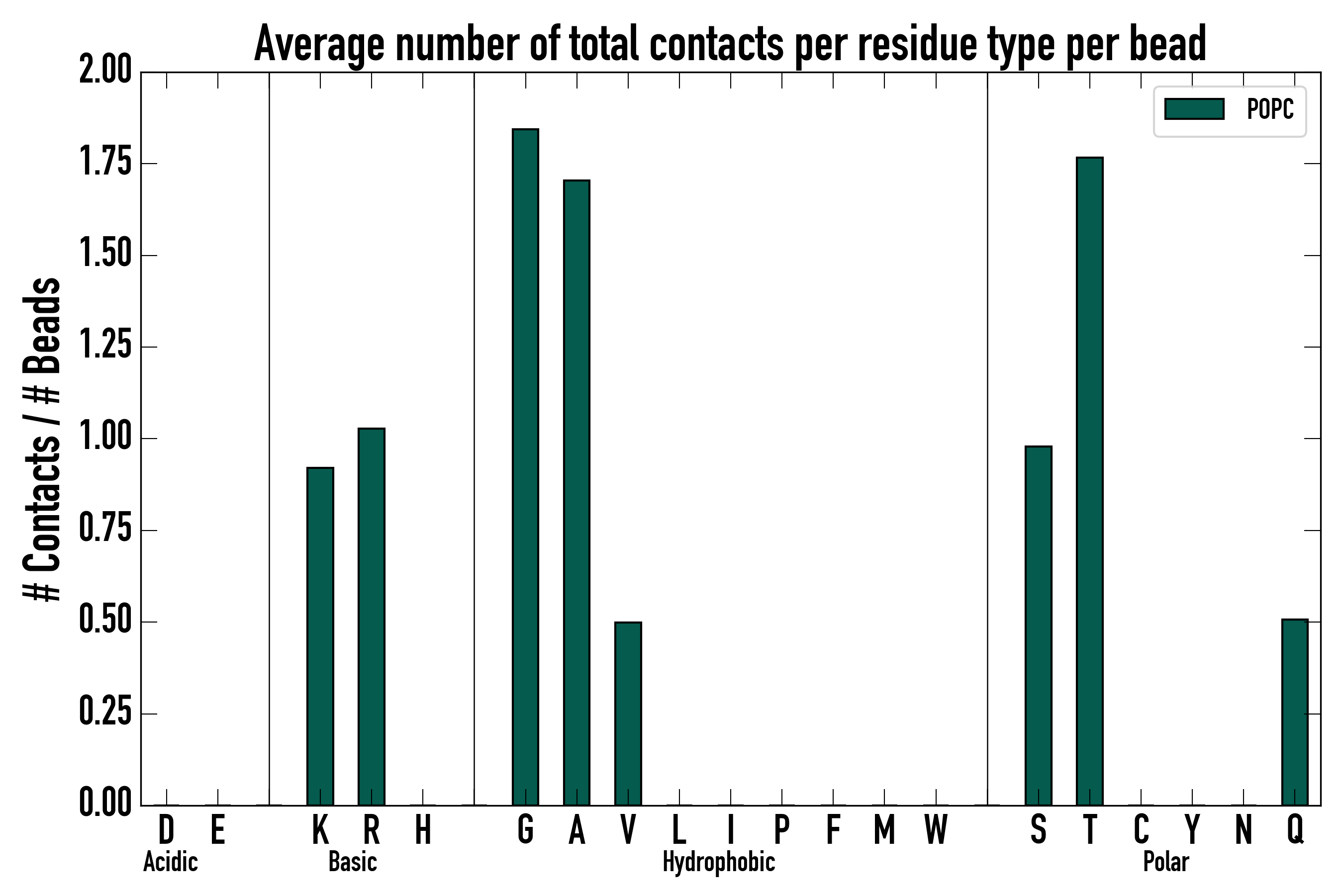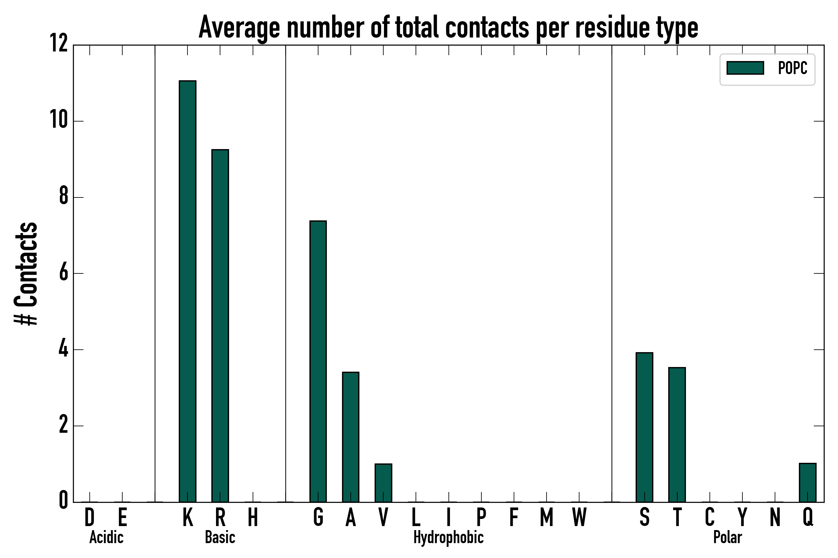 Number of contacts between each residue of the peptide backbone and the different lipid types, averaged over the last microsecond and using a cut-off of 0.6 nm.