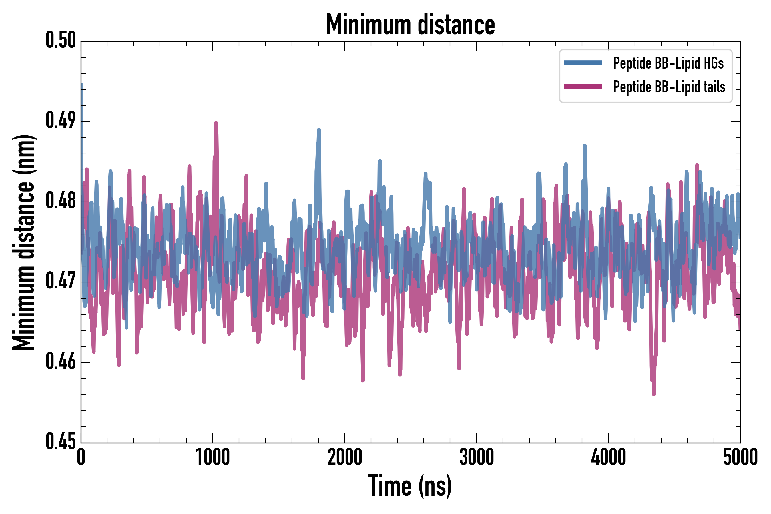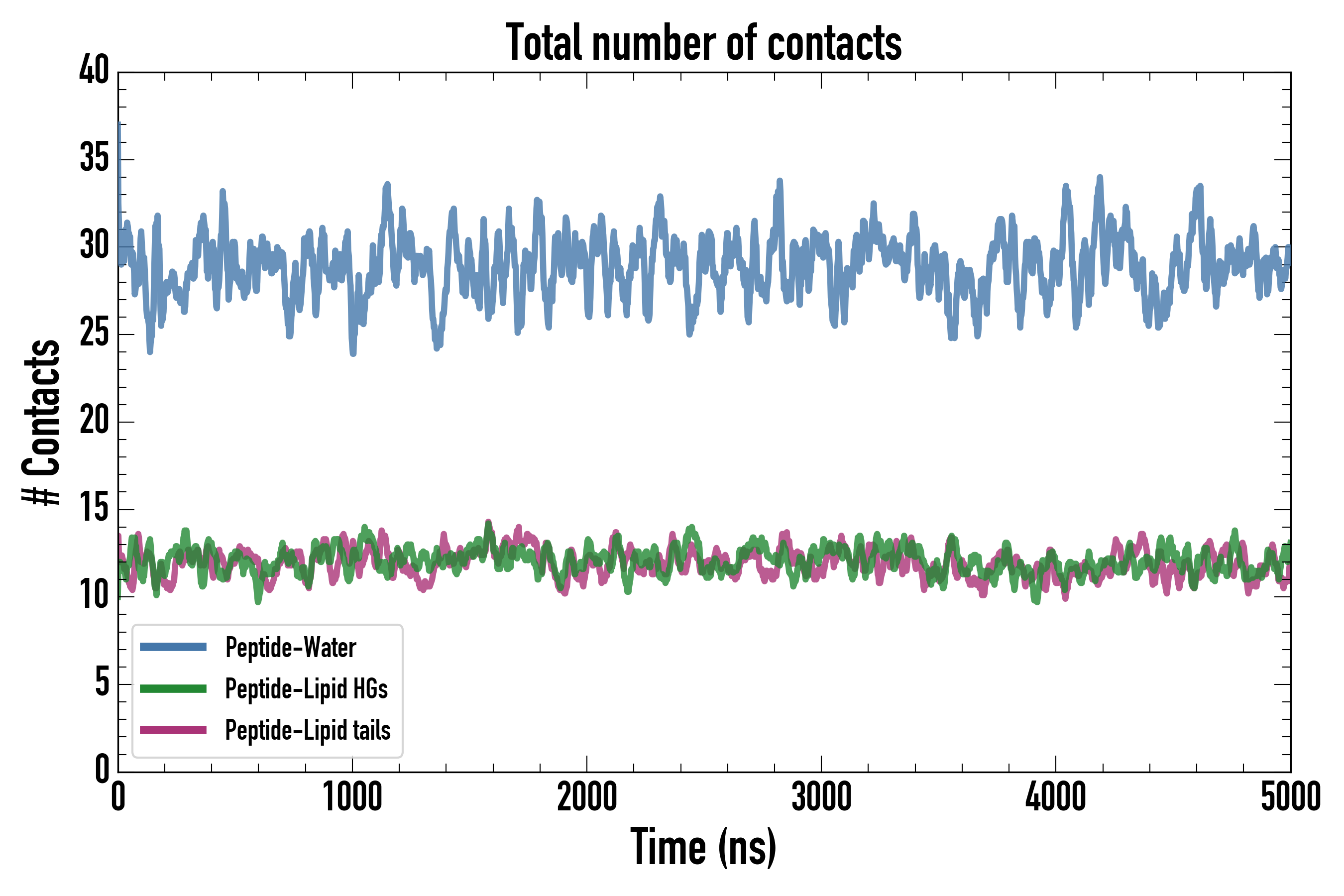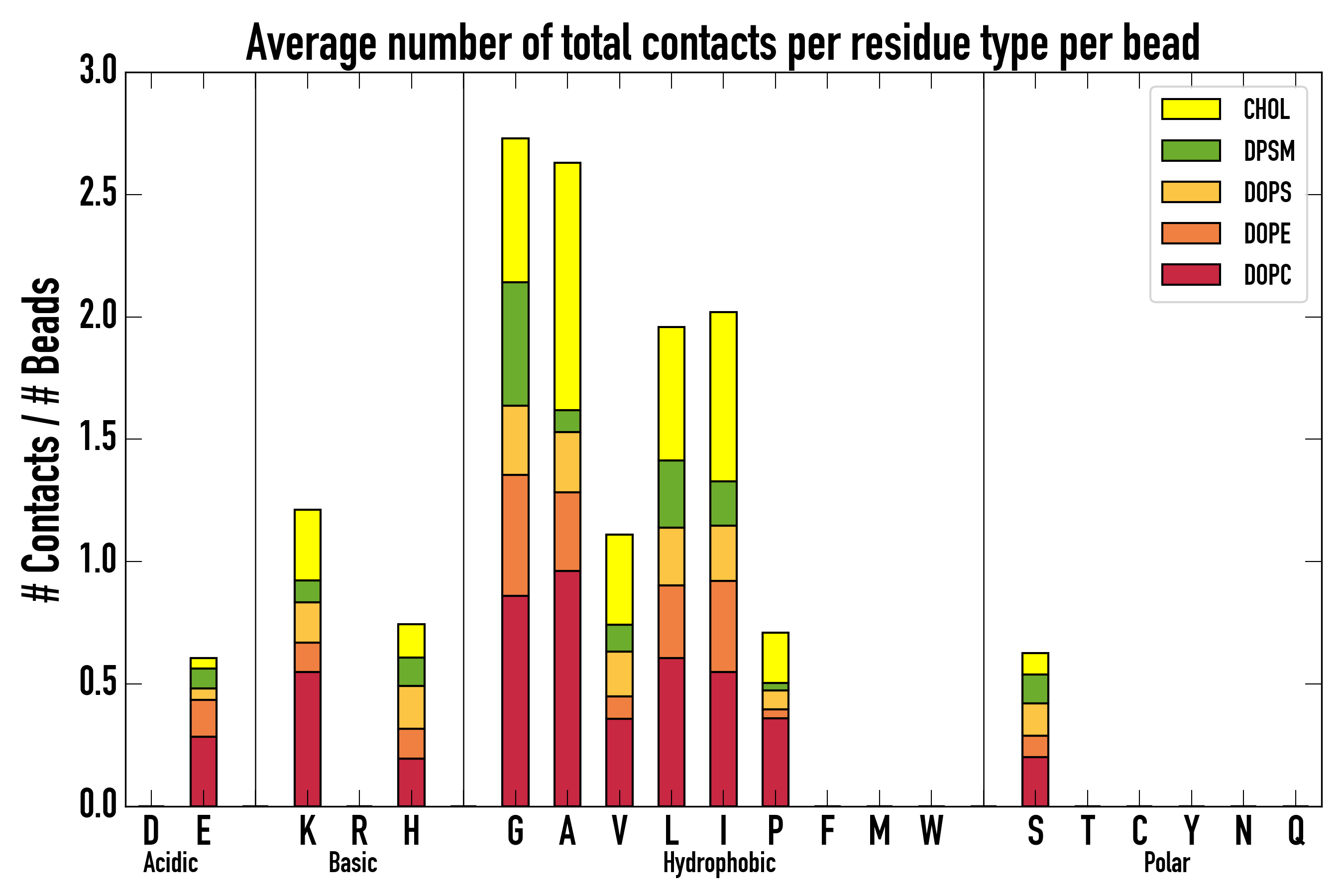 Number of contacts between each residue of the peptide backbone and the different lipid types, averaged over the last microsecond and using a cut-off of 0.6 nm.