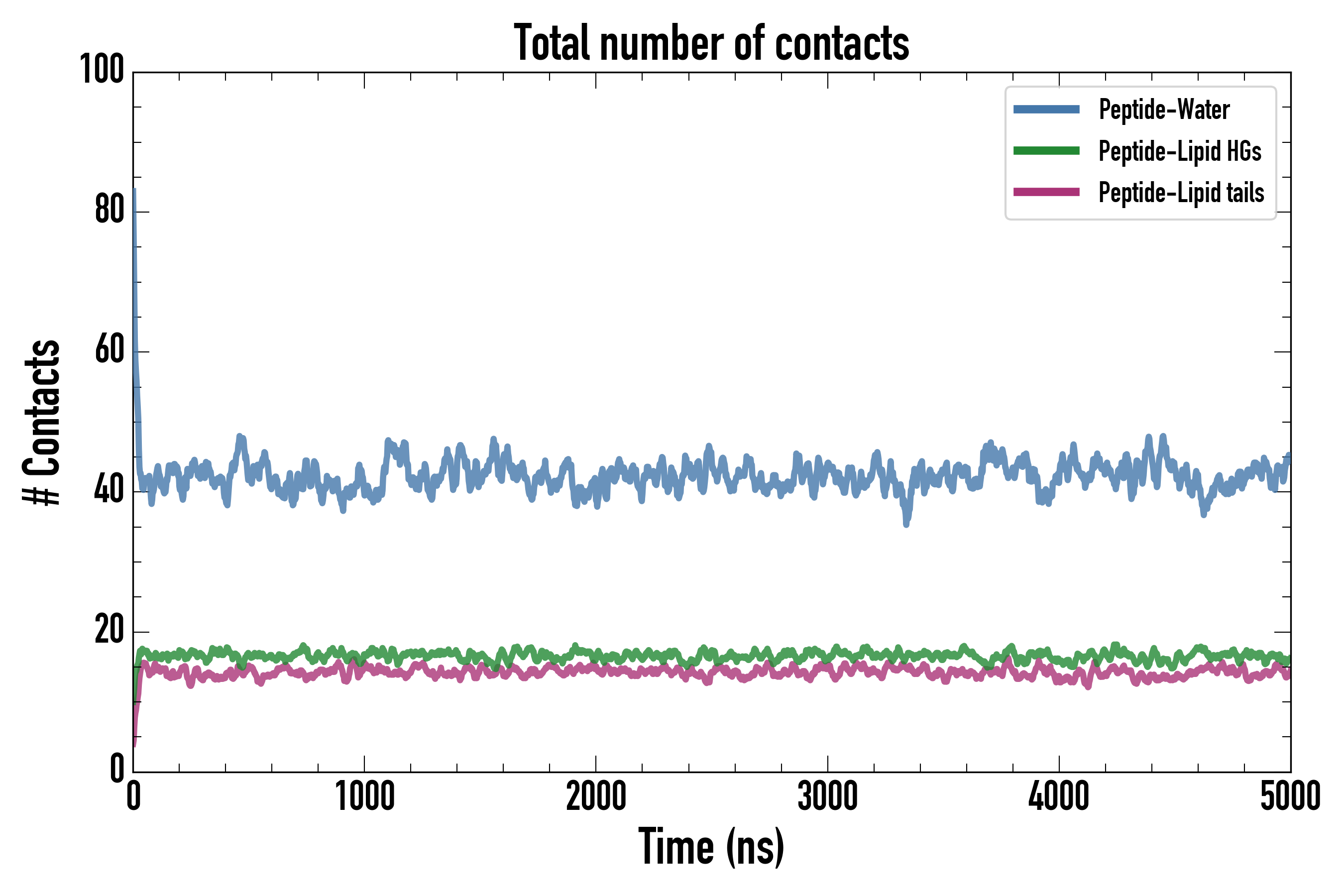 Number of contacts between each residue of the peptide backbone and the different lipid types, averaged over the last microsecond and using a cut-off of 0.6 nm.