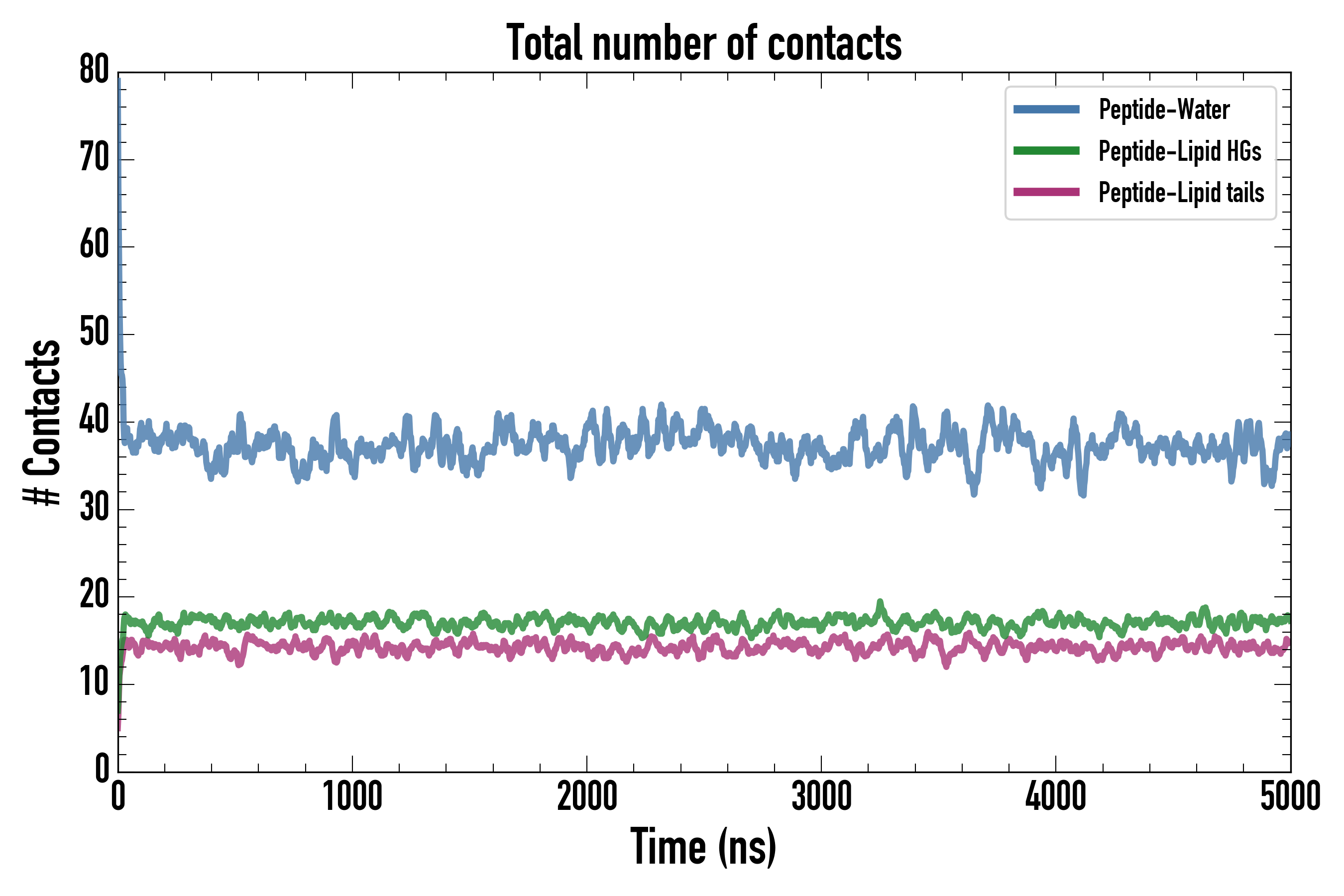 Number of contacts between each residue of the peptide backbone and the different lipid types, averaged over the last microsecond and using a cut-off of 0.6 nm.