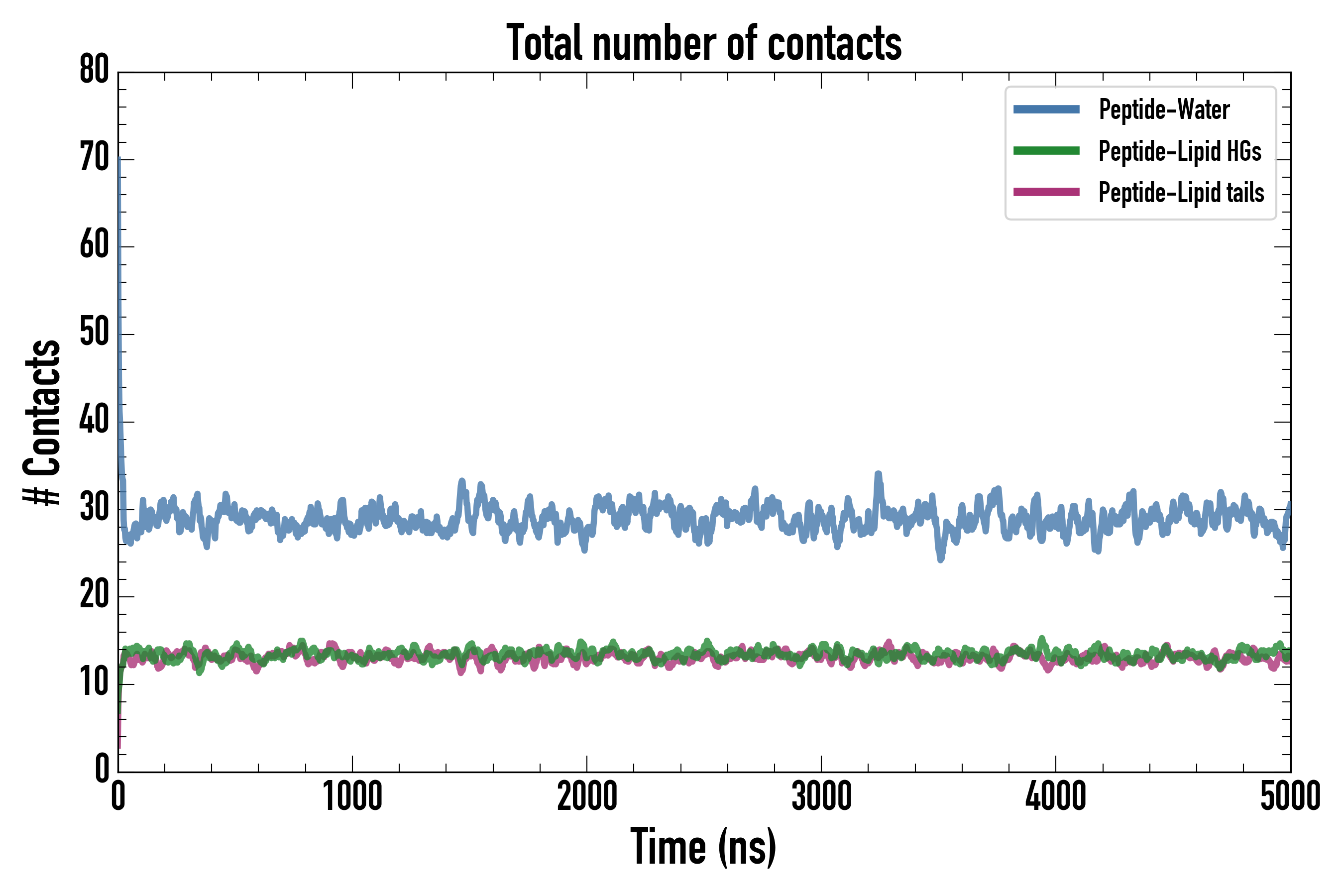 Number of contacts between each residue of the peptide backbone and the different lipid types, averaged over the last microsecond and using a cut-off of 0.6 nm.