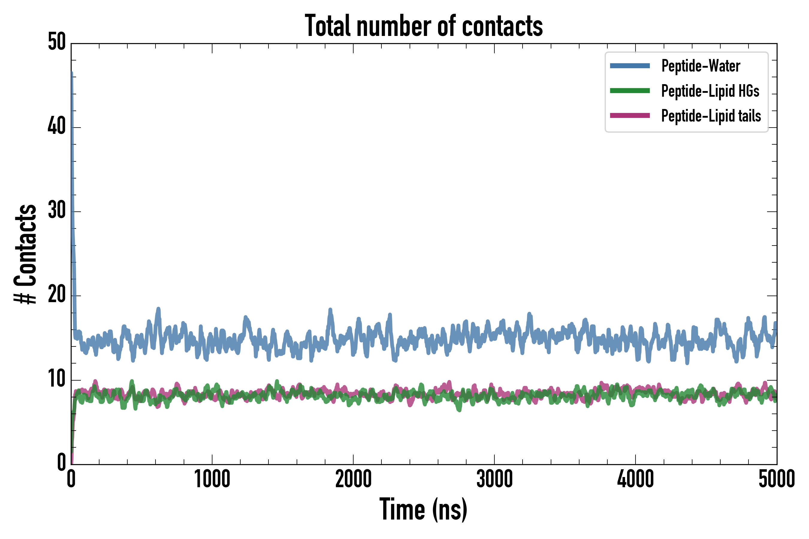 Number of contacts between each residue of the peptide backbone and the different lipid types, averaged over the last microsecond and using a cut-off of 0.6 nm.