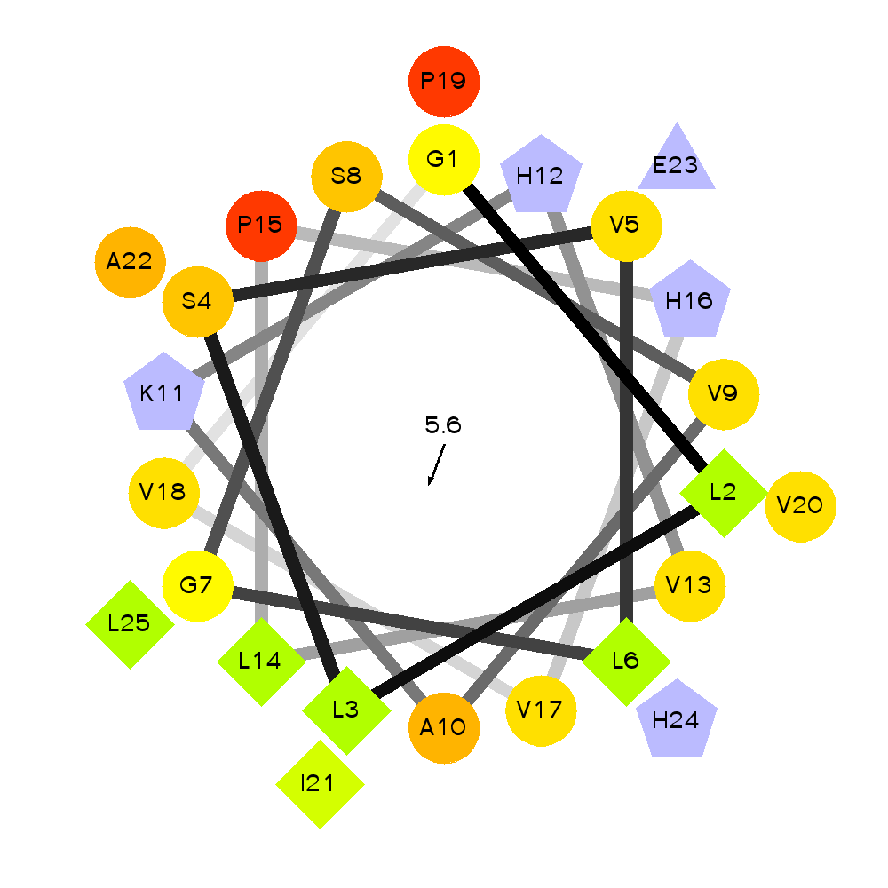 By amino acid: Basic: 4 Acidic: 1 Hydrophobic: 18 Polar: 2 Electrostatic Dipolar Moment (e nm): 6.07