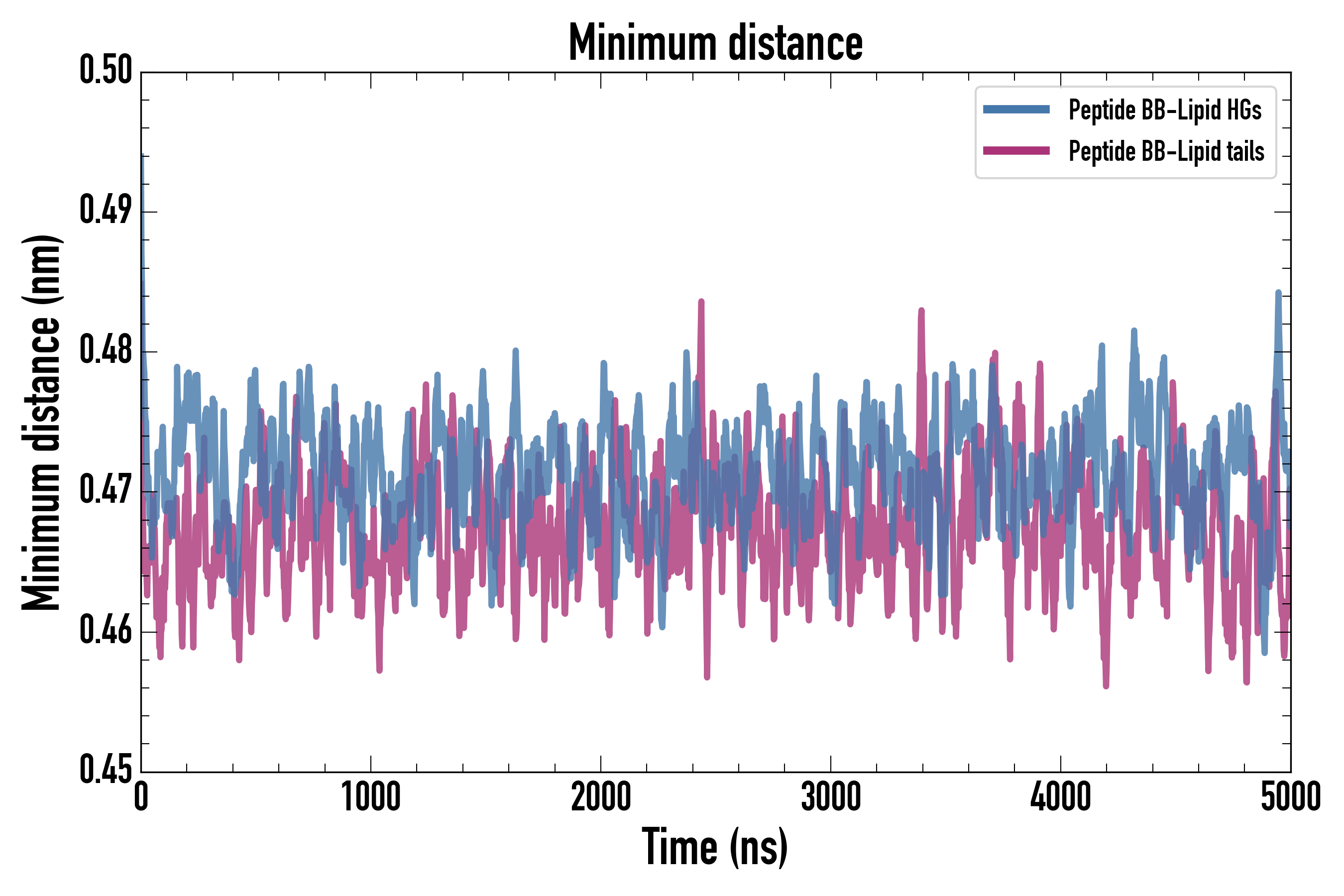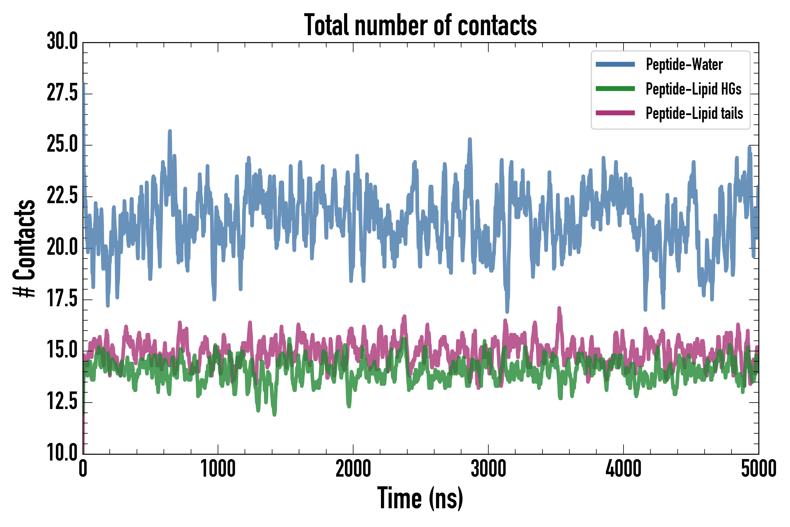 Number of contacts between each residue of the peptide backbone and the different lipid types, averaged over the last microsecond and using a cut-off of 0.6 nm.