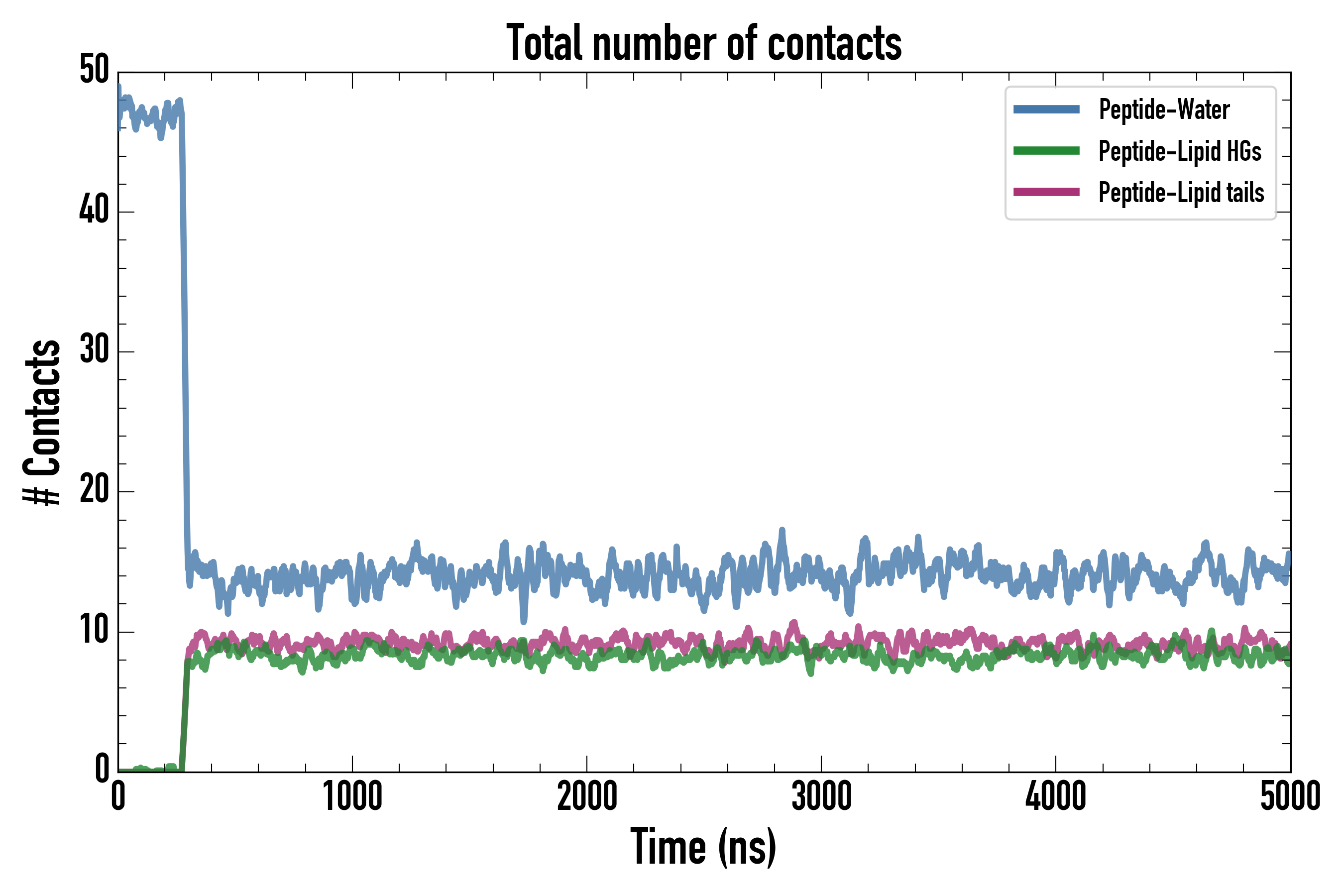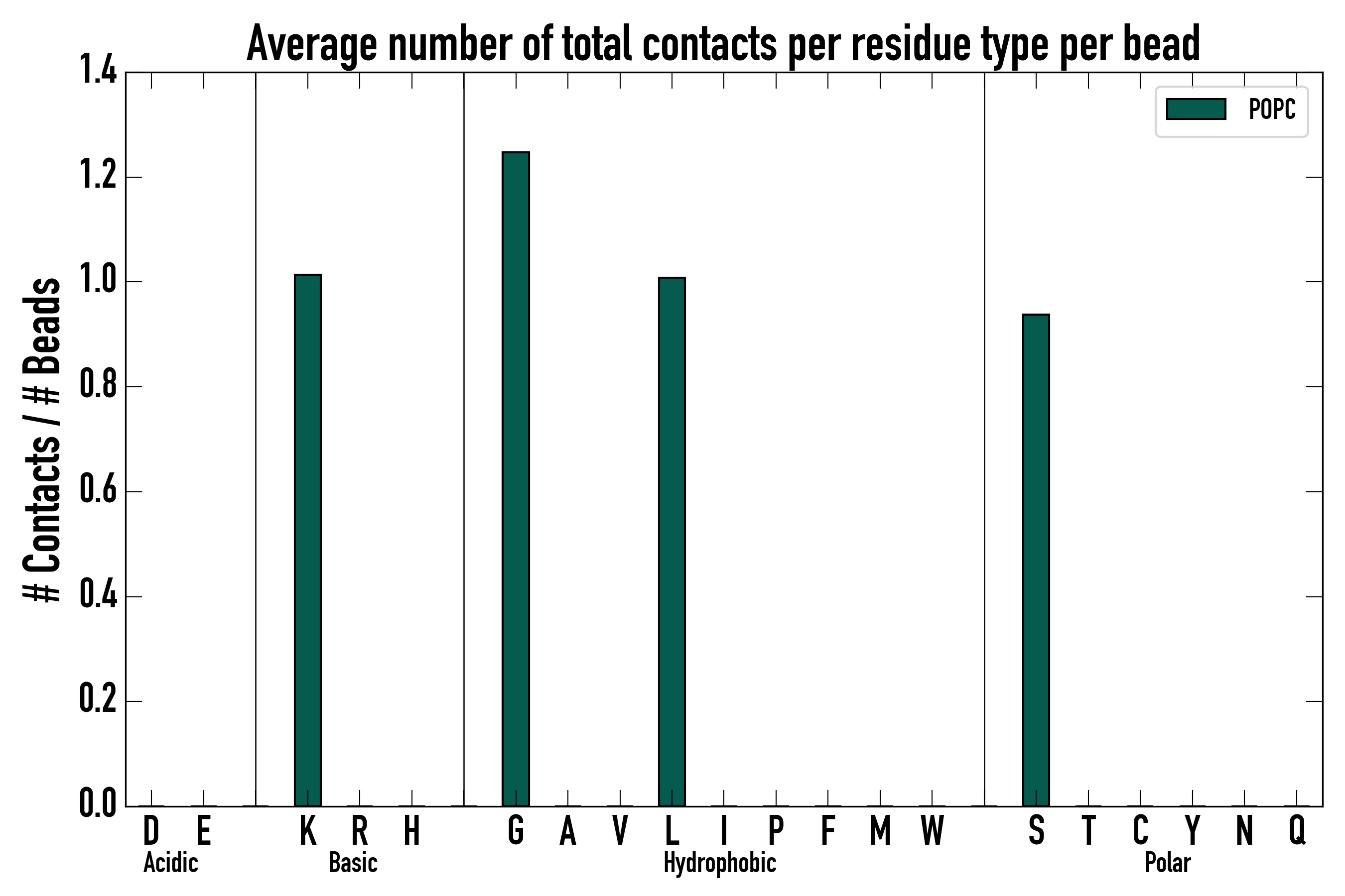 Number of contacts between each residue of the peptide backbone and the different lipid types, averaged over the last microsecond and using a cut-off of 0.6 nm.