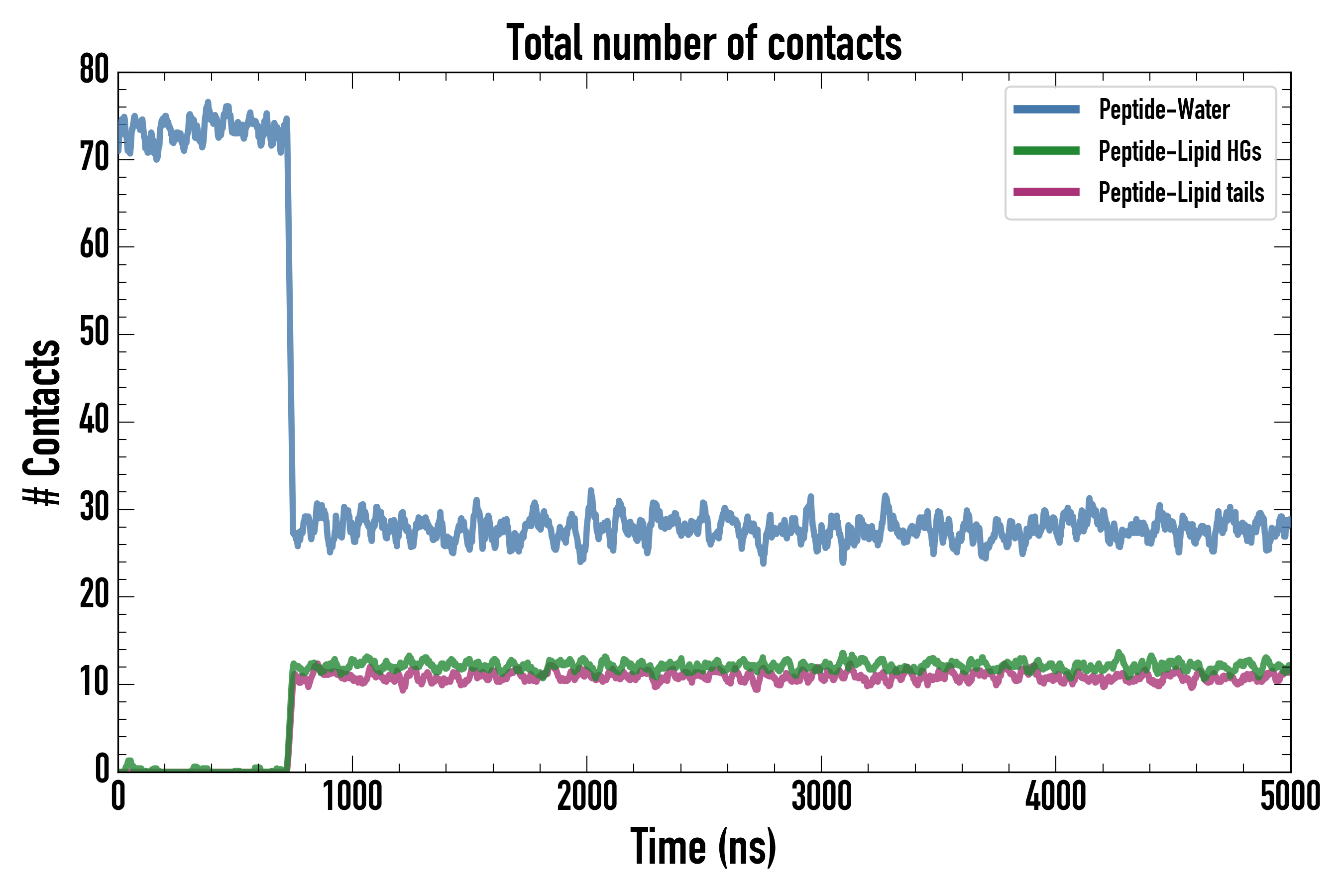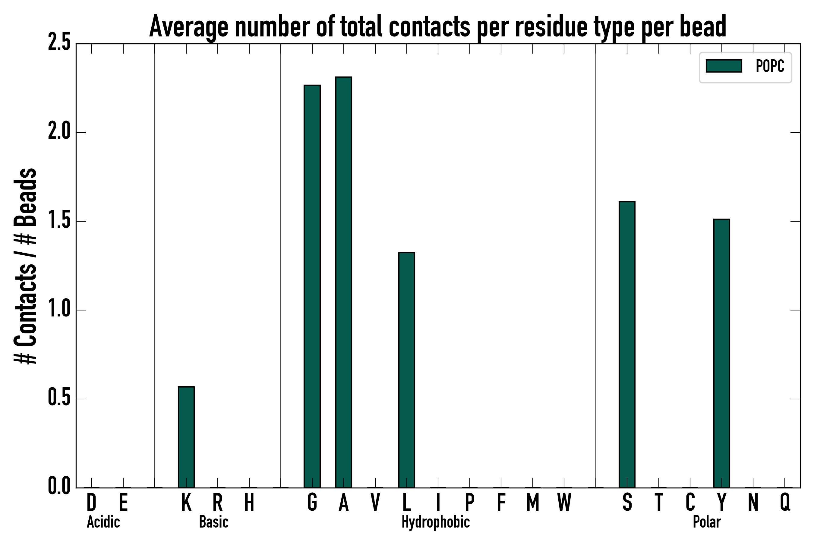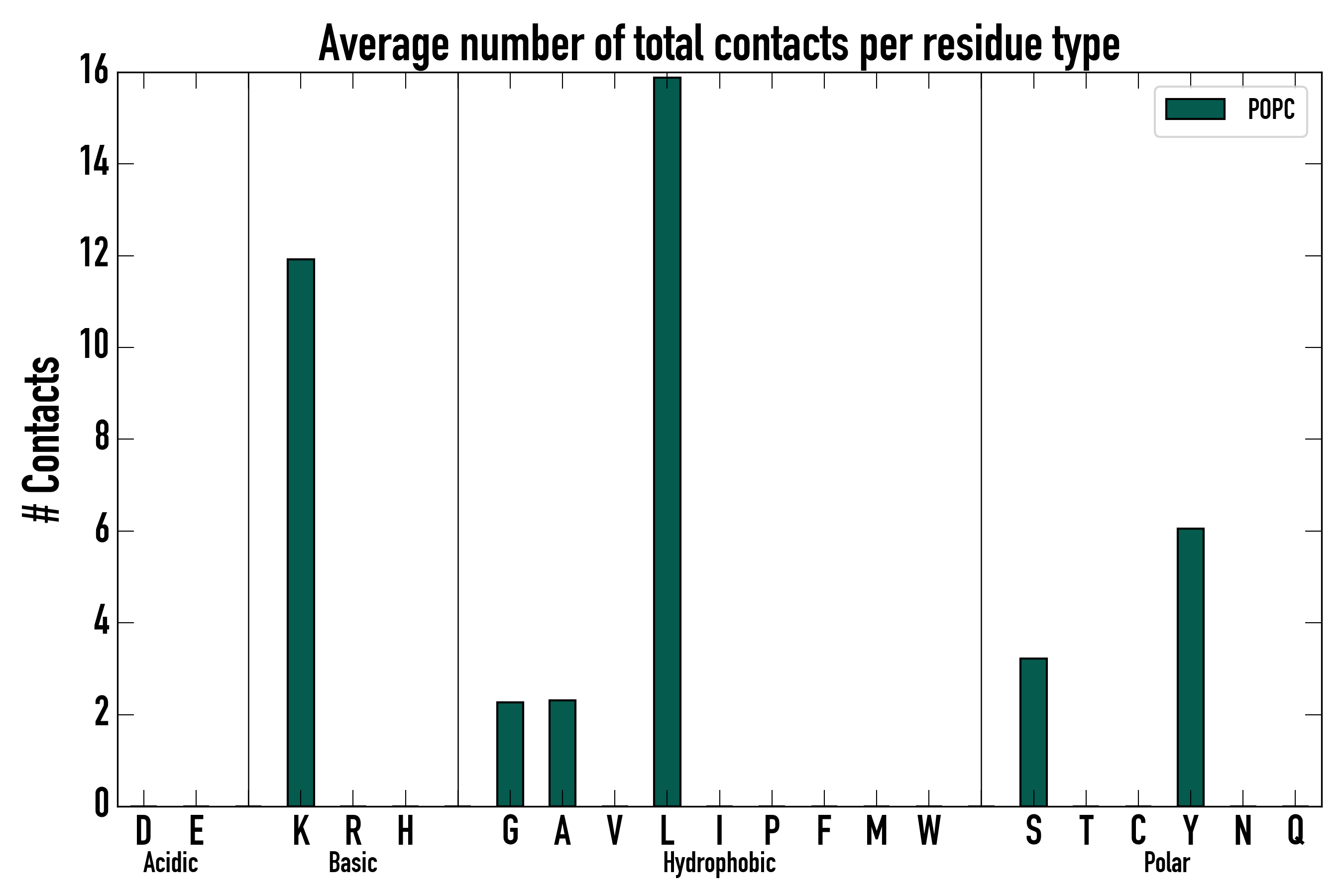 Number of contacts between each residue of the peptide backbone and the different lipid types, averaged over the last microsecond and using a cut-off of 0.6 nm.