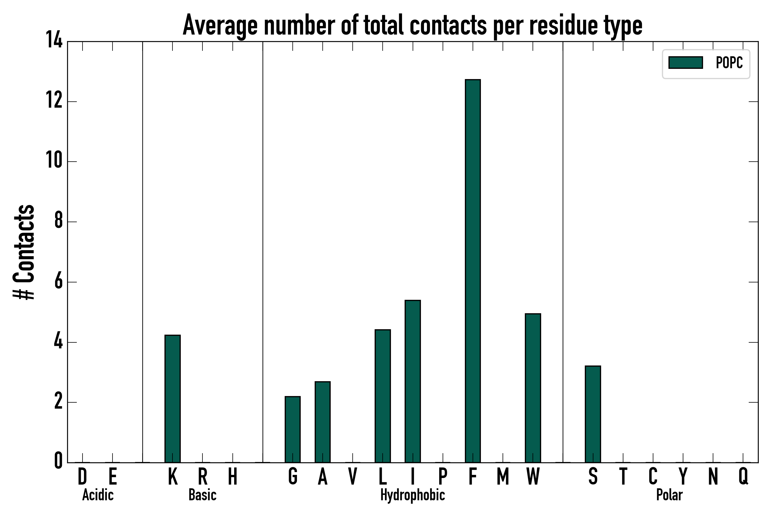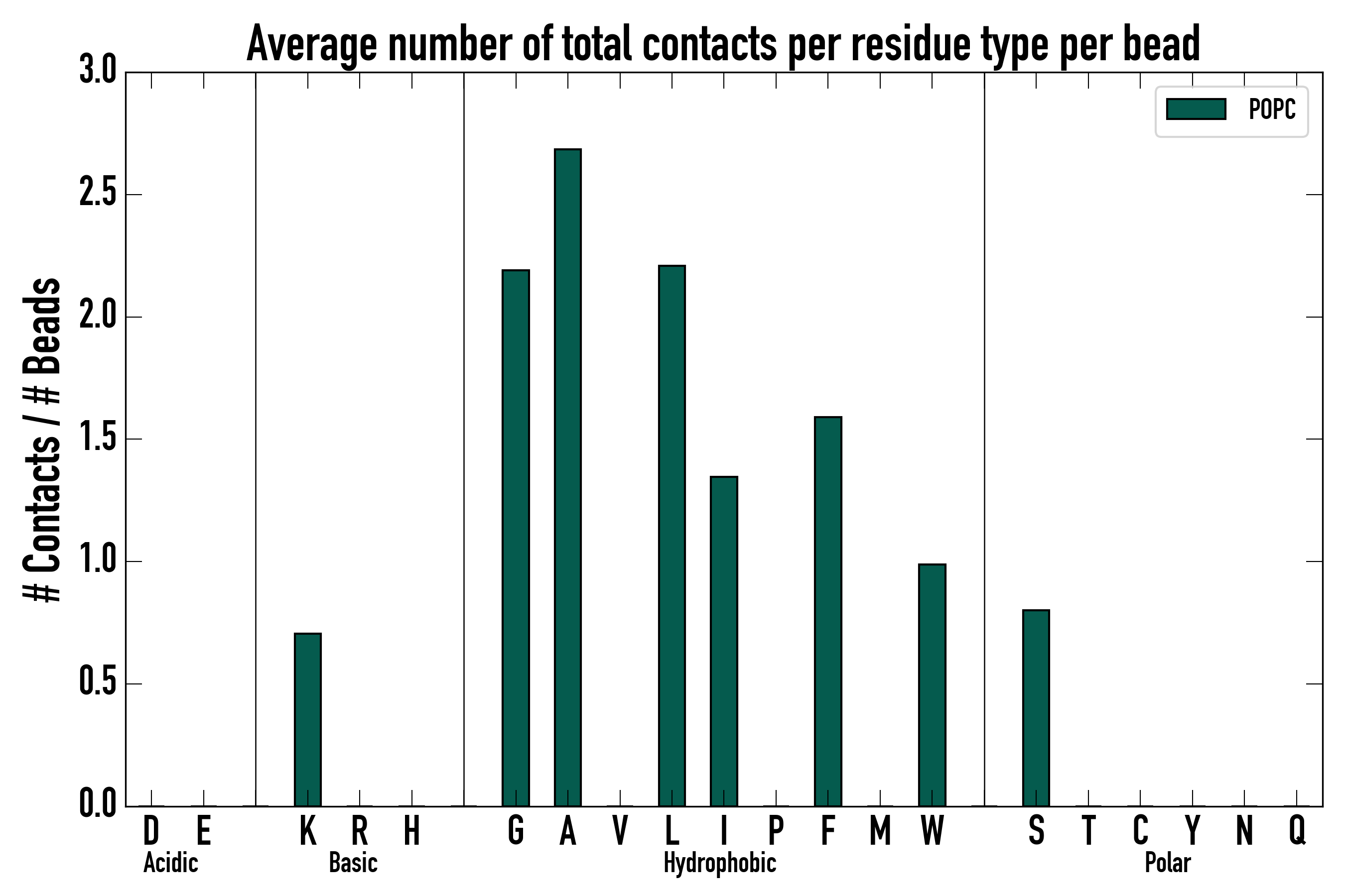Number of contacts between each residue of the peptide backbone and the different lipid types, averaged over the last microsecond and using a cut-off of 0.6 nm.