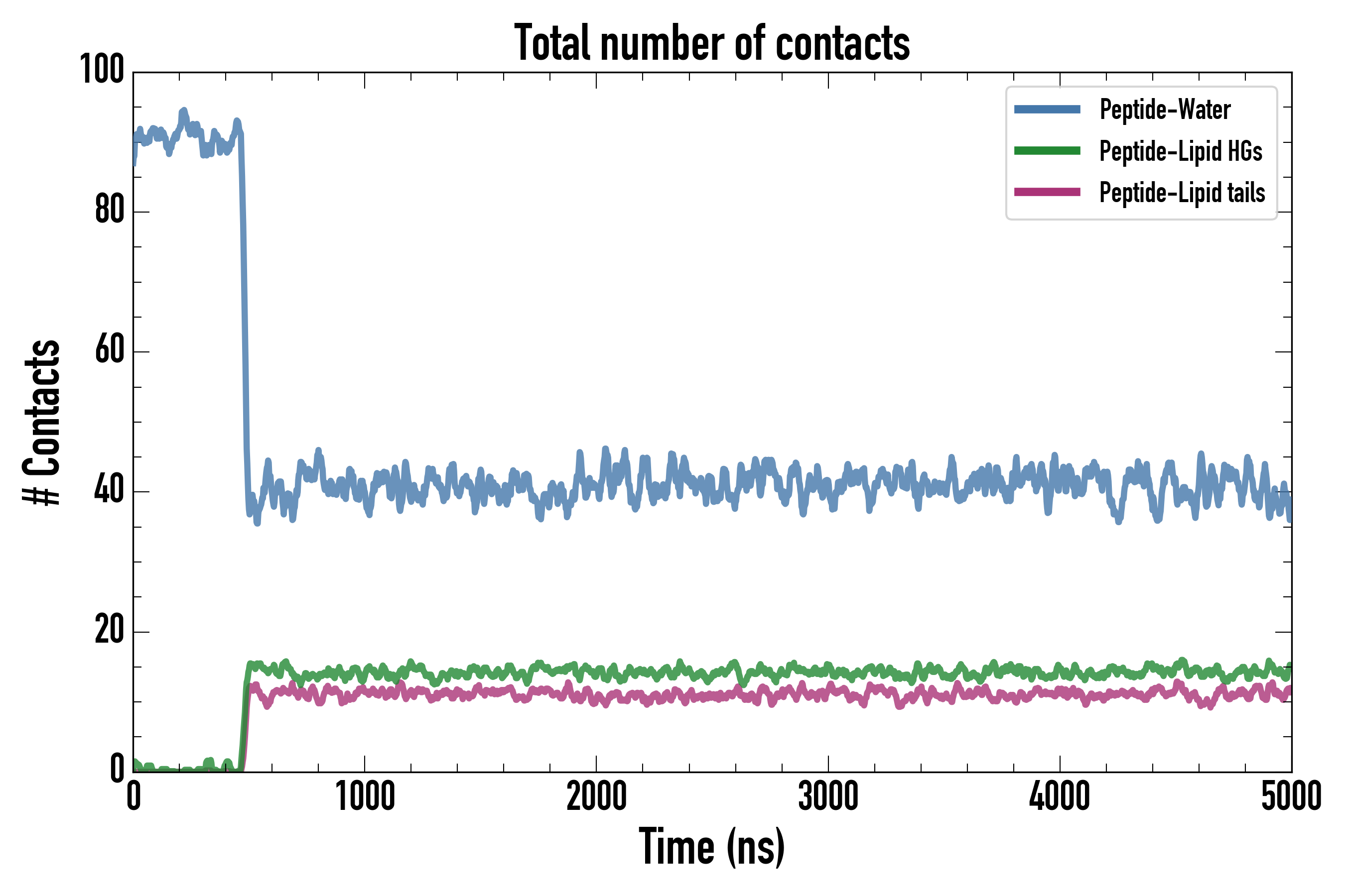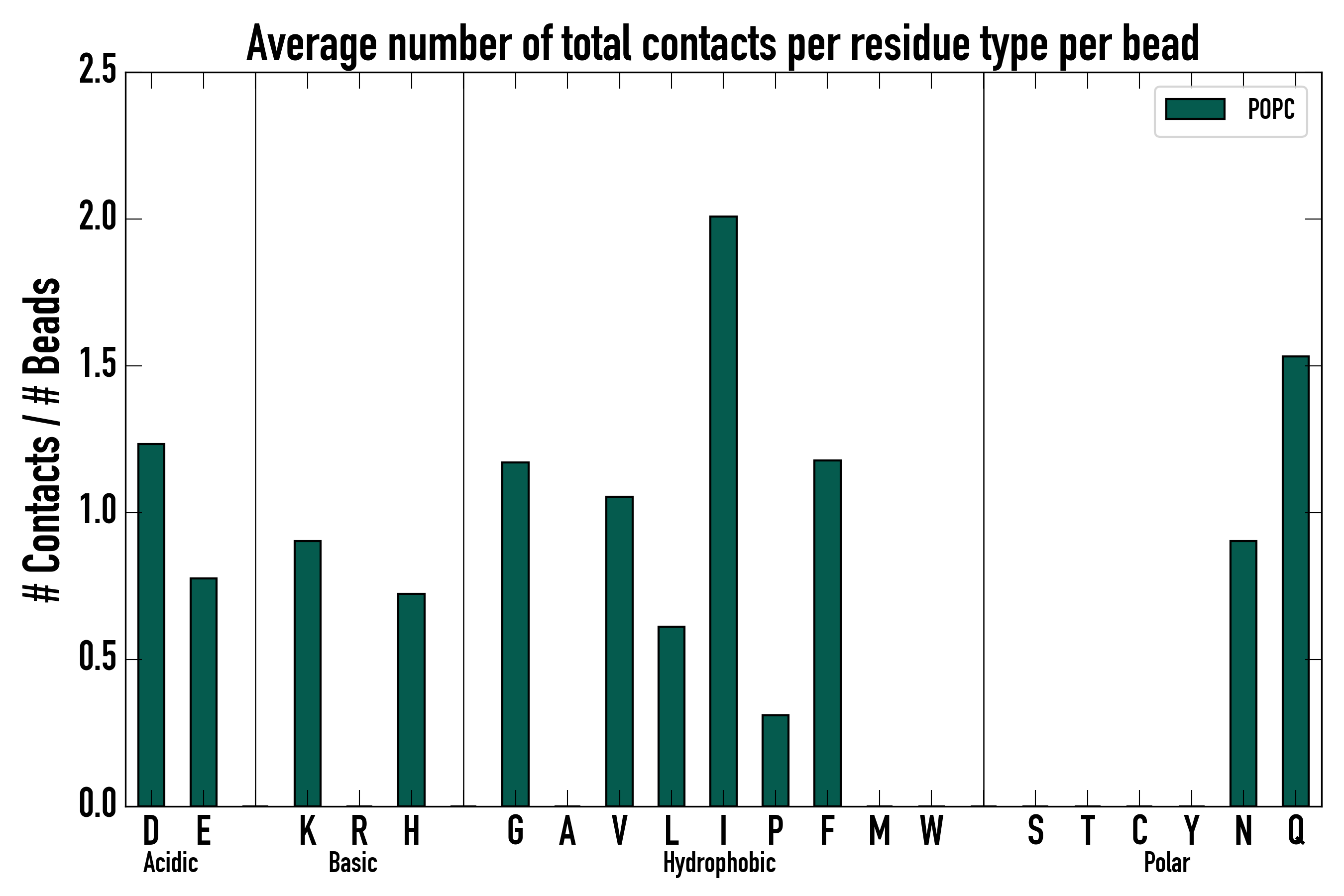 Number of contacts between each residue of the peptide backbone and the different lipid types, averaged over the last microsecond and using a cut-off of 0.6 nm.