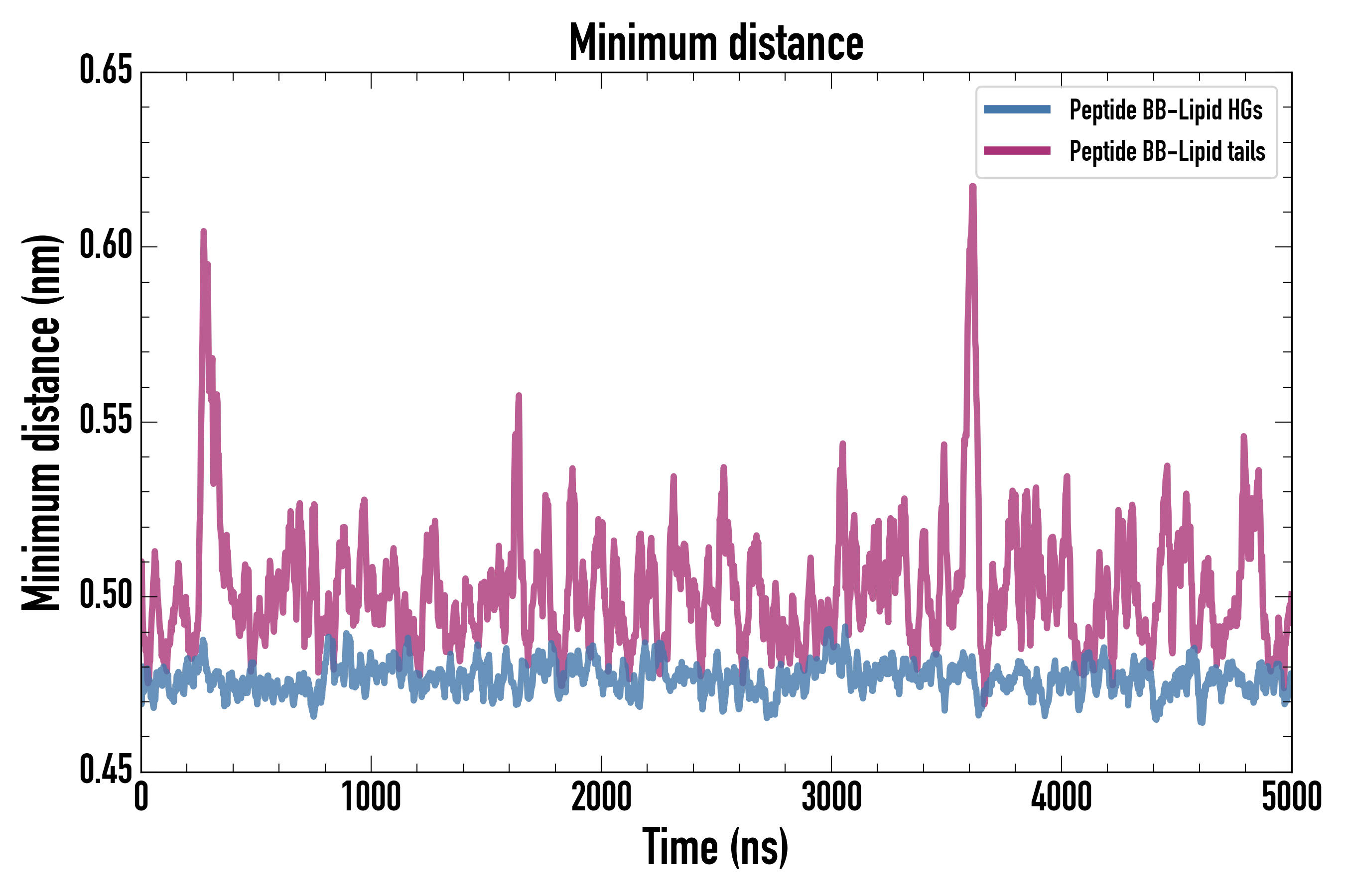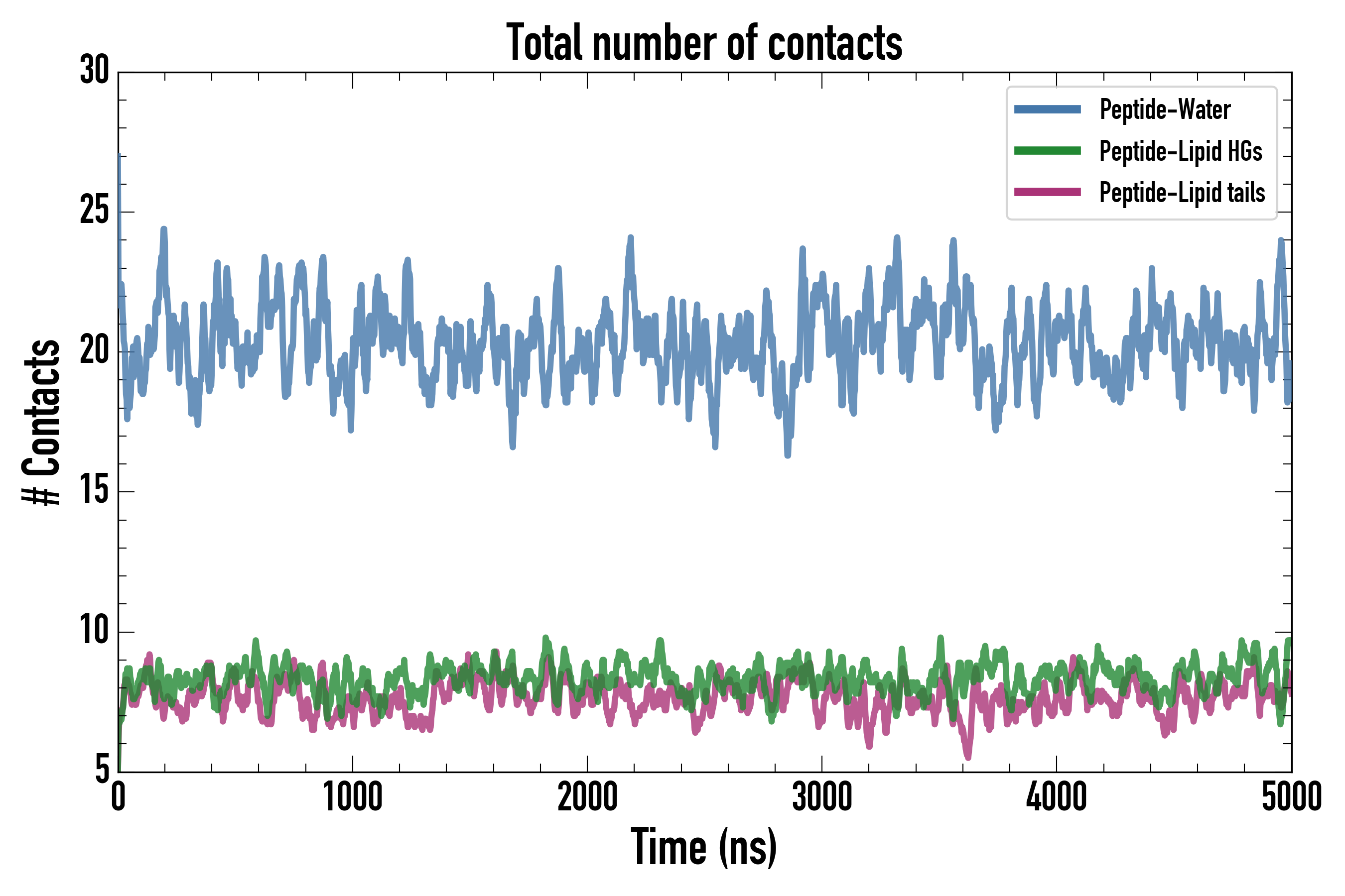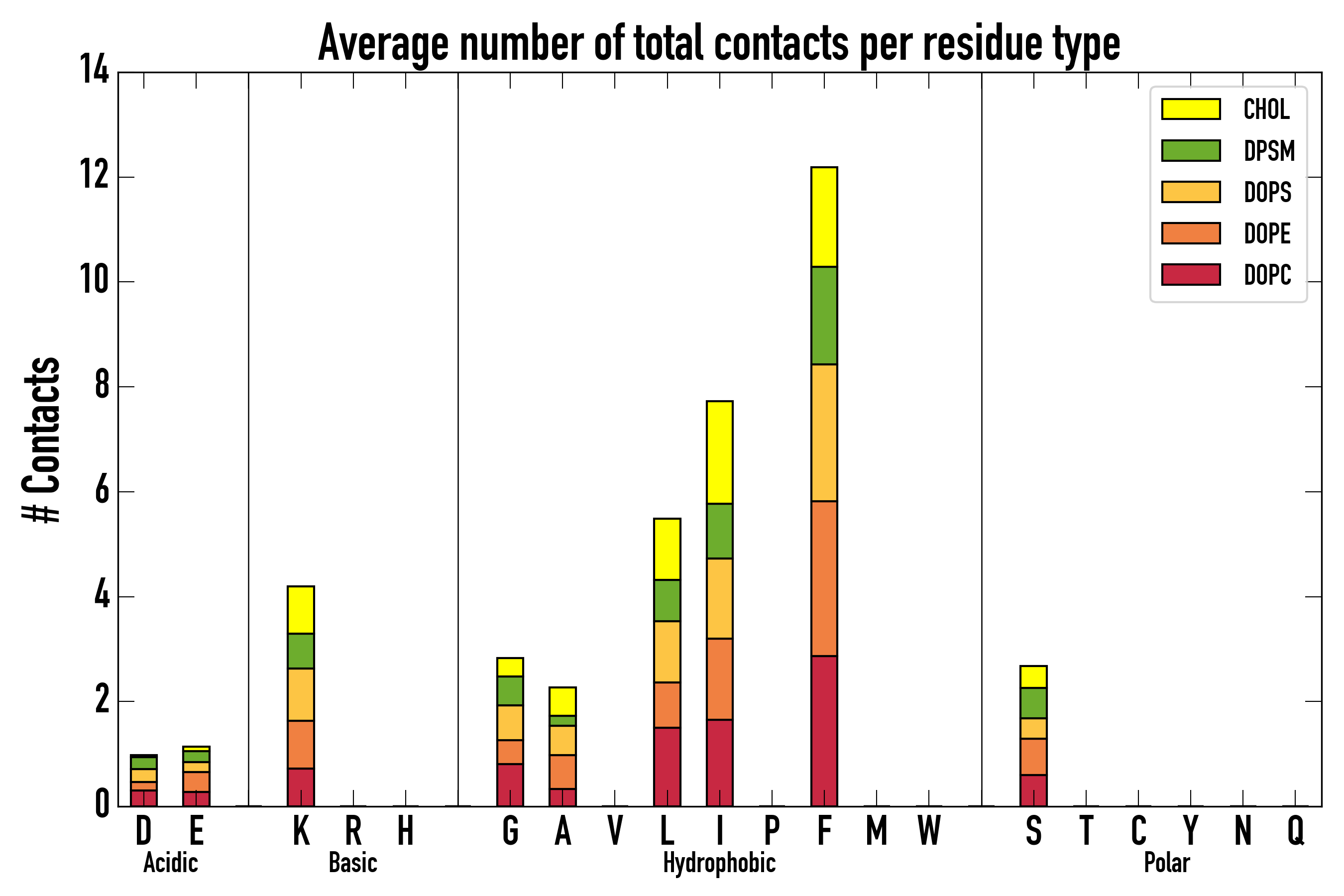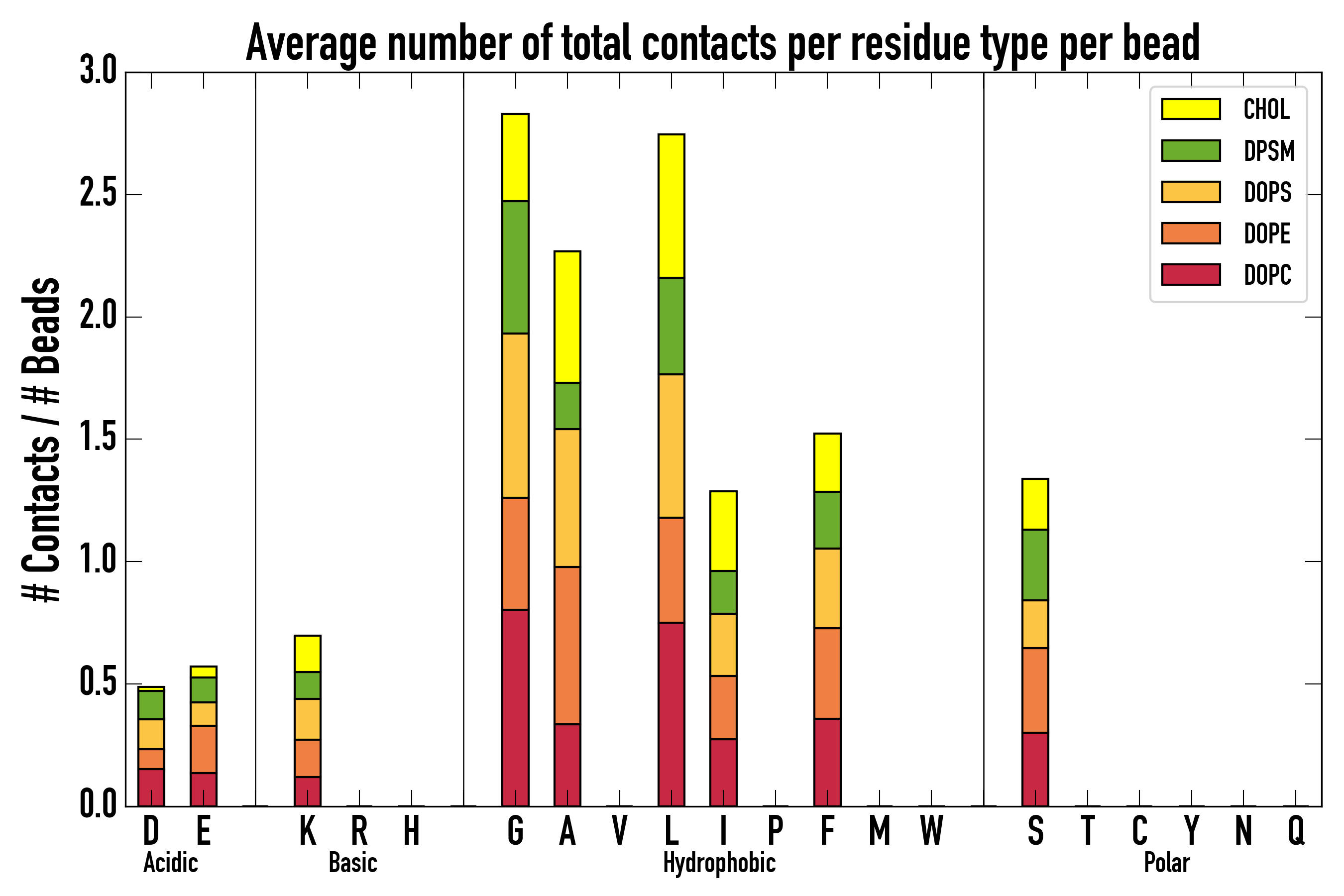 Number of contacts between each residue of the peptide backbone and the different lipid types, averaged over the last microsecond and using a cut-off of 0.6 nm.