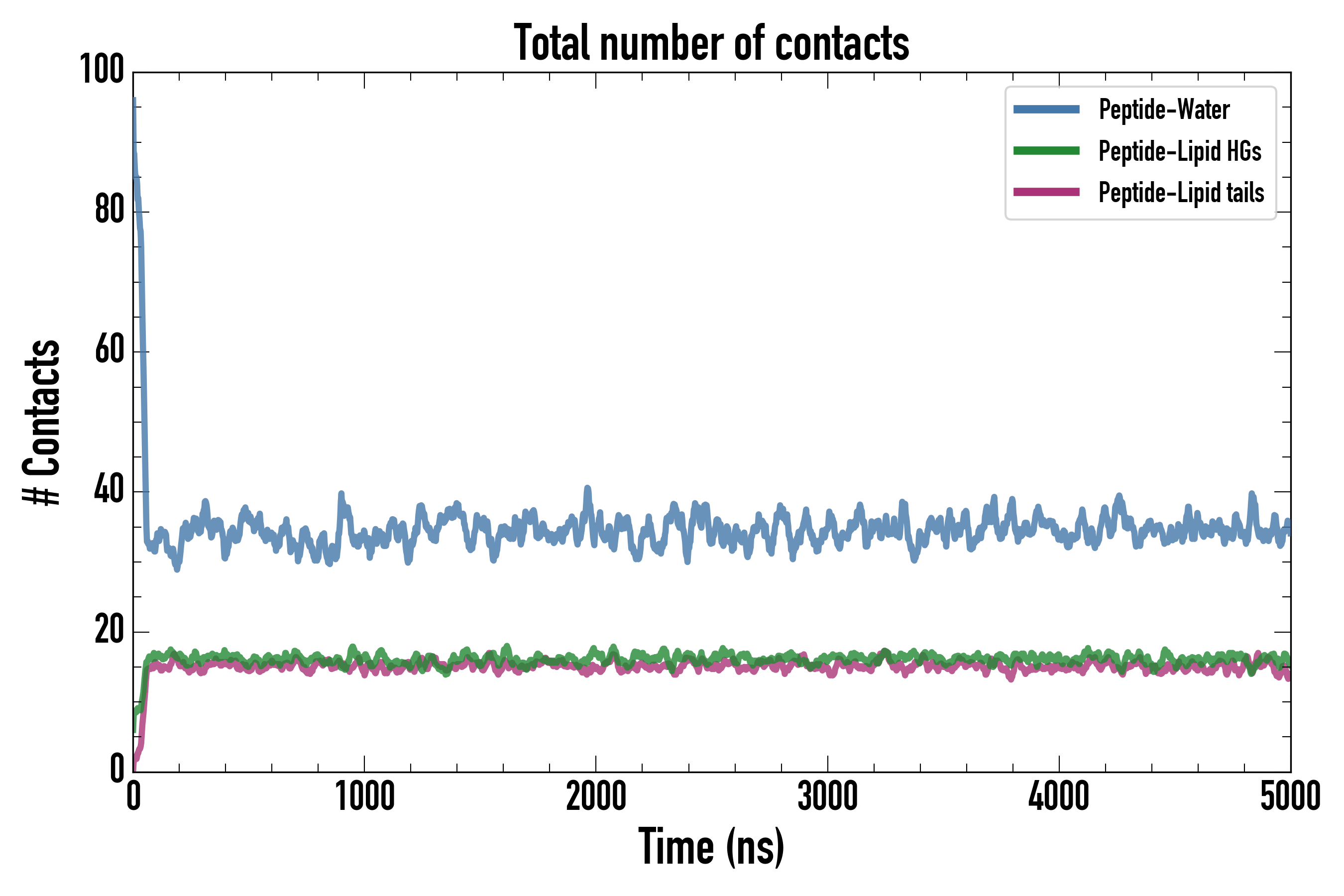 Number of contacts between each residue of the peptide backbone and the different lipid types, averaged over the last microsecond and using a cut-off of 0.6 nm.