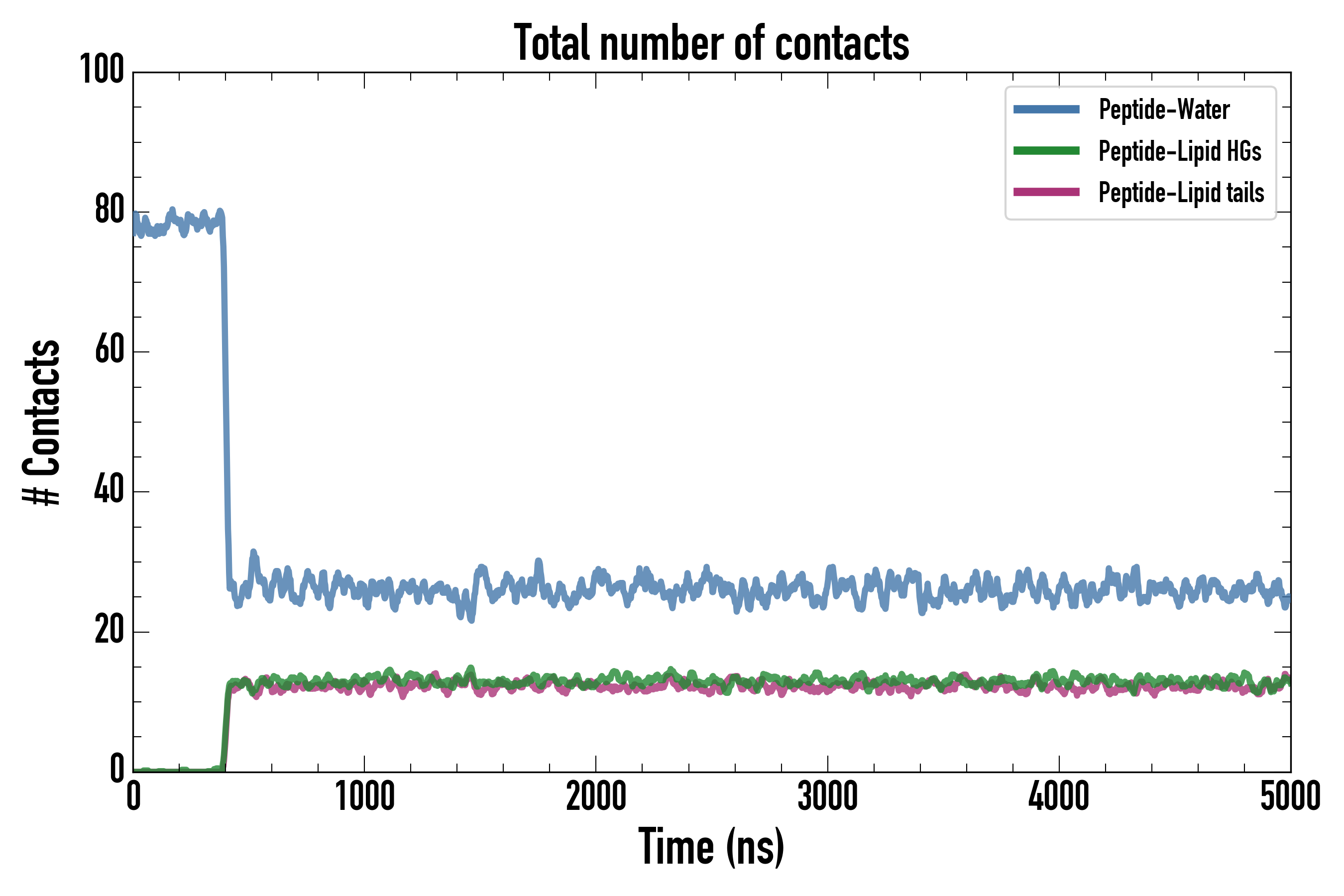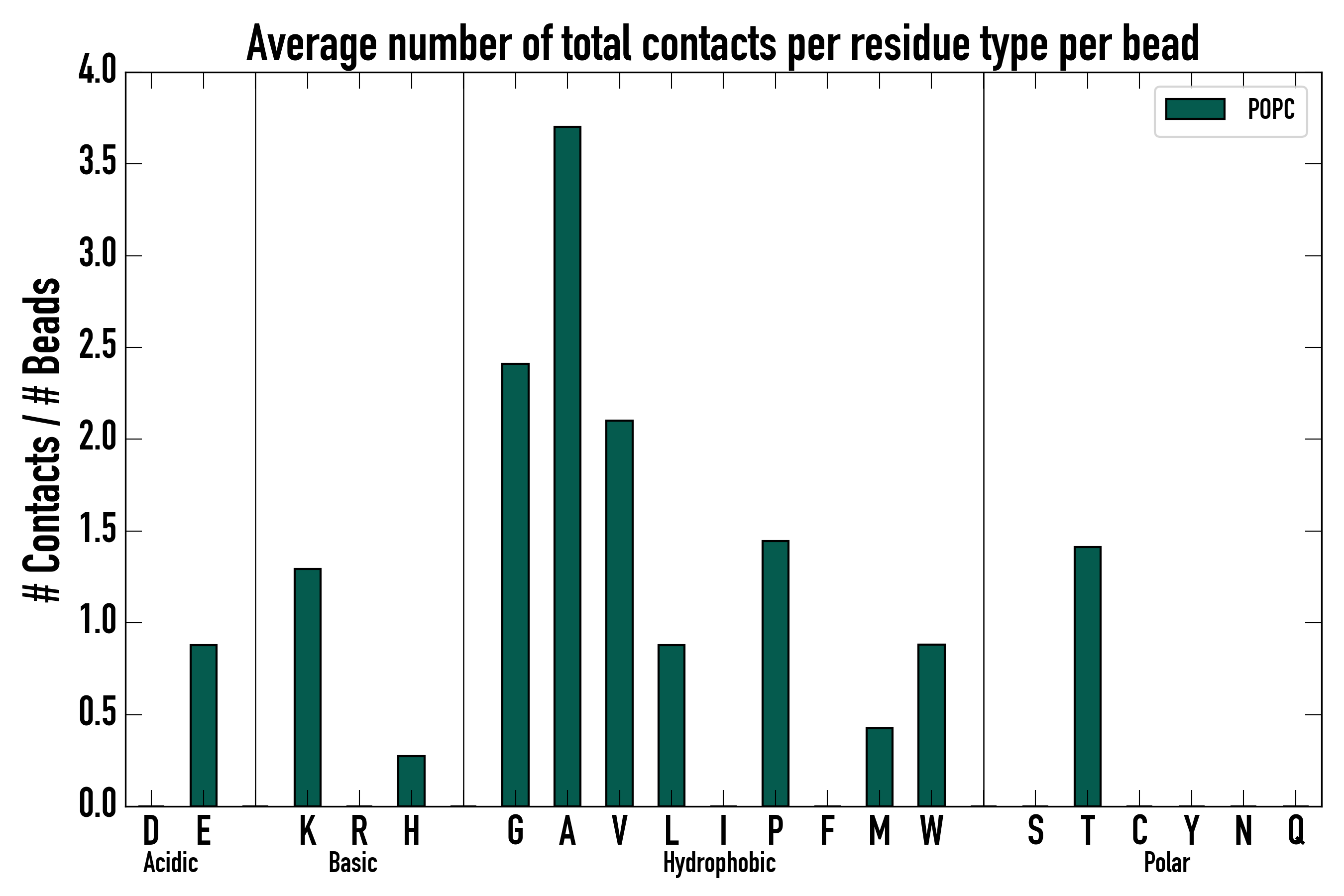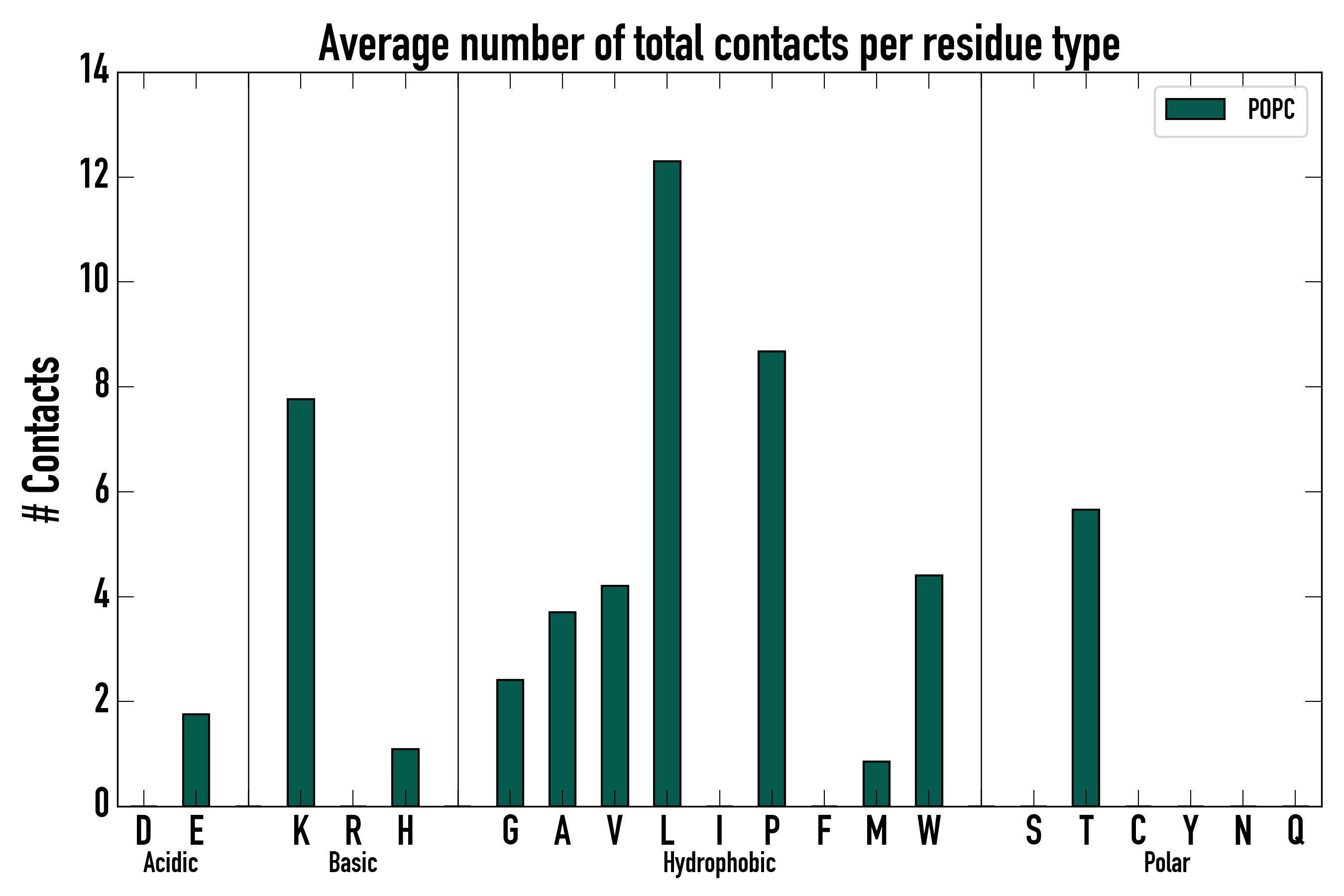 Number of contacts between each residue of the peptide backbone and the different lipid types, averaged over the last microsecond and using a cut-off of 0.6 nm.