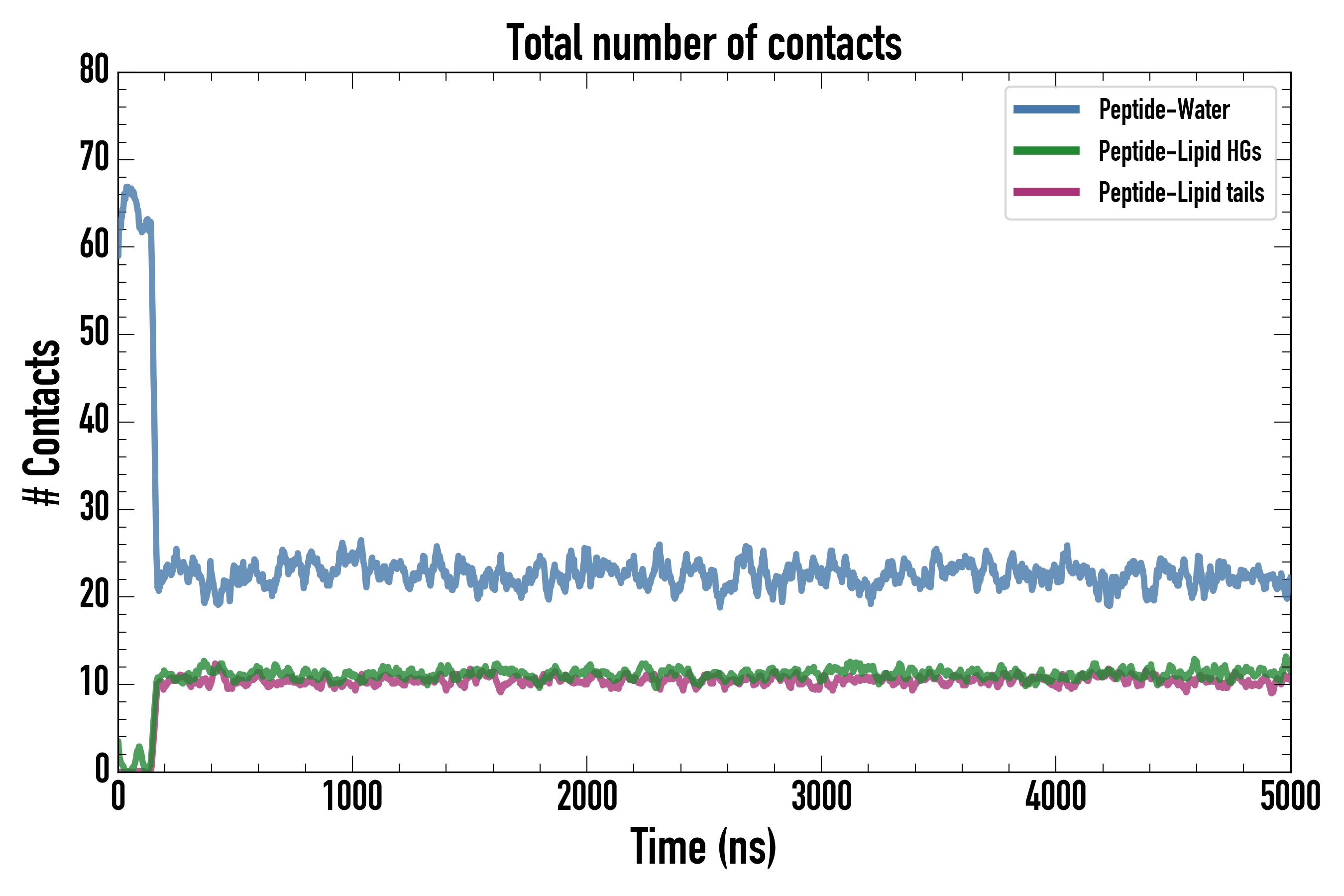 Number of contacts between each residue of the peptide backbone and the different lipid types, averaged over the last microsecond and using a cut-off of 0.6 nm.