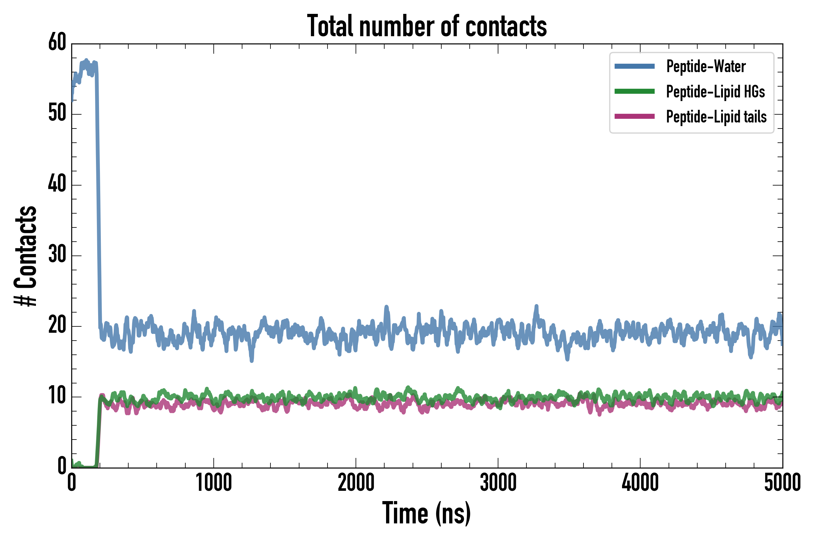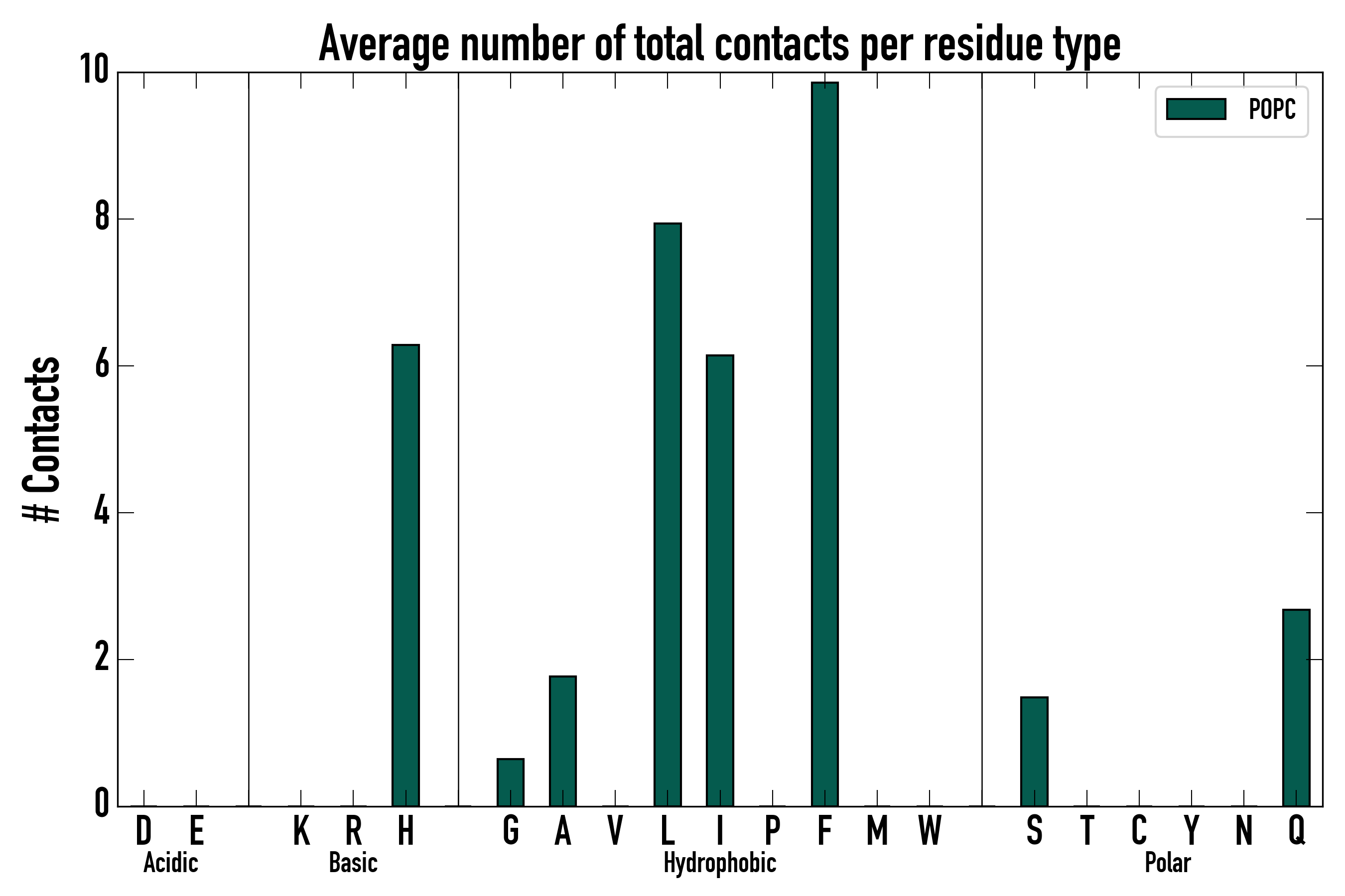 Number of contacts between each residue of the peptide backbone and the different lipid types, averaged over the last microsecond and using a cut-off of 0.6 nm.