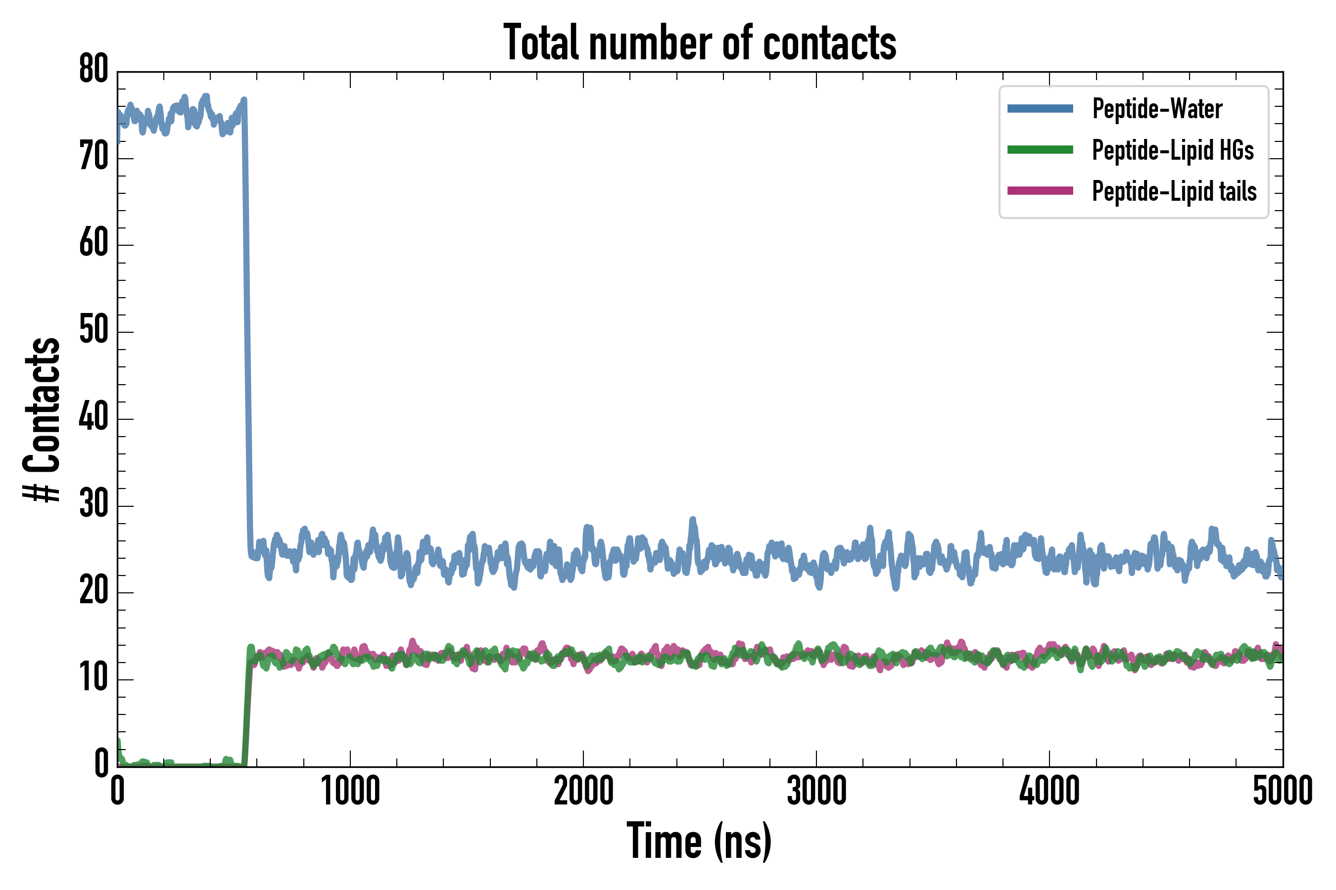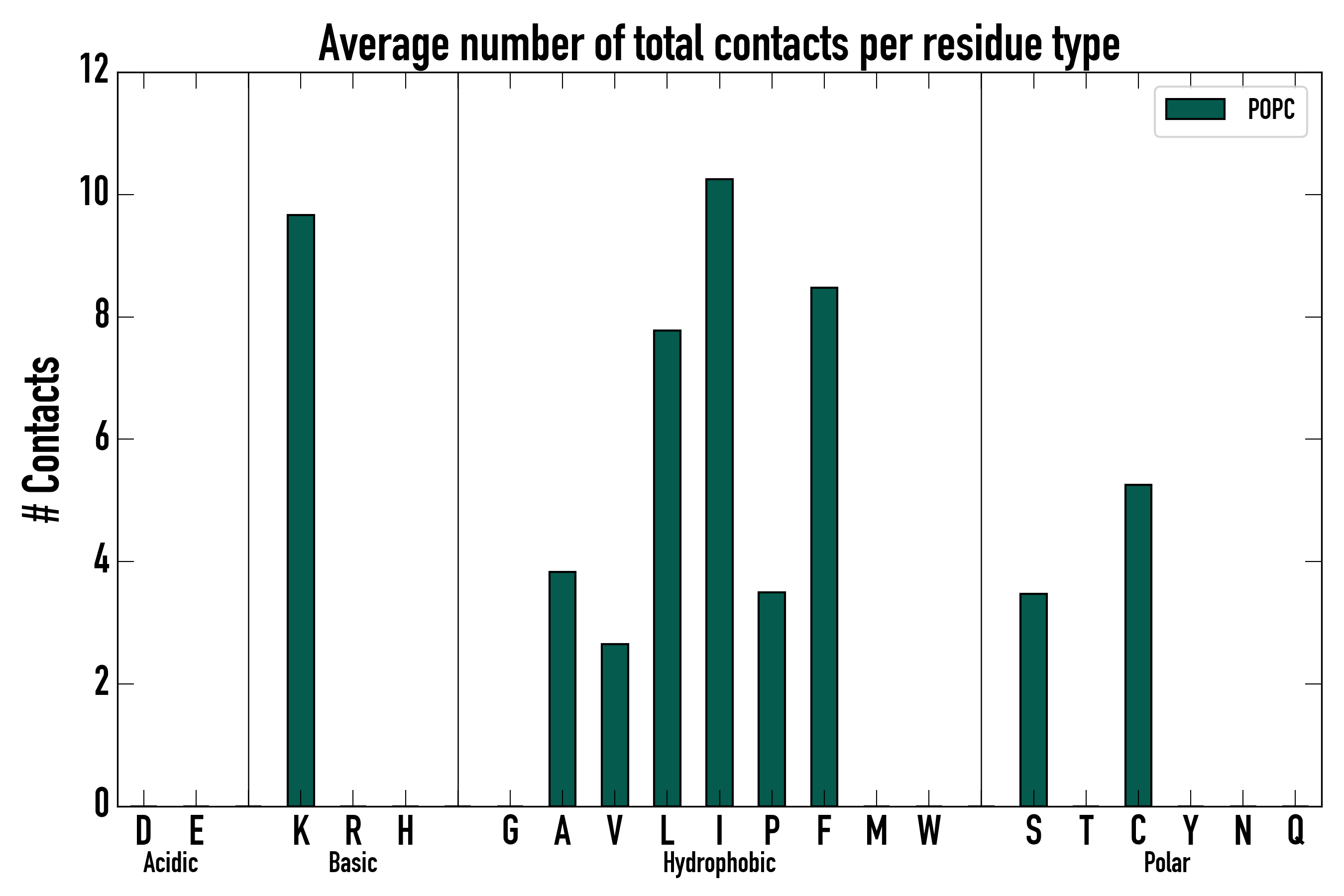 Number of contacts between each residue of the peptide backbone and the different lipid types, averaged over the last microsecond and using a cut-off of 0.6 nm.