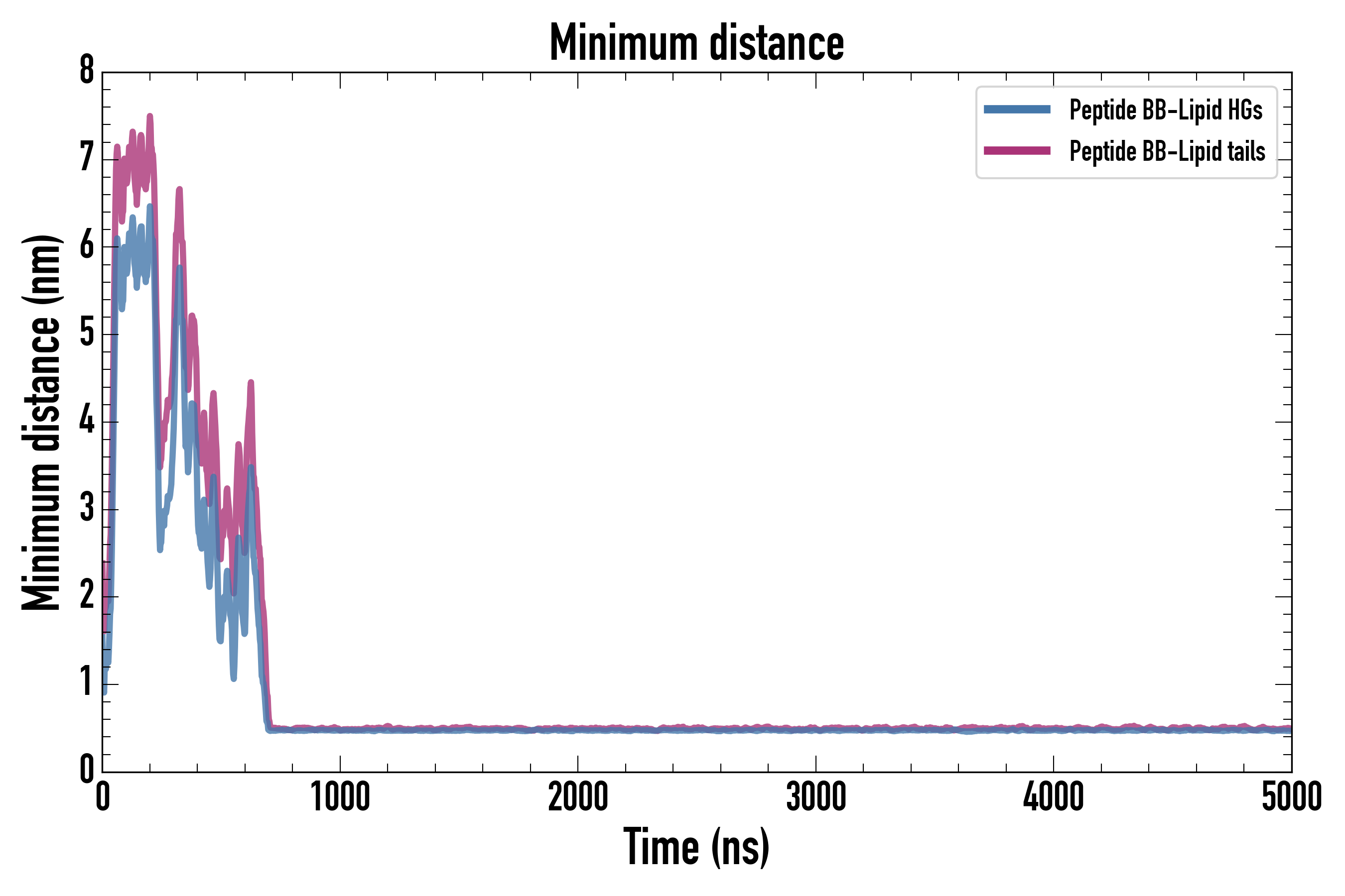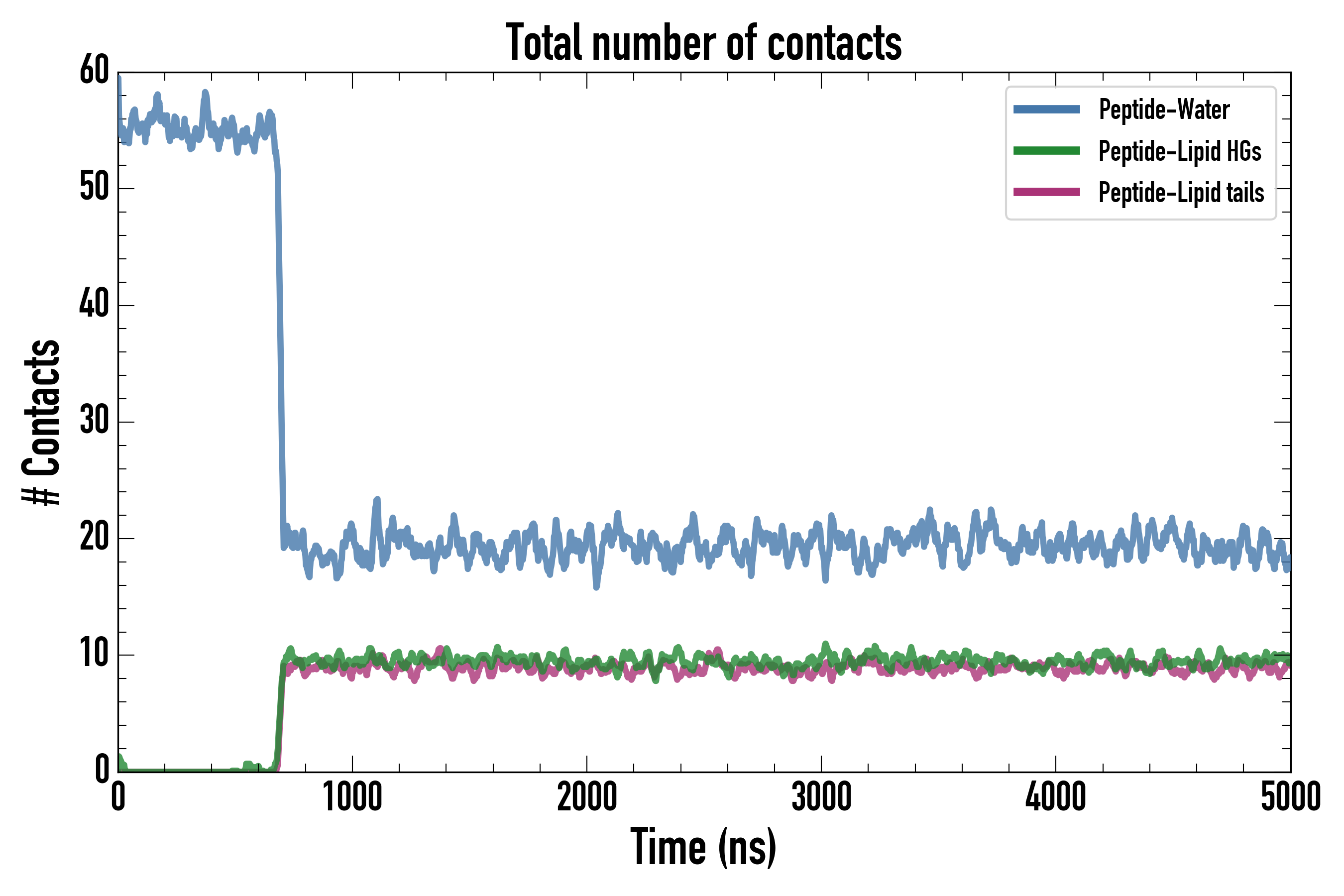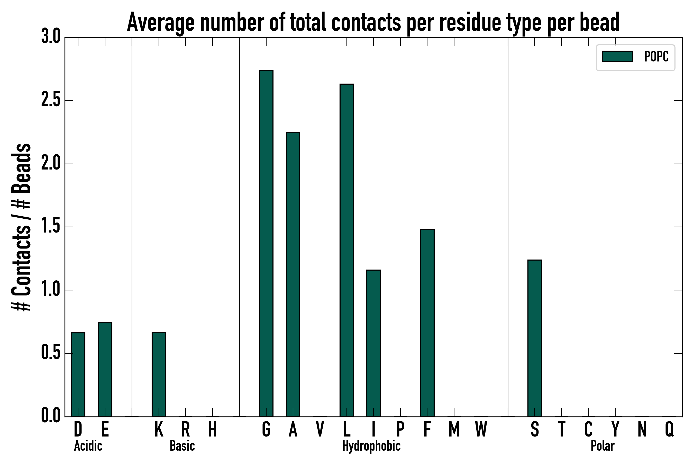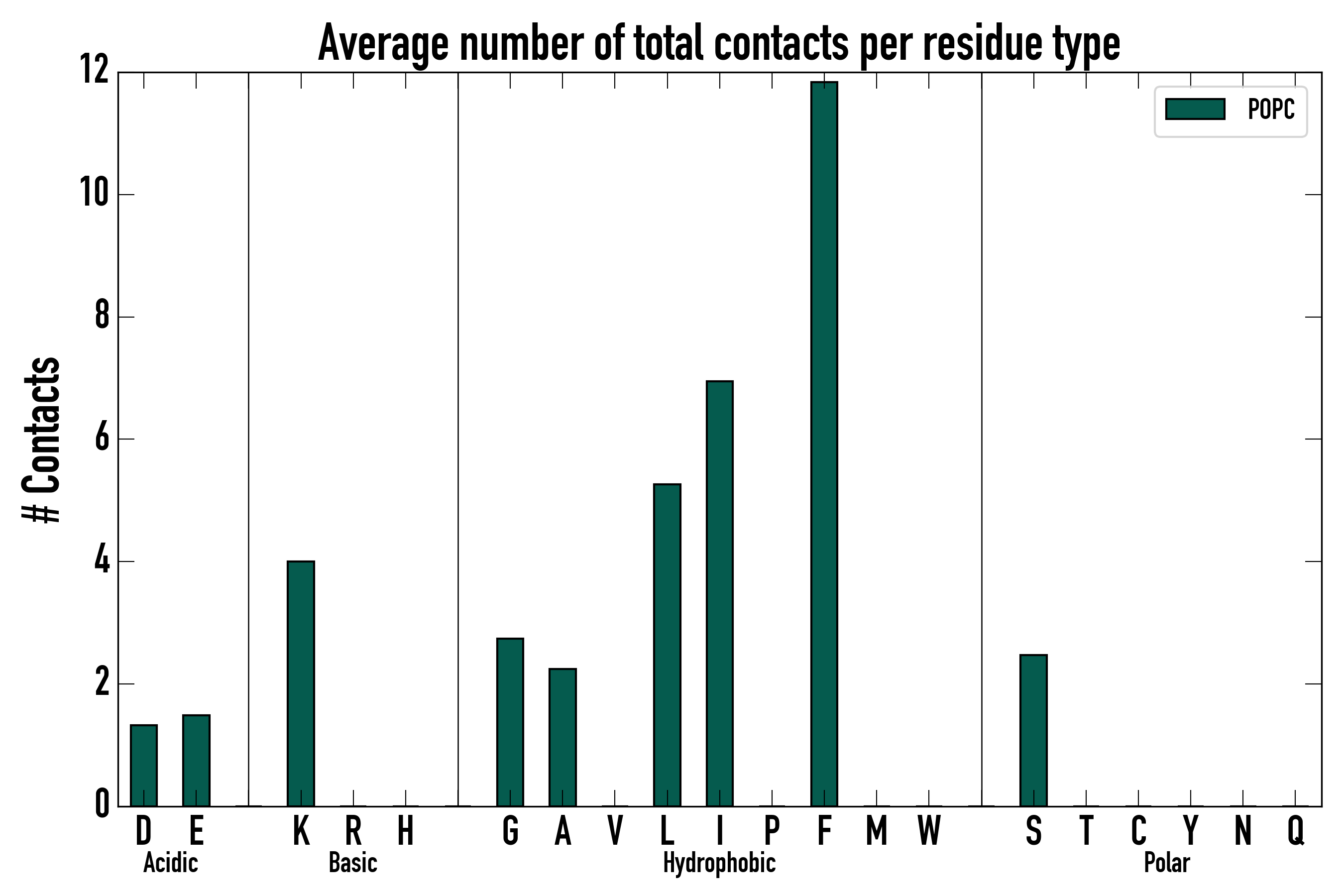 Number of contacts between each residue of the peptide backbone and the different lipid types, averaged over the last microsecond and using a cut-off of 0.6 nm.