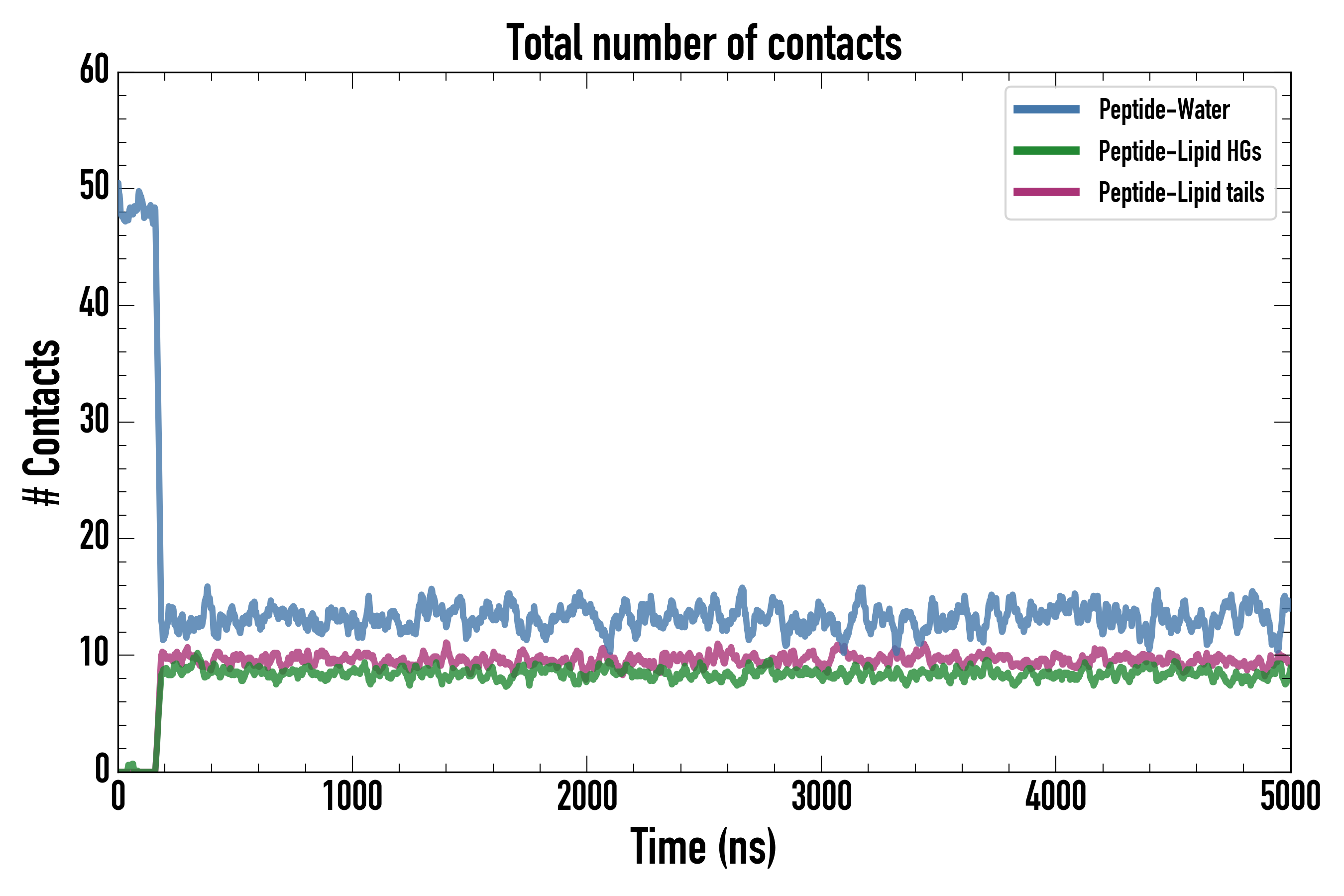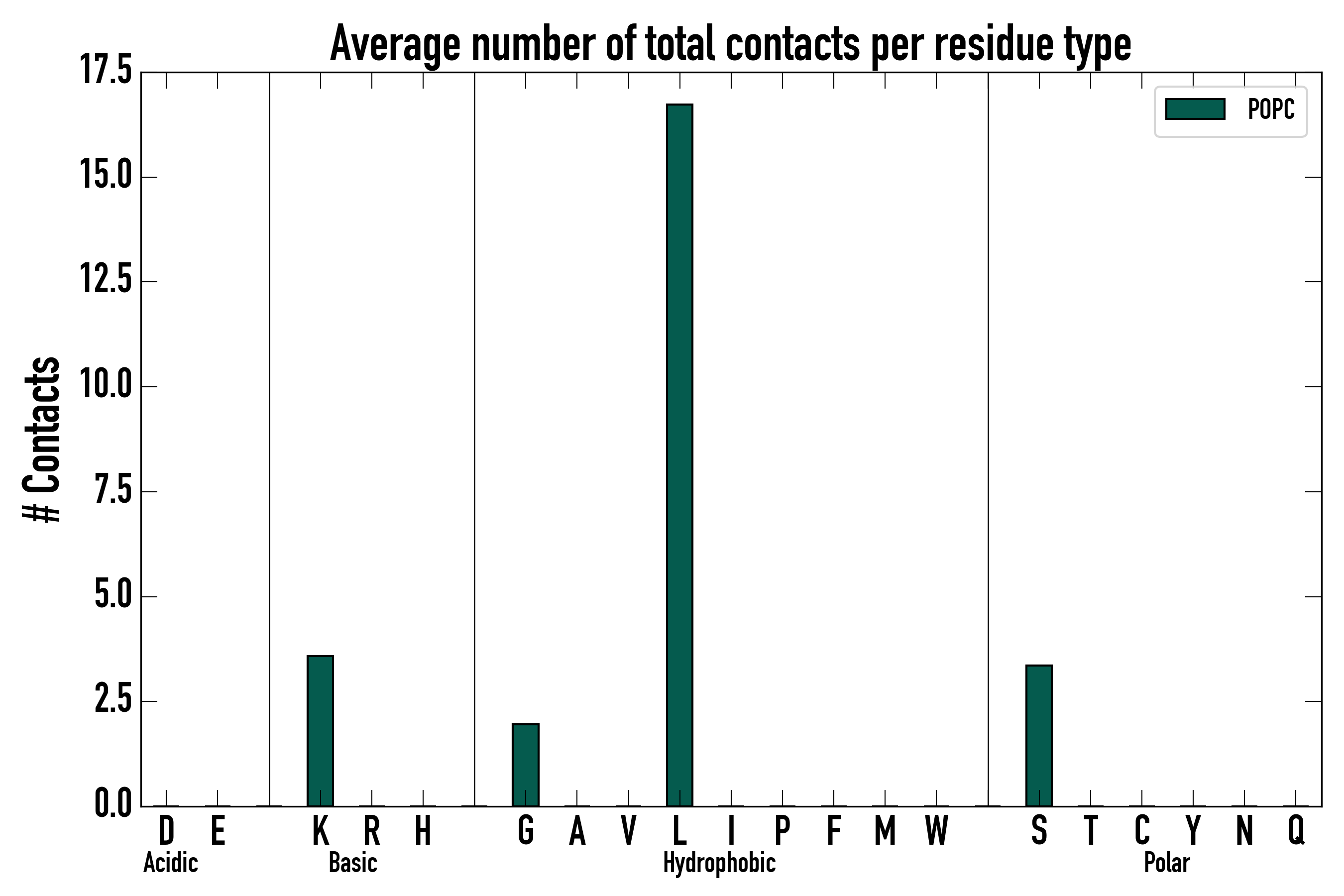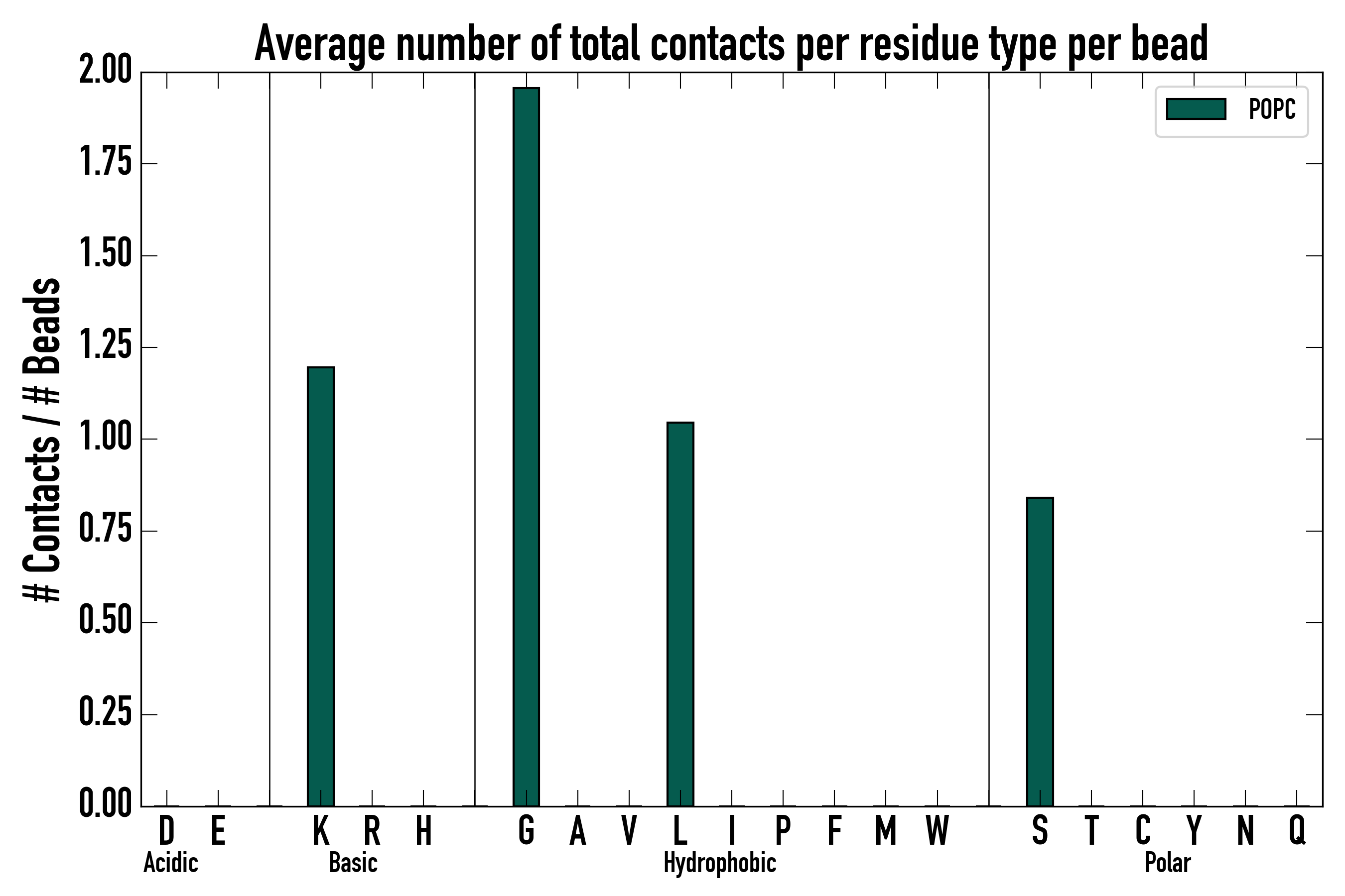 Number of contacts between each residue of the peptide backbone and the different lipid types, averaged over the last microsecond and using a cut-off of 0.6 nm.