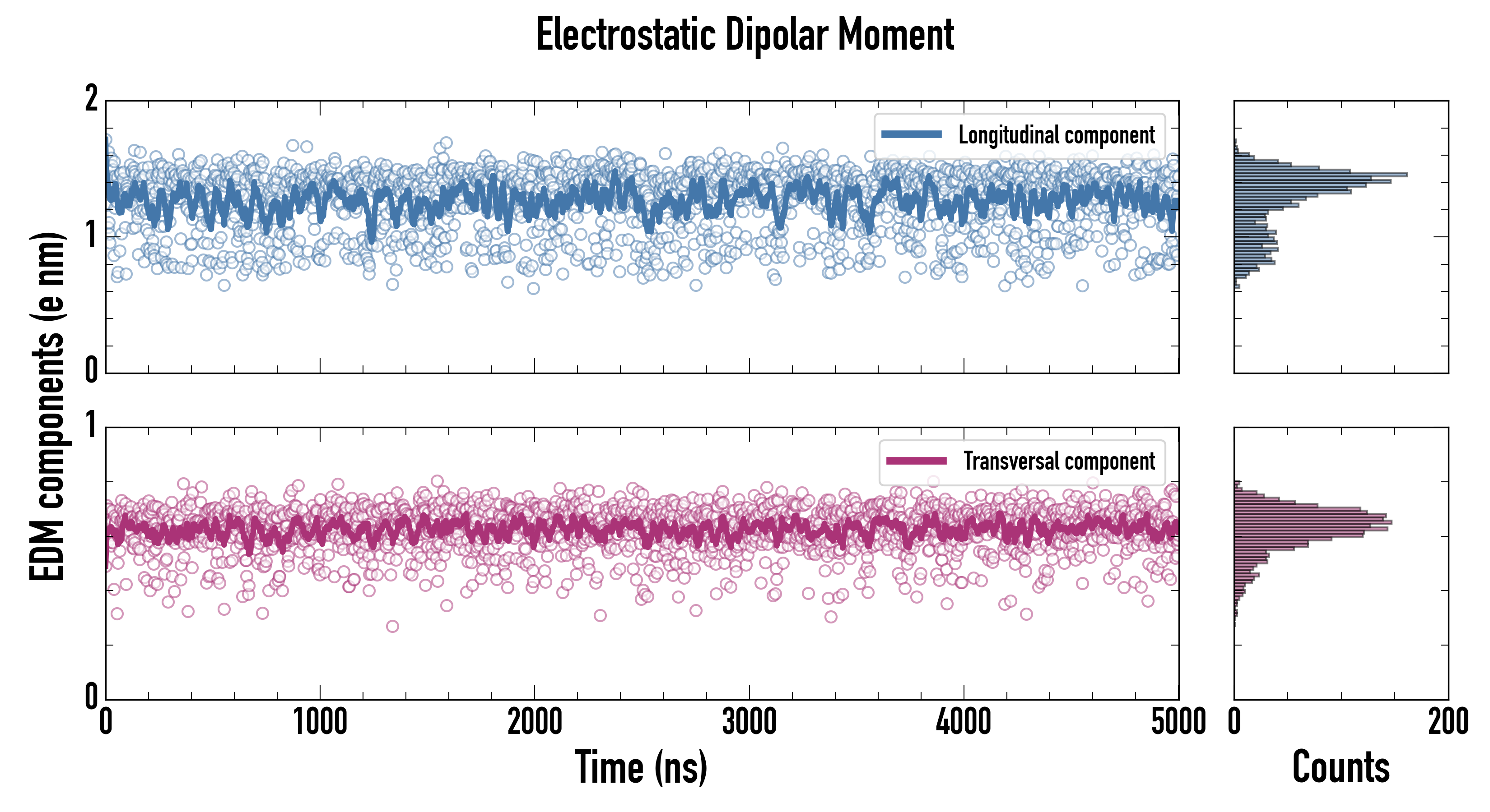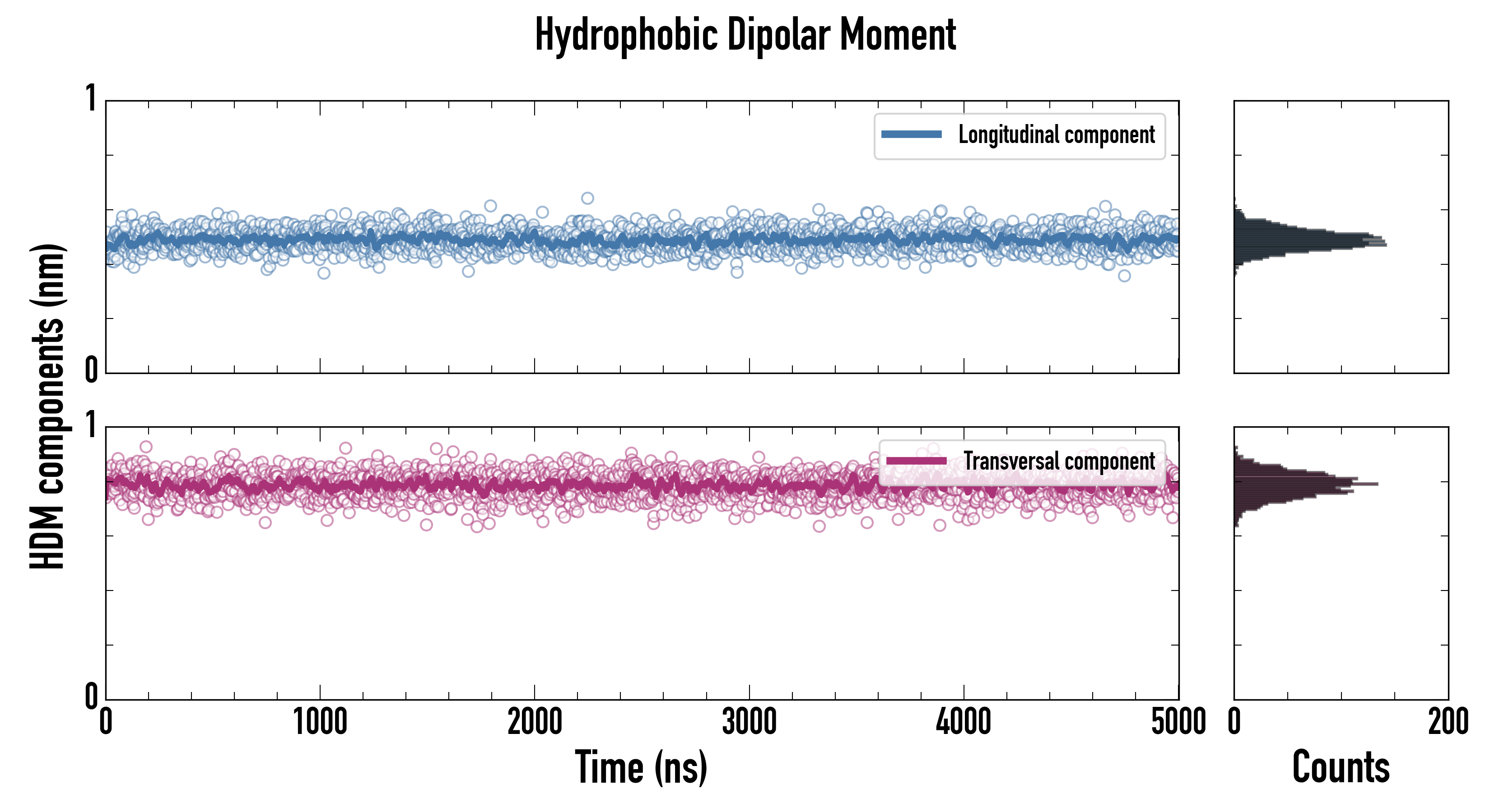 Longitudinal (e nm): 1.49 Transversal (e nm): 0.64 Hydrophobic Dipolar Moment (nm): 0.85