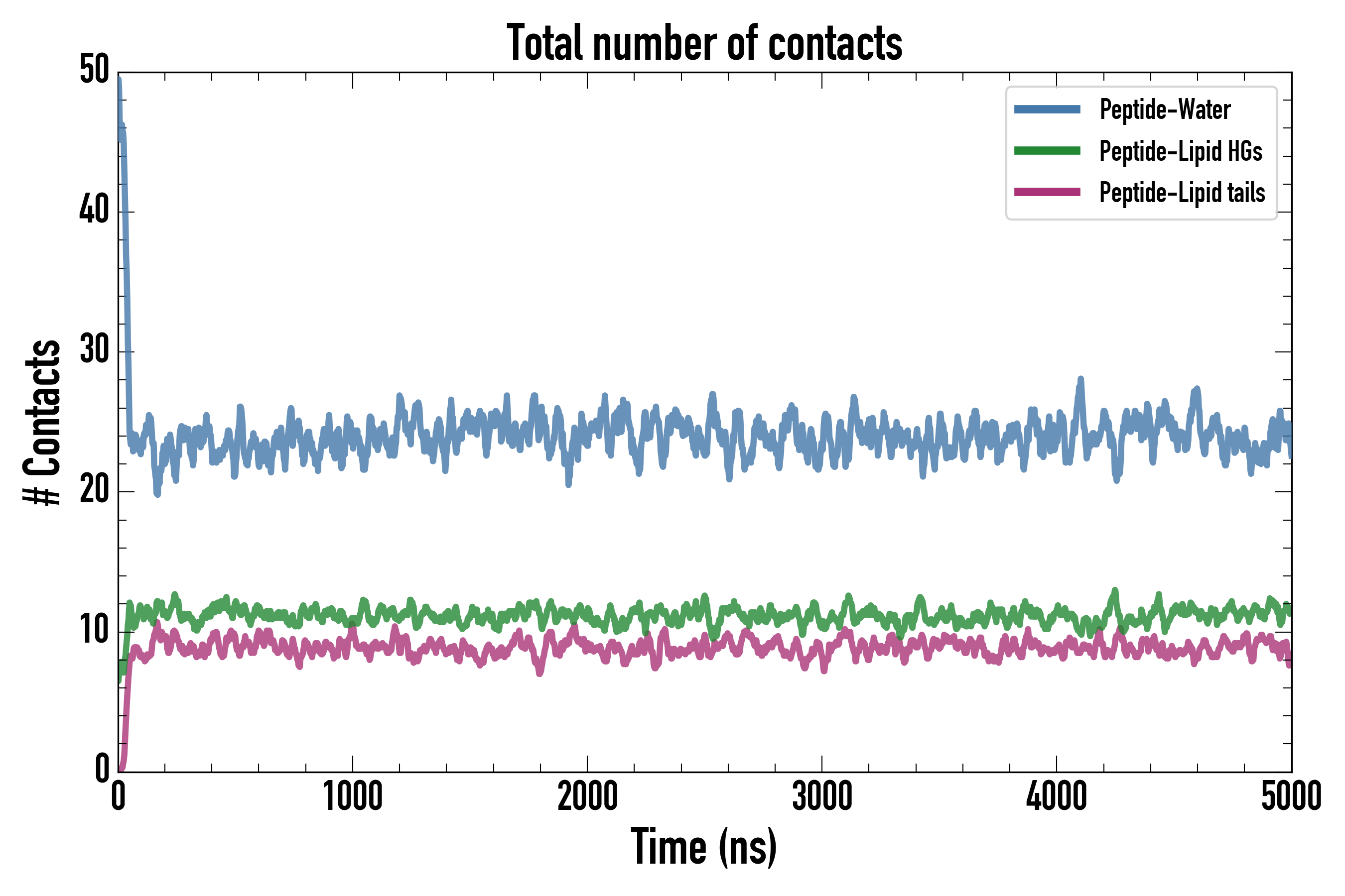 Number of contacts between each residue of the peptide backbone and the different lipid types, averaged over the last microsecond and using a cut-off of 0.6 nm.