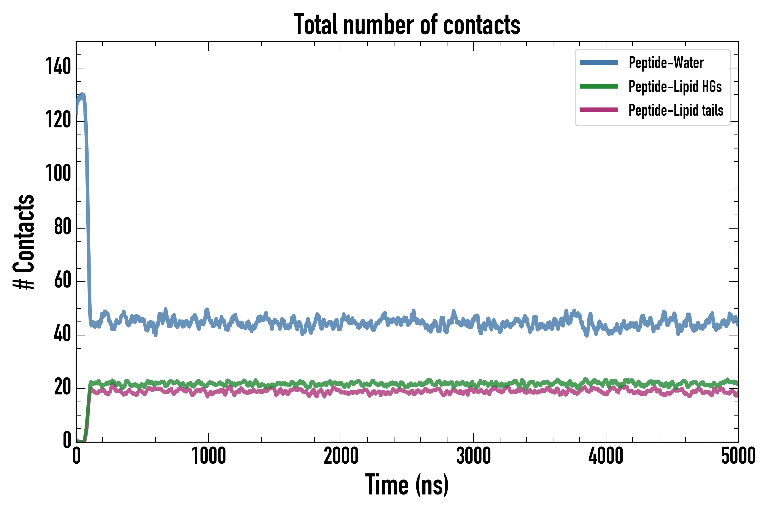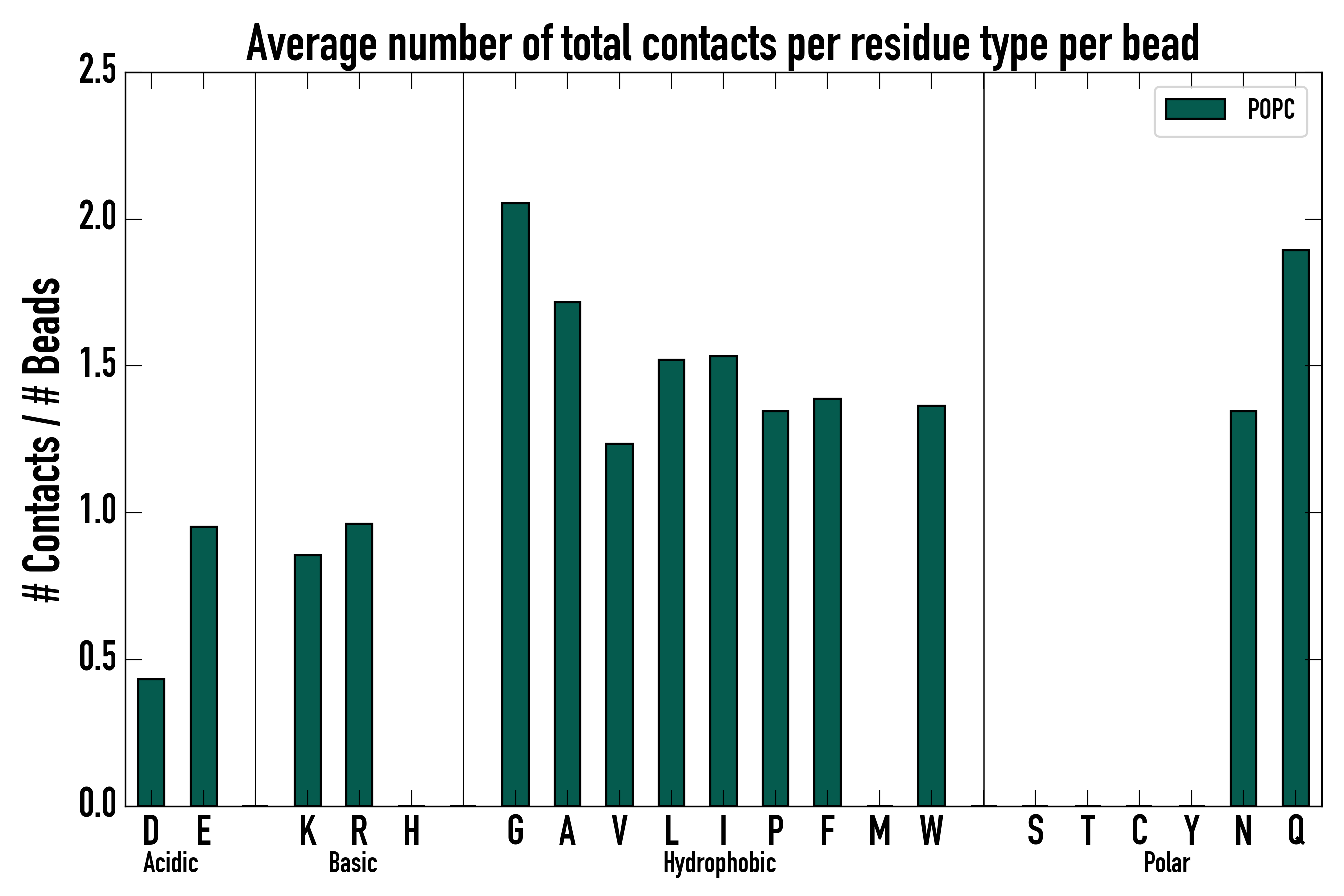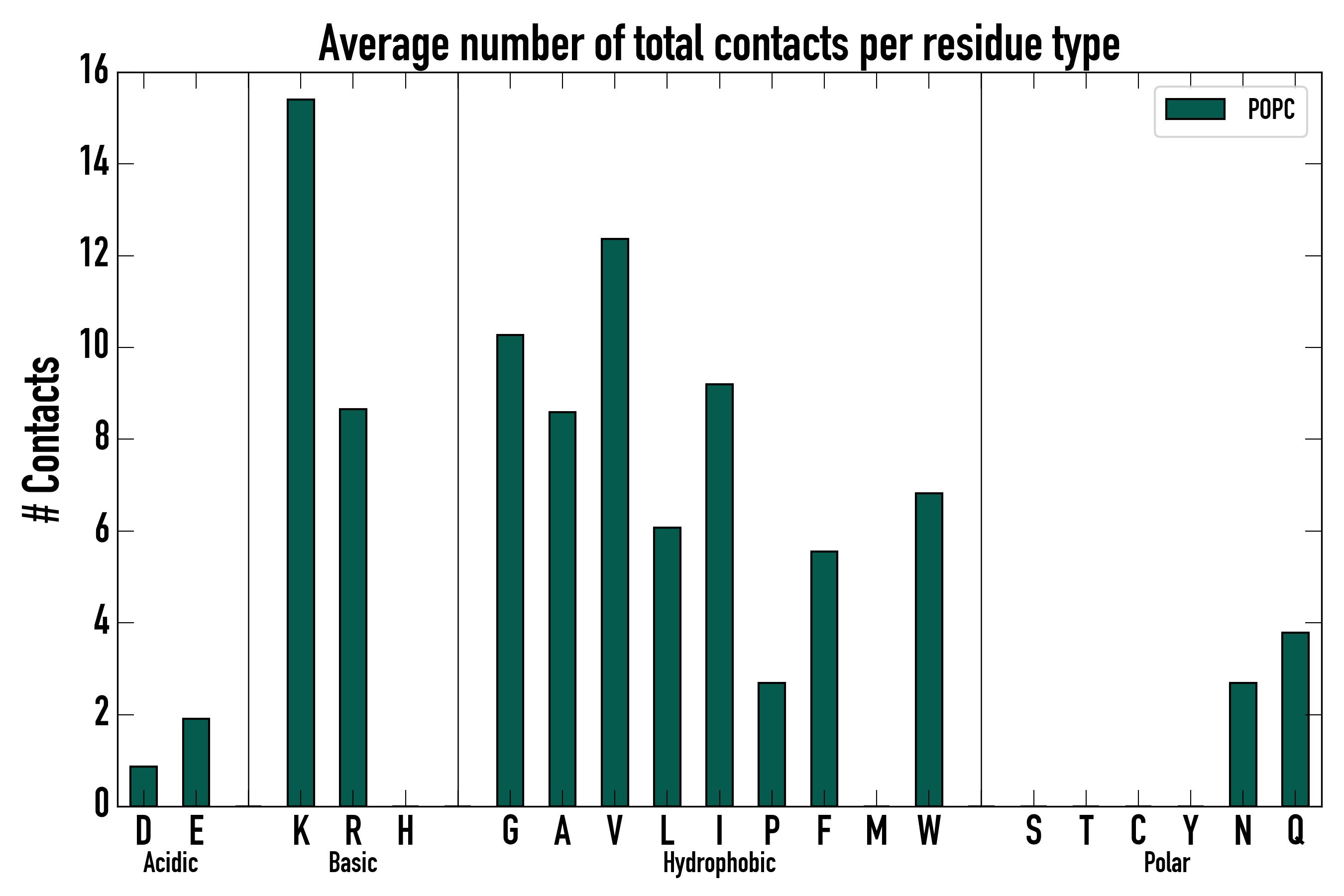 Number of contacts between each residue of the peptide backbone and the different lipid types, averaged over the last microsecond and using a cut-off of 0.6 nm.