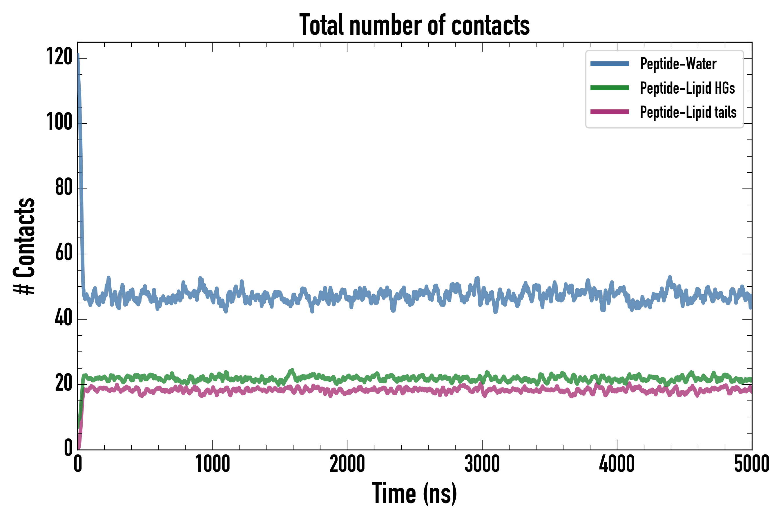 Number of contacts between each residue of the peptide backbone and the different lipid types, averaged over the last microsecond and using a cut-off of 0.6 nm.