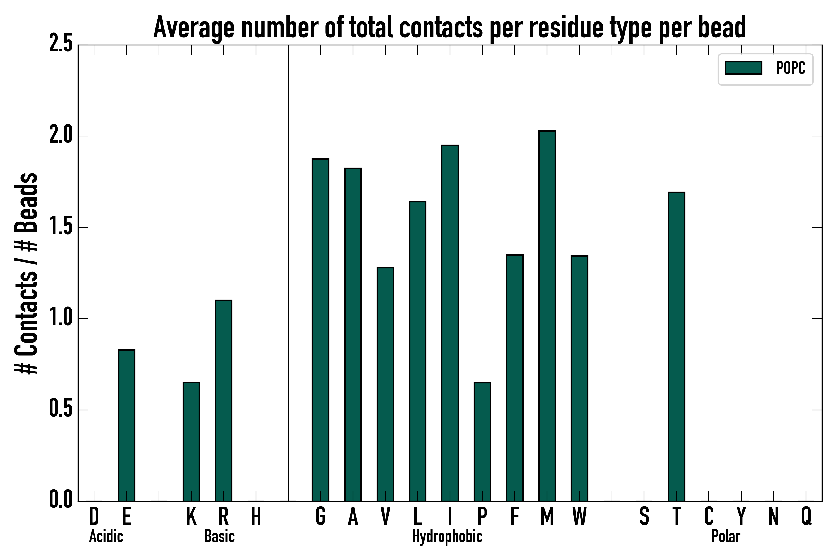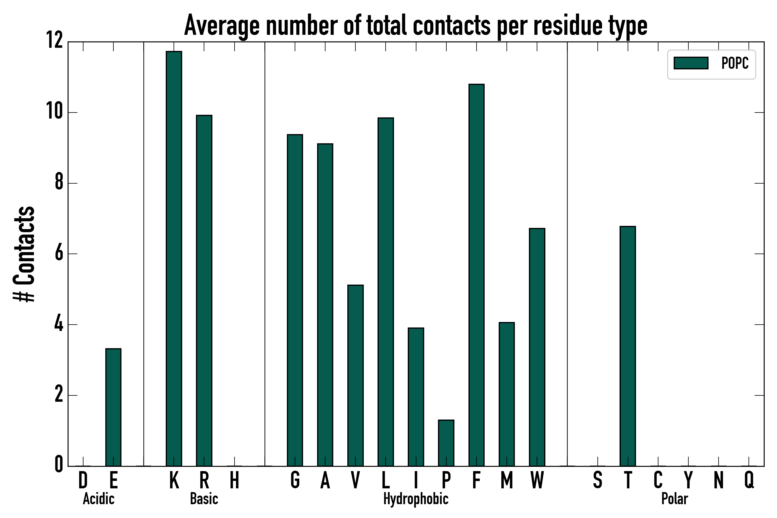 Number of contacts between each residue of the peptide backbone and the different lipid types, averaged over the last microsecond and using a cut-off of 0.6 nm.