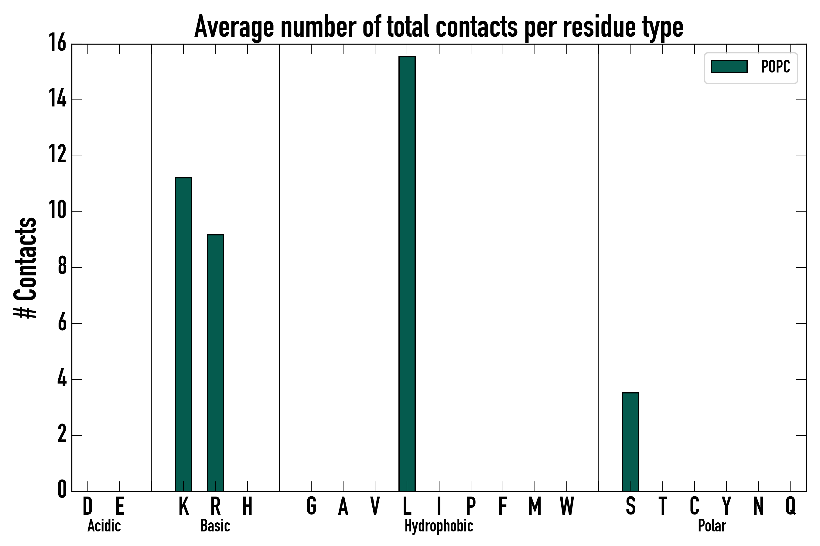Number of contacts between each residue of the peptide backbone and the different lipid types, averaged over the last microsecond and using a cut-off of 0.6 nm.